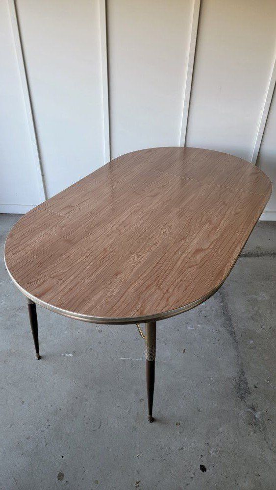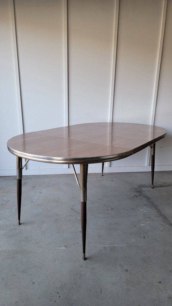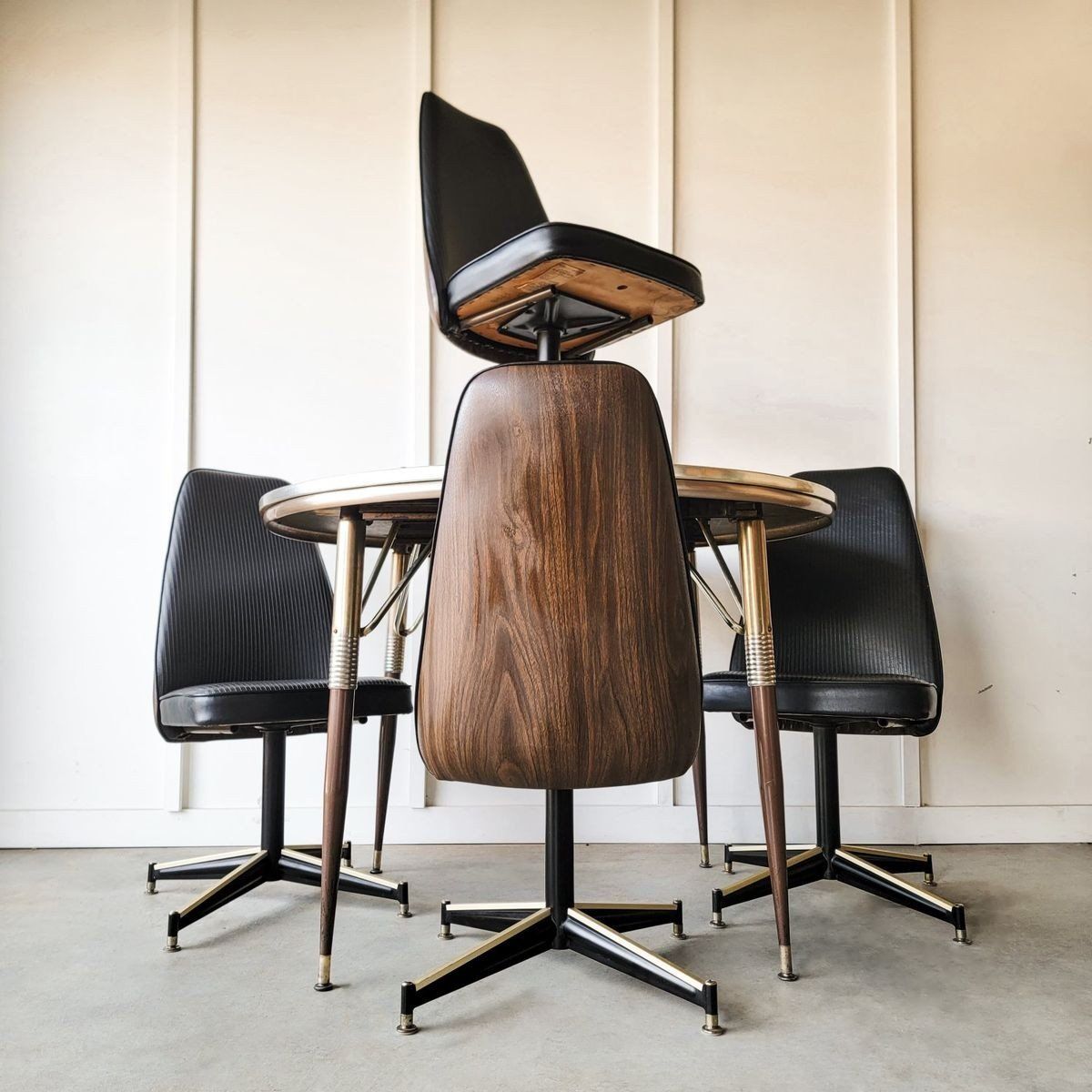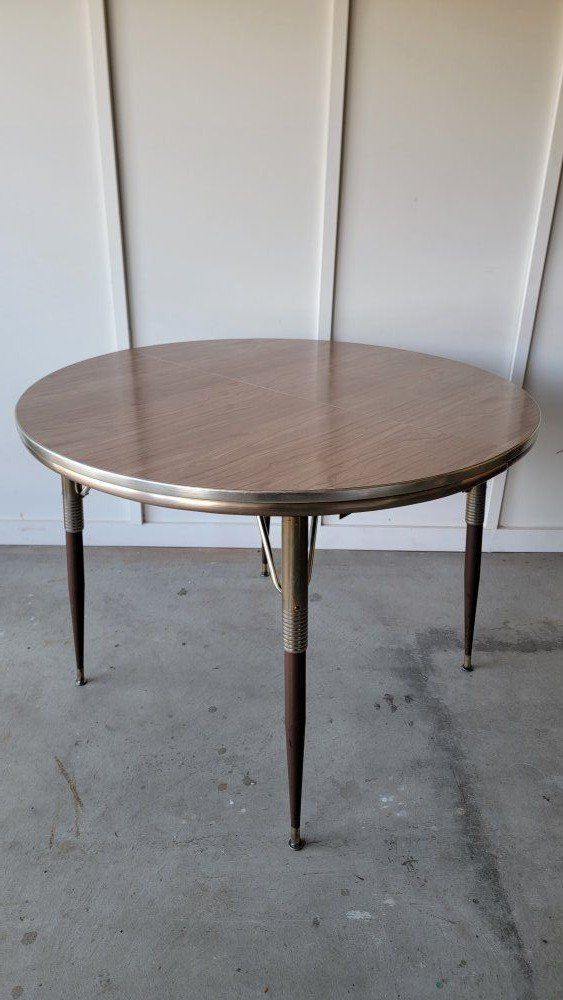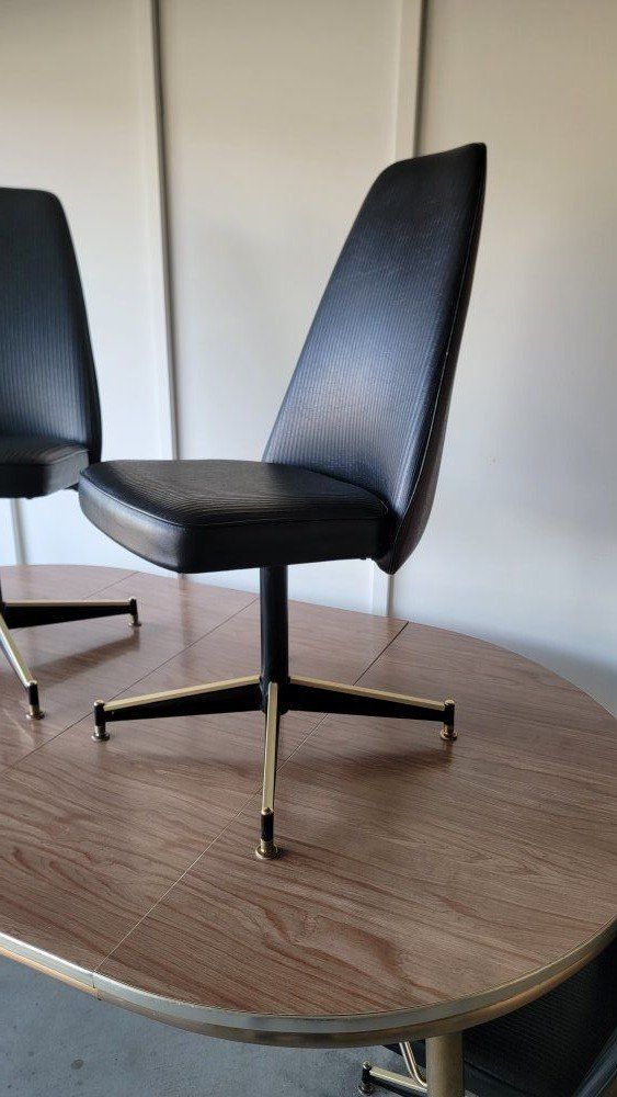 PayPalThis is seriously such a cool and unique dining set! I'm not sure about the table, but the chairs are from Cal-Style and made in the 1960's. The black chairs with gold accents are absolutely beautiful. This would add a wonderful mid century modern touch to any space! It can be a small circular table for small spaces, and extends to nice larger size. Don't miss out on an awesome vintage set!