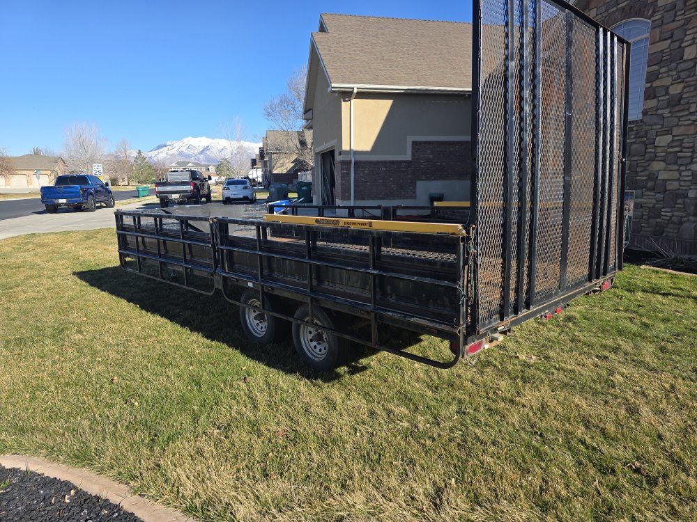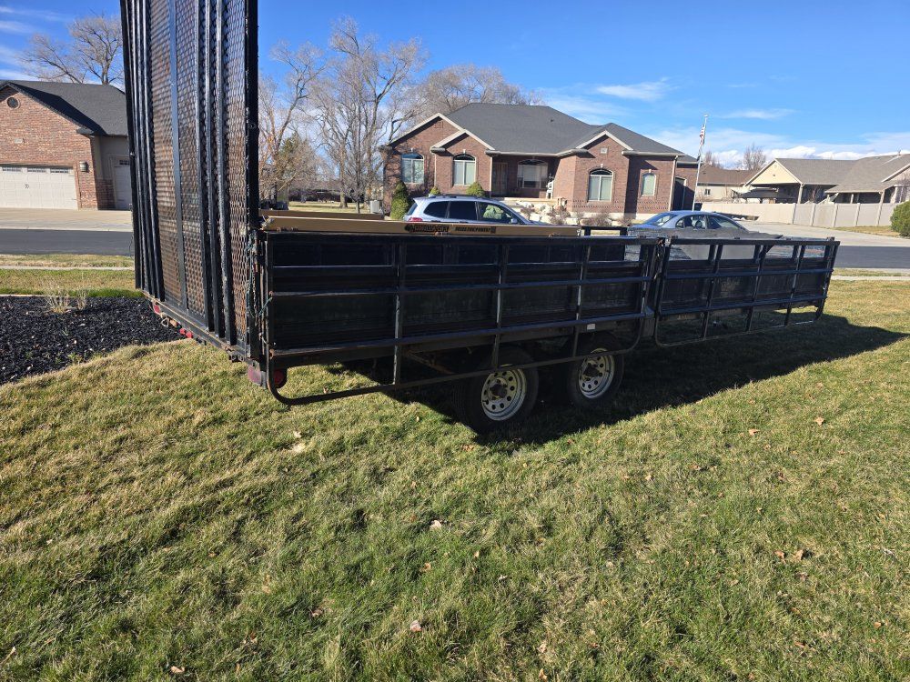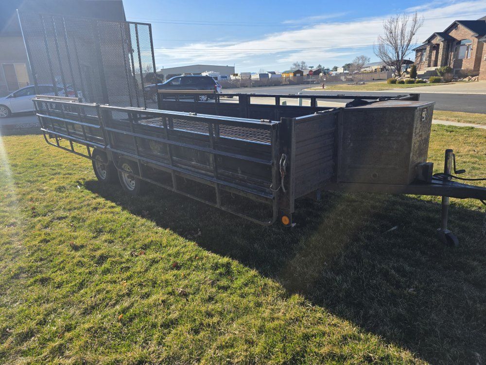 Venmo17 foot atv trailer has brakes and gorilla lift to help with gate. both sides come down for ramps. there is a box on the front. I need a trailer with lower sides open to trades.
