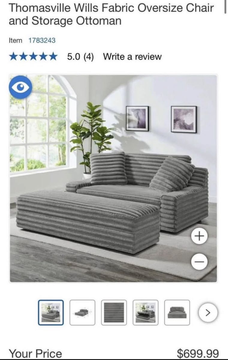 WHY YOU WILL LOVE THIS CHAIR... Meet the Thomasville Wills Ultra Soft Large Corduroy Oversized Chair, where style meets unparalleled comfort. This trendy chair, wrapped in ultra-soft corduroy fabric, is designed for ultimate lounging. Its oversized build invites you to sink in and unwind. Accompanied by a versatile storage ottoman, which doubles as a lounger, this set offers both style and function. With a large reversible back cushion and two oversized pillows, every detail is crafted for your comfort.