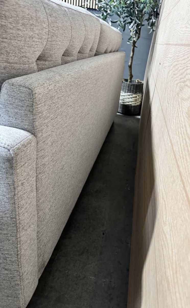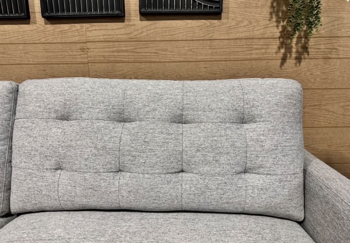 Features: Sofa Extends for a Lounge Option Modern Silhouette with a Mid-Century Feel Tufted Back Cushions Add Style and Comfort Tapered Legs in a Warm Brown Finish Upholstered in a Soft, Neutral 100% Polyester Fabric.