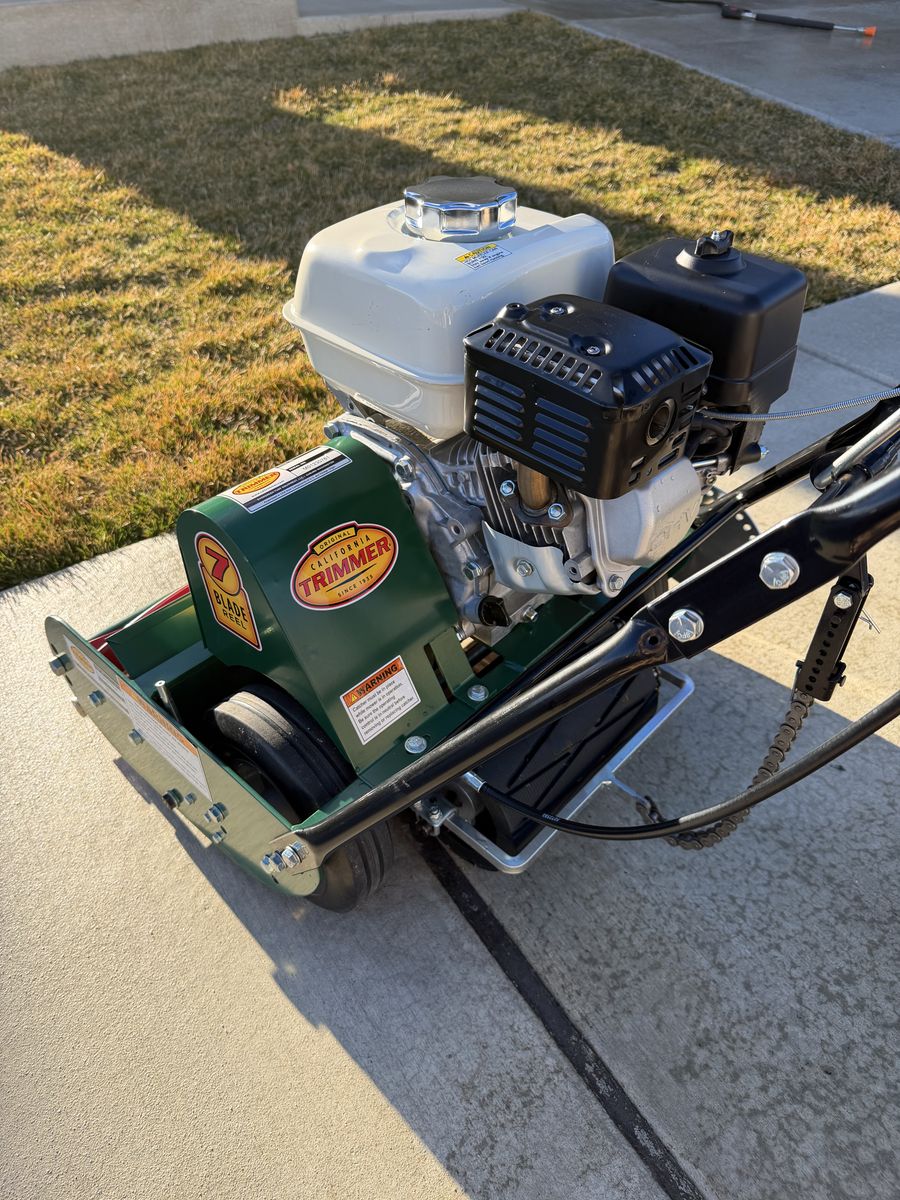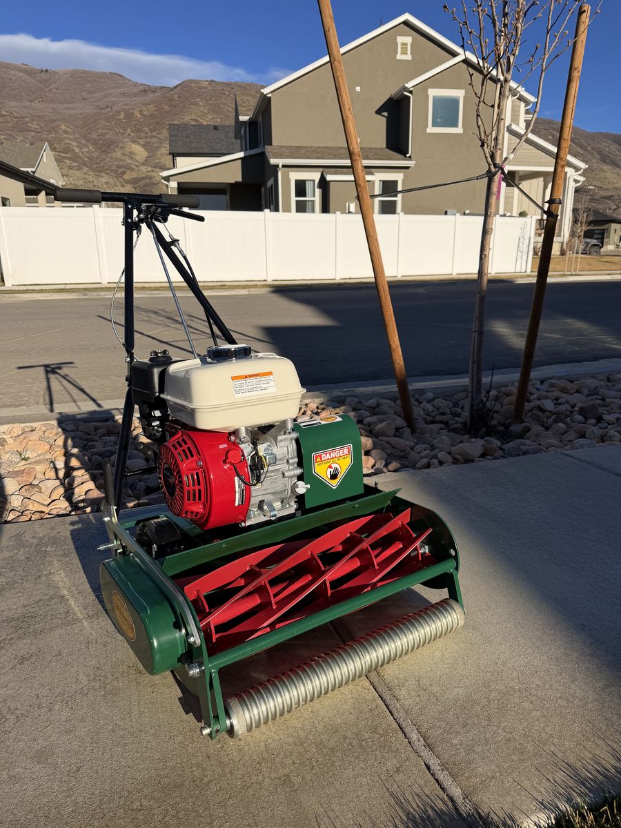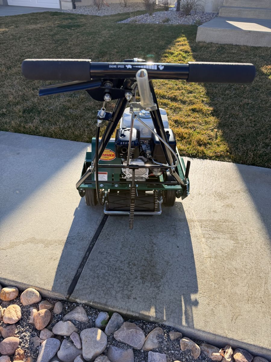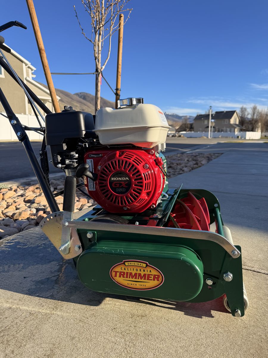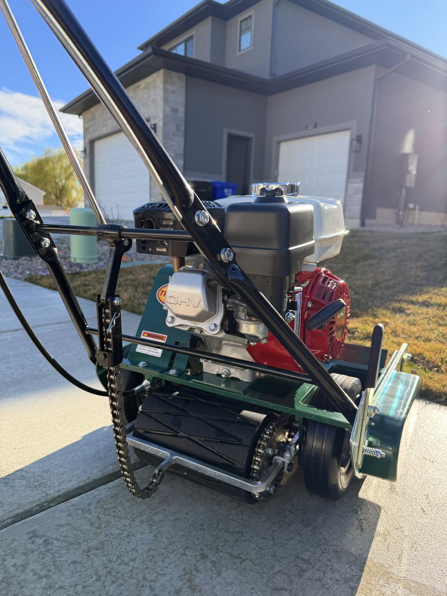 Retails new for $1,830 The gold standard in residential reel mowers. Like-new condition. • Honda GX160 engine (commercial-grade, 4.8 HP) • Self-propelled, 7-blade reel, grooved front roller • Cuts 3/8” – 1 7/8” — ideal for golf course quality lawns • Produces a clean scissor-cut vs. the tearing action of rotary mowers • Backlapping kit included (unused) — grinding compound, sprocket adapter & stand (~$80 value) • No grass catcher Local pickup only, Centerville UT. DM with questions.