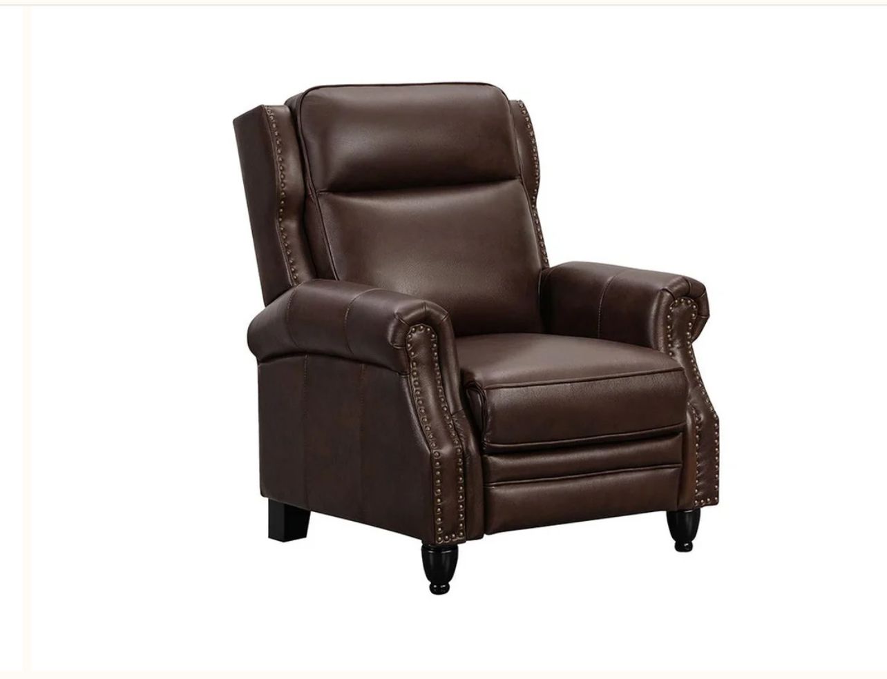 Includes: One (1) recliner Upholstery Materials: Top Grain Leather on all seating areas Upholstery Materials: Leather Match on sides and back Upholstery Color: Red, Blue, or Brown Style: Traditional 2.0 High-density foam cushions Seat Comfort: Semi-firm but comfortable Hands-free, smooth-operating pushback functionality Antique-brass nail-heads along arms and back frame Wood legs are finished in a rich espresso finish Sinuous wire spring construction Kiln-dried, furniture grade engineered wood frame Corner braced and blocked in all key joint areas Elastic webbing suspension system for even weight distribution in the frame Entire frame is padded and encased with foam Seat and back cushions are sewn-in and non-removable Assembly Required Weight Capacity: 300 lbs See Less See Less See Less See Less See Less See Less See Less See Less See Less See Less