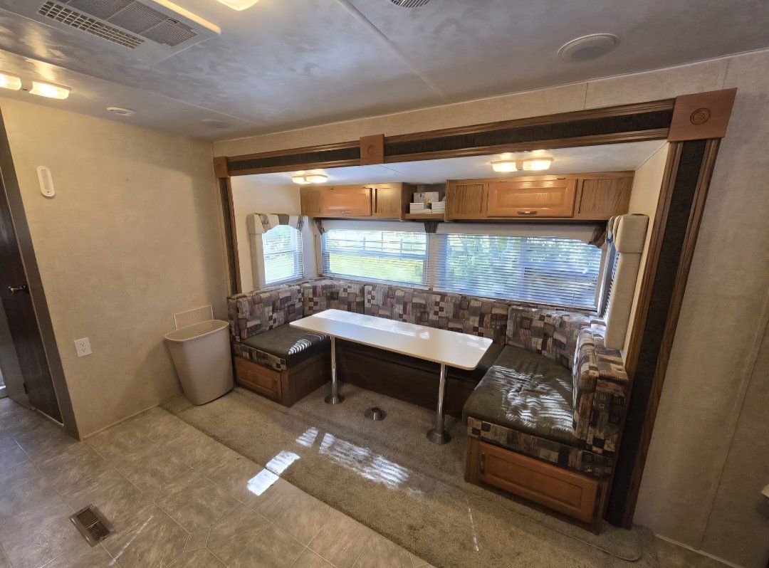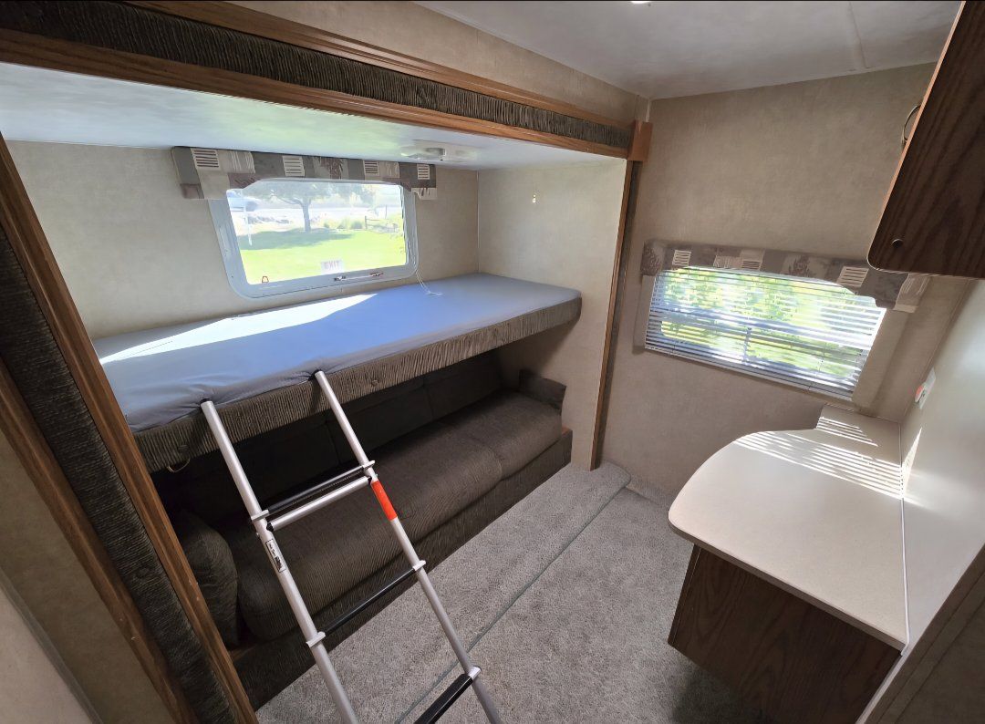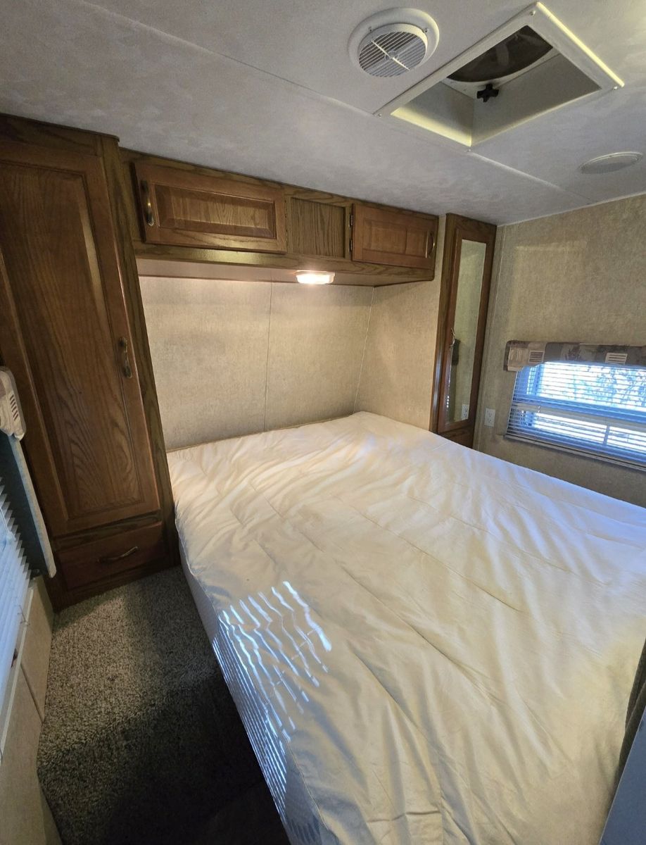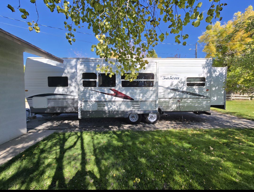 Bunkhouse trailer. 2nd owner. 2 slides. Unique, rear bunk room pop-out. Dinette pop out. Sleeps 7. Lots of cupboard storage inside. Large pass-through storage outside. Outside shower. Always been stored in a shed. Title in hand.