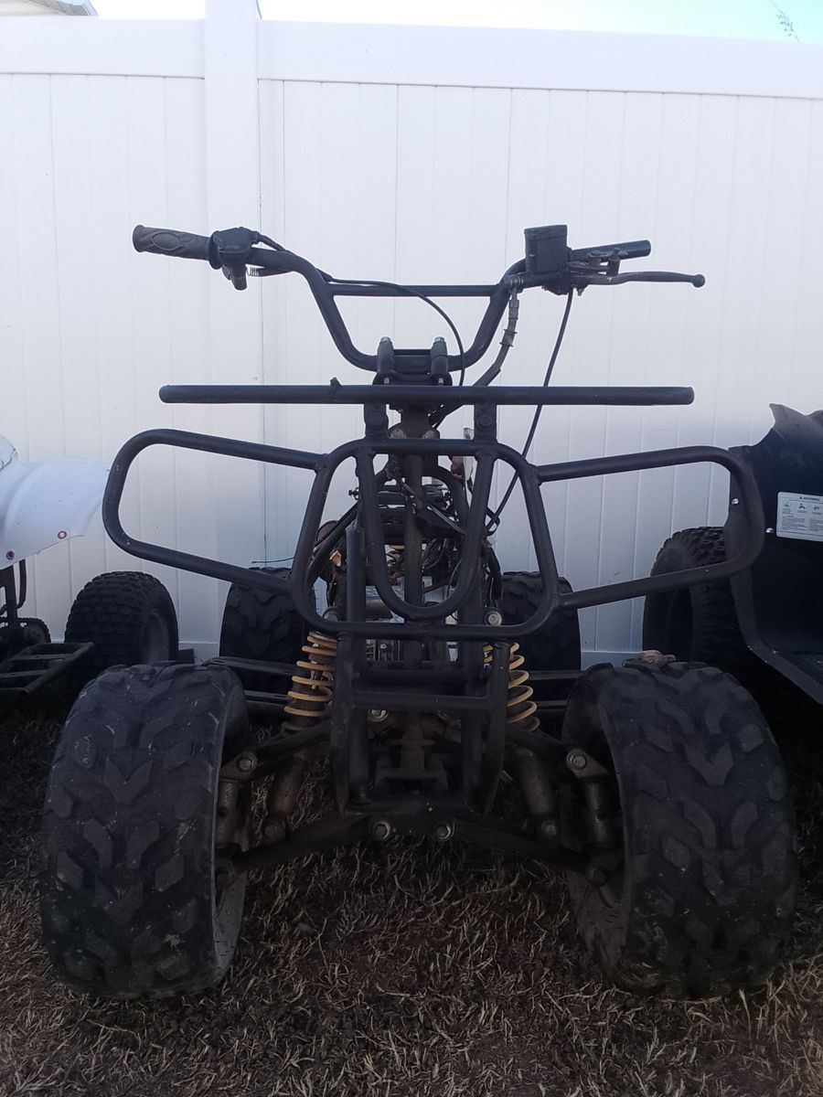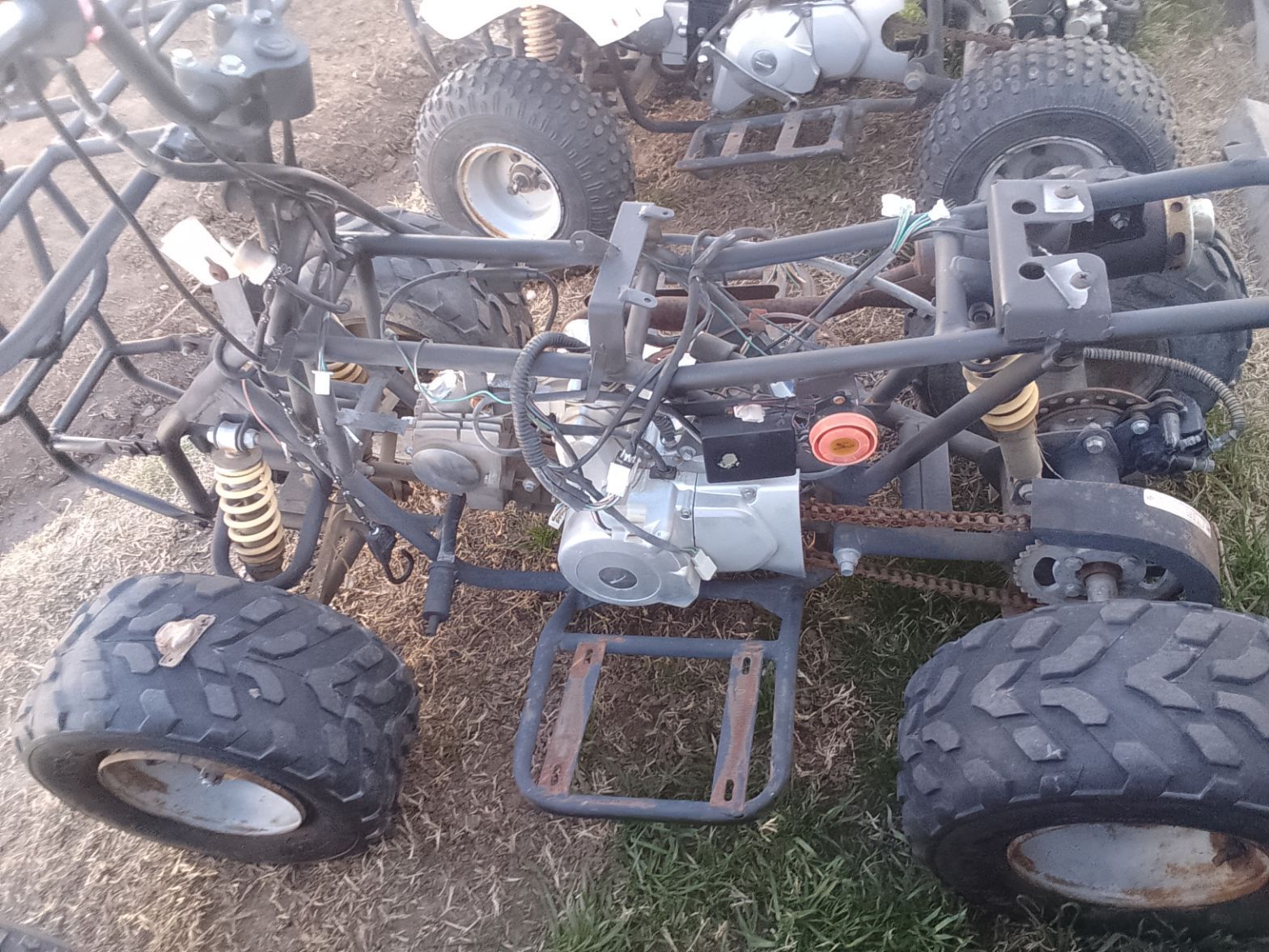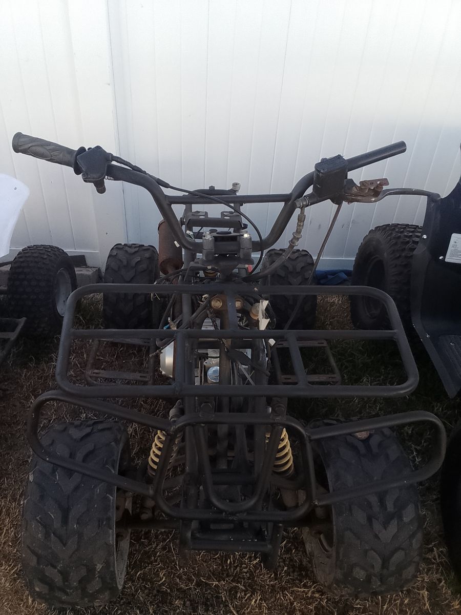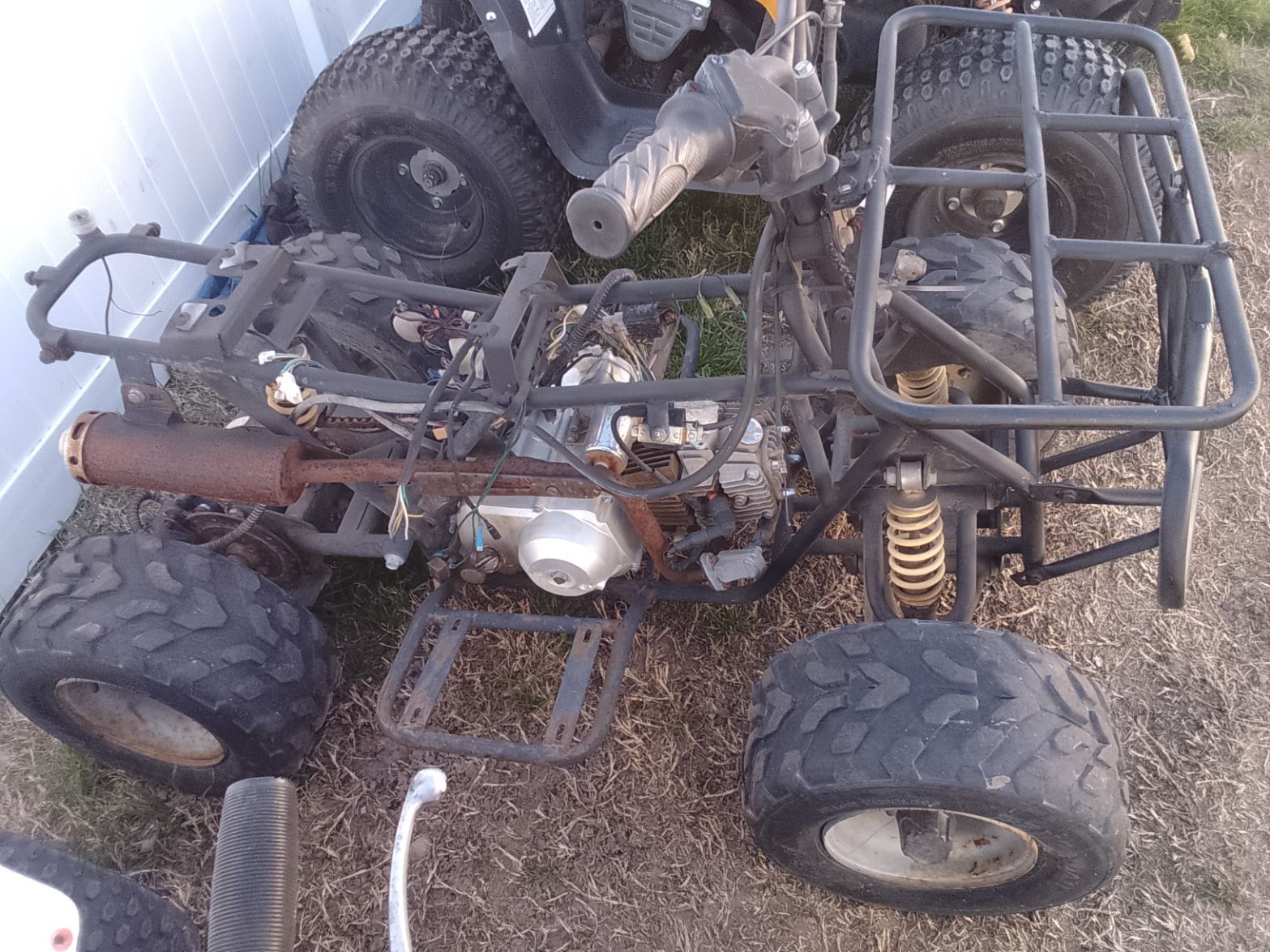 Zelle110cc–125cc class (TaoTao/Coolster/SSR style). Engine turns over, no battery, likely wiring/issue preventing start. Missing seat, plastics, rusted exhaust. Frame solid, tires hold air, shocks/suspension intact, chain drive working.