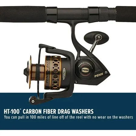 PENN BATTLE 7' FISHING ROD AND REEL COMBO KIT: Featuring a high-performance spinning combo paired with a spare anodized aluminum spool and durable neoprene reel cover, PENN Battle kits comes with everything you need to haul in saltwater game fish SUPERIOR CONSTRUCTION: 1-piece, graphite composite rod offers a durable and break-resistant yet lightweight tool for any angler. 8 aluminum oxide guides provide a durable solution to the heat and tension of stressed lines. RECOVERY RATE: Recovers at the rate of 36"|91cm with every turn of the crank. Gear ratio of 5.6:1. Full metal body, side plate and rotor with a heavy-duty aluminum bail wire offer exceptional durability. HT-100 FRONT DRAG with a max drag of 25lb|11.3kg. HT-100 carbon fiber drag washers let you pull in 100 miles of line with minimal wear. Mono capacity yd/lb: 225/12 200/15 135/20. Braid capacity yd/lb: 420/20 300/30 240/40. 6 TOTAL BEARINGS: 5+1 stainless steel ball bearing system with an instant anti-reverse feature is ideal for conquering big saltwater game fish. HIGH-PERFORMING POWER AND ACTION: 12 - 20 lb line rating, Medium Heavy power, Moderate action, and a lure rating of 1/2 - 1 1/2 oz. ROD HANDLE CONSTRUCTION: Full Grip EVA handle is made for Right/Left handed anglers. THE PENN PROMISE: No matter where you fish or what you fish for, look to PENN for dependable performance, now and in the future.
