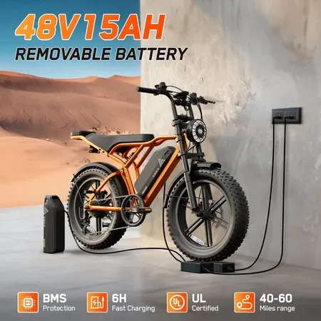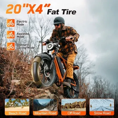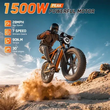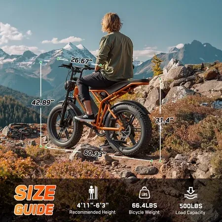 E-Bike Highlights: Orbital Sports APP ecord every trip you make. 750W Peak 1500W powerful motor, 48V/15Ah battery, maximum driving speed up to 28-32MPH. 20" x 4.0" Fat tire Ebike. Double suspension makes your journey easier. Super strong beam headlights illuminate the road ahead. Tech Specs: Motor: 750W Peak 1500W Brushless Gear Hub. Battery: 48V/15AH Lithium-ion (UL 2849 certified). Max Speed: 28-32MPH (PAS Mode). Range: 70 -100 Miles (PAS Mode). Charging Time: 4-6 Hours. Tire: 20" x 4". Ebike Size: 64.9" x 26.6" x 45.9". Suggested Rider Height: 4'11"-6'3". Torque: 90N.m. Sensor: Cadence Sensor. Brakes: Mechanical disc brakes. Throttle: Throttle on demand. Gears: 7-Speed Shimano. Display: LCD. Max Load: 450 lbs. Pedal Assist Level: 0~5 Level Pedal Assist. Frame: Aluminum Alloy. Weight: 71.87lbs (Including Battery). How to unlock the bicycle speed limit: 1. Download the Orbital mobile app. 2. Launch Ebike. 3. Log in to the app, turn on Bluetooth, and connect to Ebike via Bluetooth using the app. 4. Unlock Class 3. Why Choose This E-Bike? Faster – Cut travel time with 32MPH speed. Ride Farther – 60-100 mile. Ride Smarter – Phone app tracks every journey. Super Shock Absorption – Powerful double shock absorption makes your riding more comfortable.