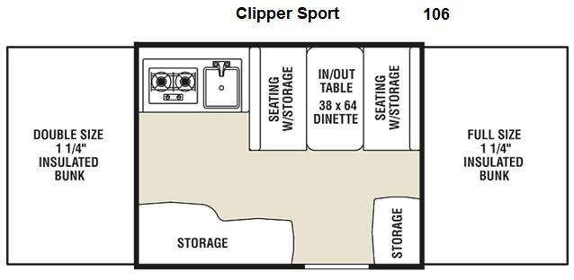Inside, the kitchen area includes a two-burner cooktop, sink, countertop workspace, and storage cabinets for camping gear and cookware. Many models in this series include options such as a three-way refrigerator or furnace, giving you the flexibility to camp comfortably in a variety of weather conditions. The Clipperâs simple setup, durable tent materials, and aerodynamic design make it a popular choice for local getaways, state parks, and weekend camping trips.