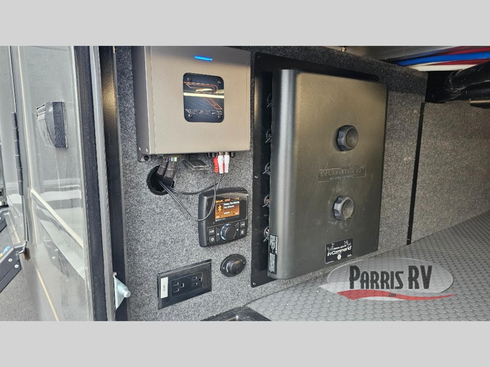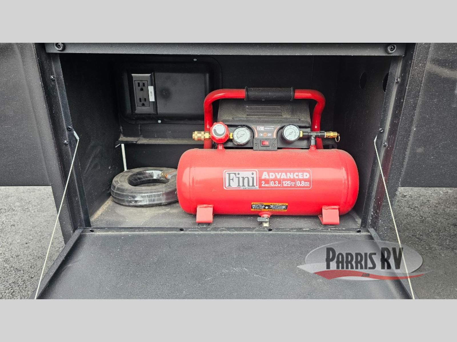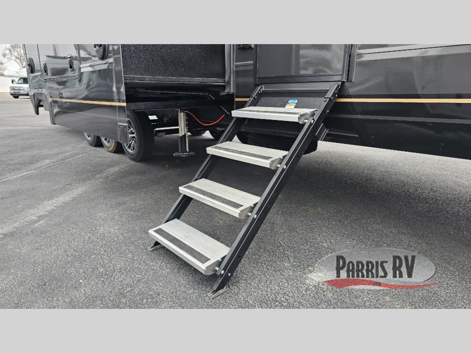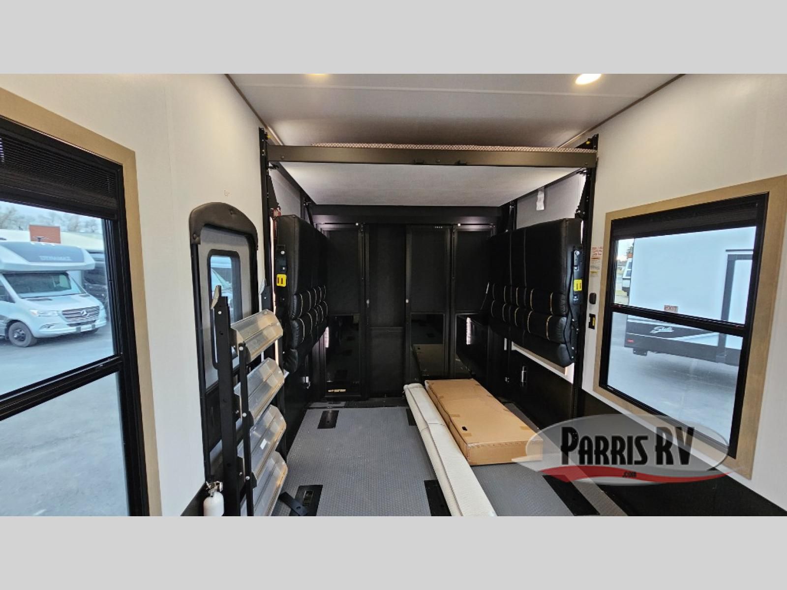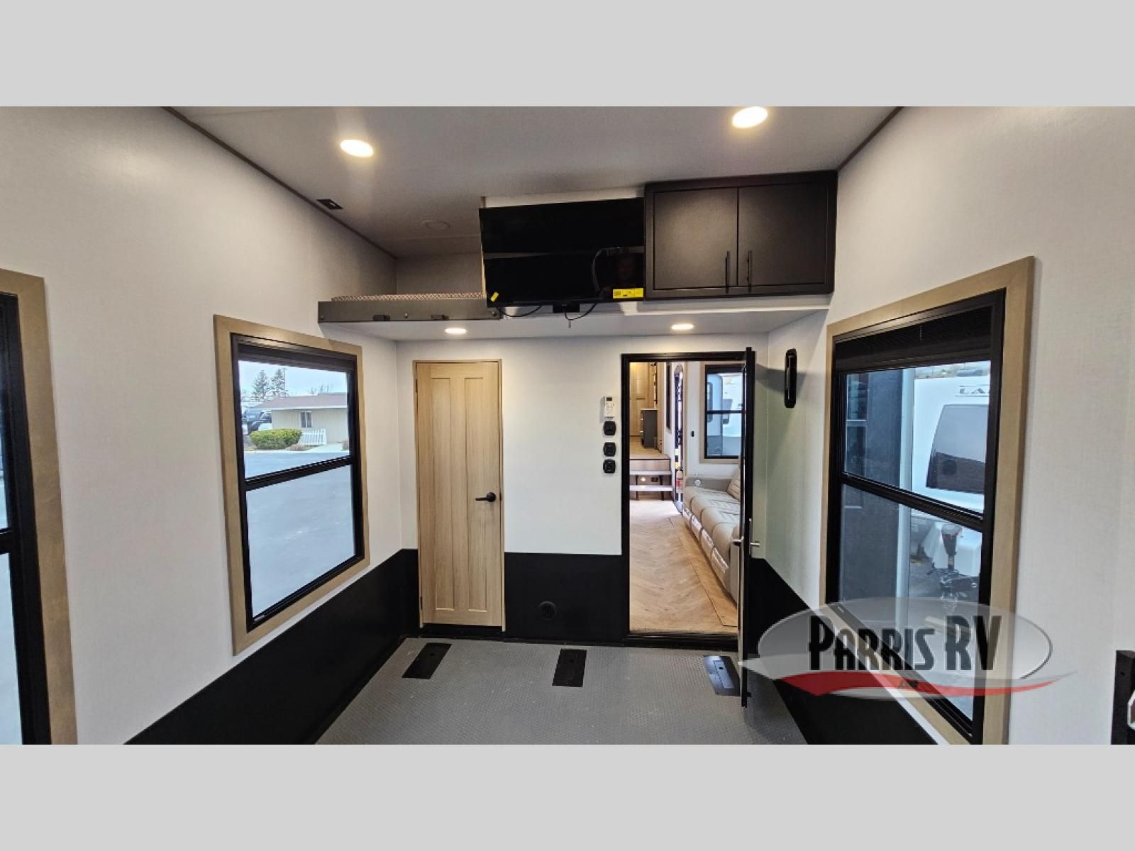 You will have everything you need for a comfortable camping trip and then some with this toy hauler! Load your toys into the 16' garage area with the Lippert Power Play motorized ramp door and secure them with 5,000 lb. frame welded tie-downs. The garage also has an electric bed above dual opposing sofas with a loft with a twin bed and a half bathroom. Create your best meals with the four-burner cooktop and enjoy the company of others sitting at the kitchen island with three bar stools while you prepare it. Relax in true comfort on the 4-seat recliner across from the entertainment center with a fireplace. When you're ready to wind down your nights, take a hot shower in the full bathroom then head directly into the front private bedroom which features a king bed suite with a large front wardrobe for clothing storage, and washer/dryer prep in case you wish to add appliances so you can wash your clothes while you are away!