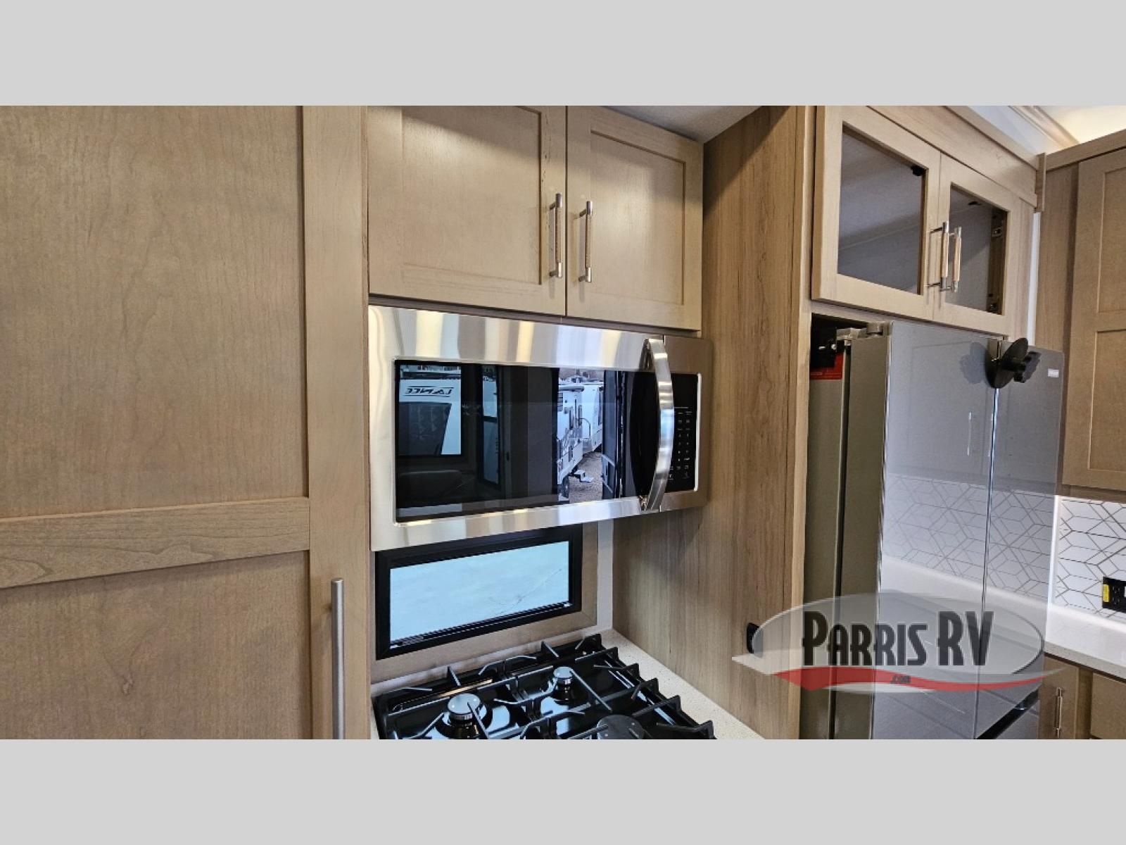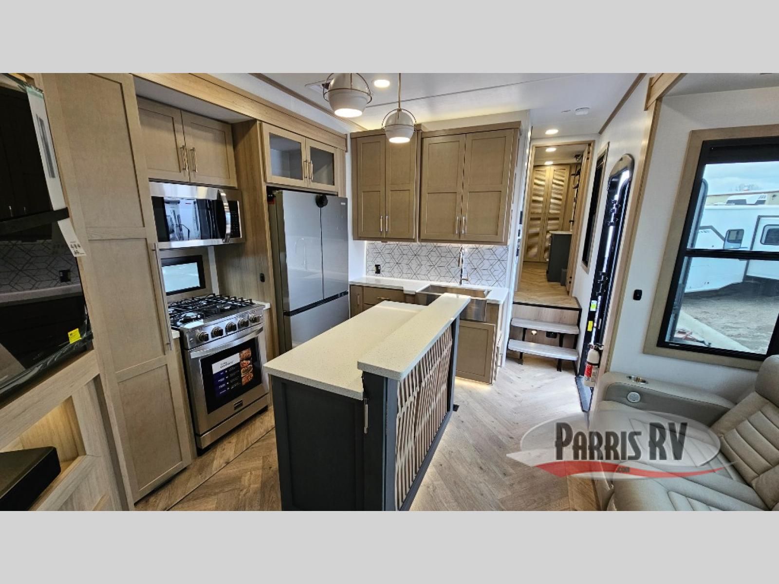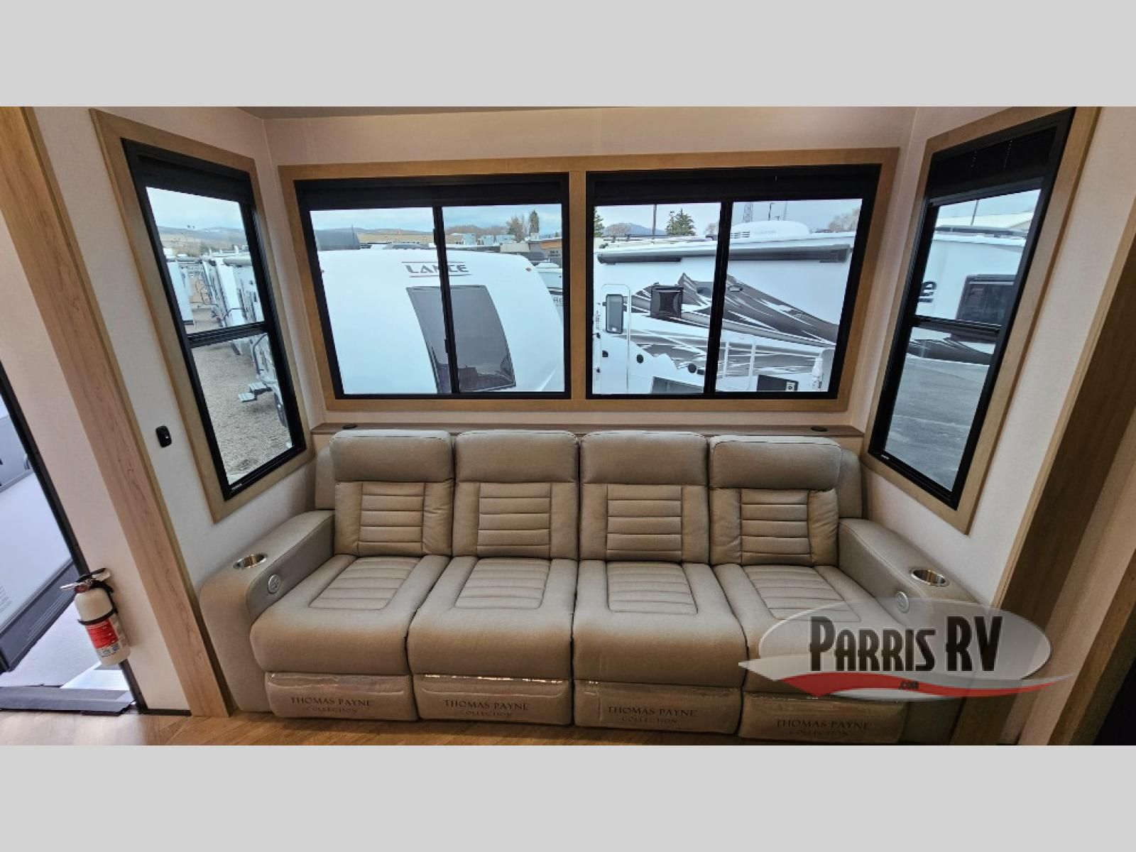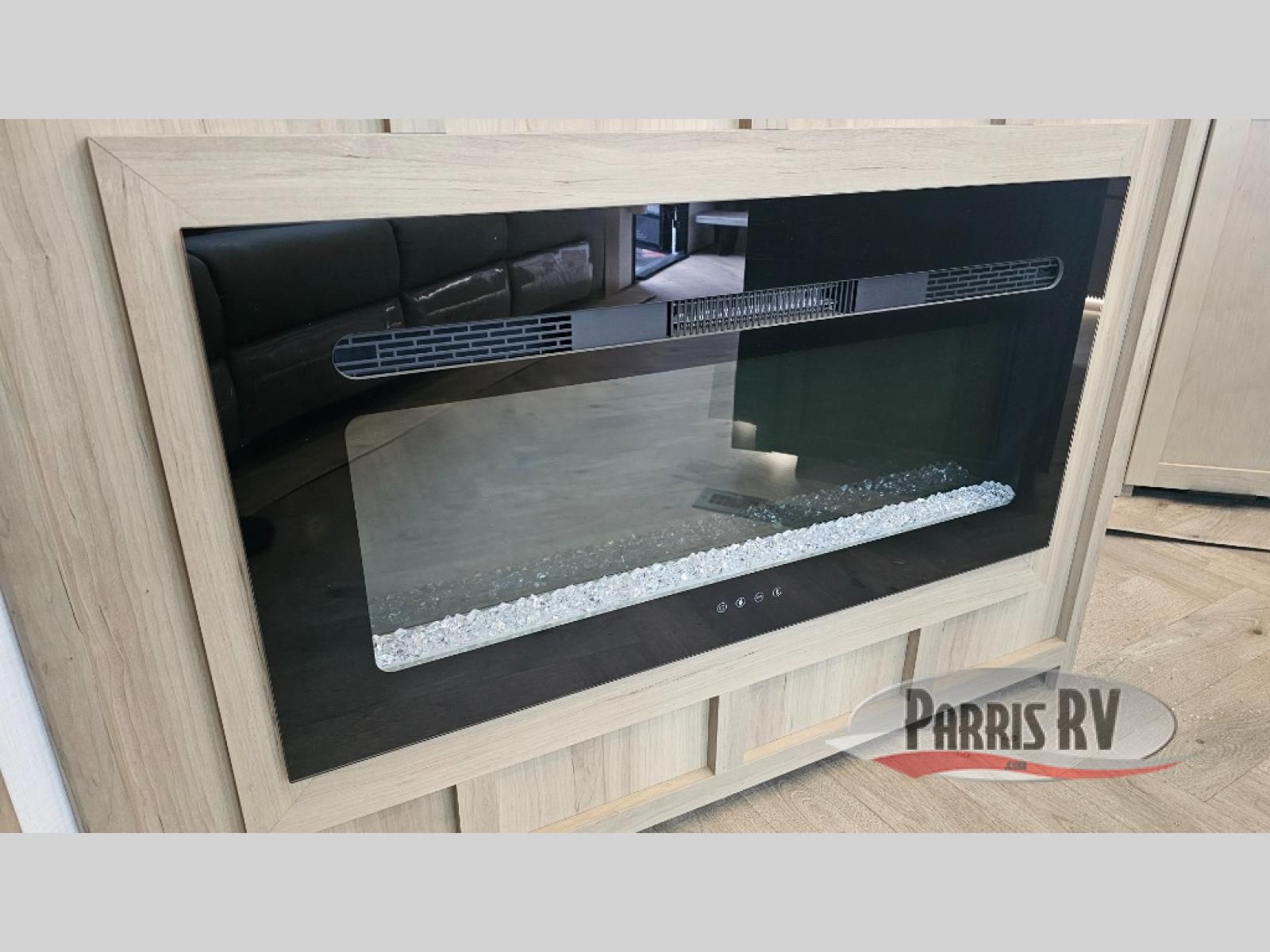 You will have everything you need for a comfortable camping trip and then some with this toy hauler! Load your toys into the 16' garage area with the Lippert Power Play motorized ramp door and secure them with 5,000 lb. frame welded tie-downs. The garage also has an electric bed above dual opposing sofas with a loft with a twin bed and a half bathroom. Create your best meals with the four-burner cooktop and enjoy the company of others sitting at the kitchen island with three bar stools while you prepare it. Relax in true comfort on the 4-seat recliner across from the entertainment center with a fireplace. When you're ready to wind down your nights, take a hot shower in the full bathroom then head directly into the front private bedroom which features a king bed suite with a large front wardrobe for clothing storage, and washer/dryer prep in case you wish to add appliances so you can wash your clothes while you are away!