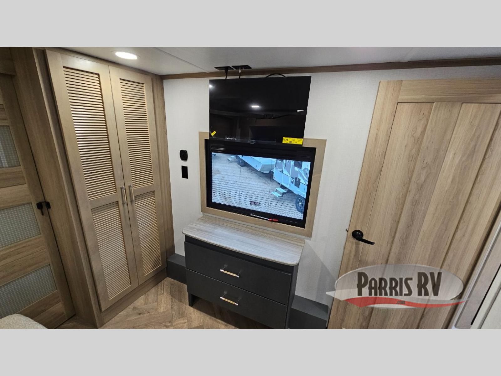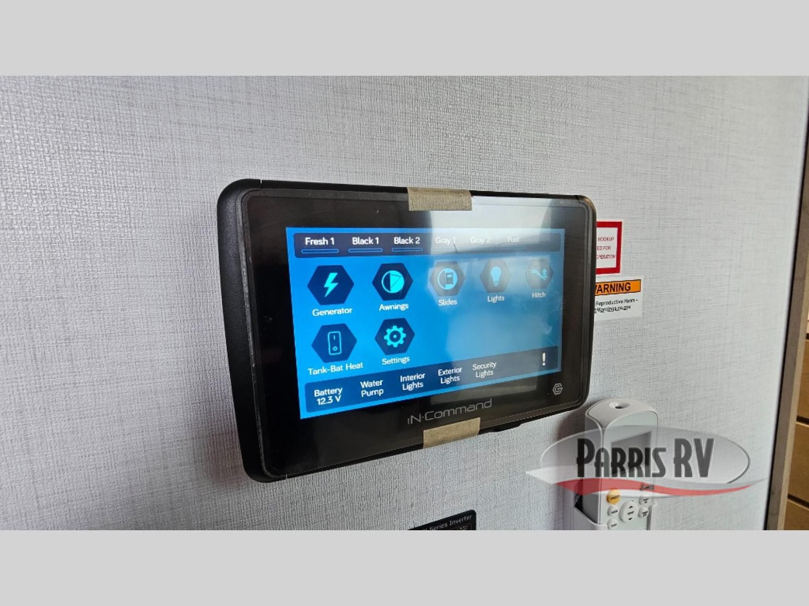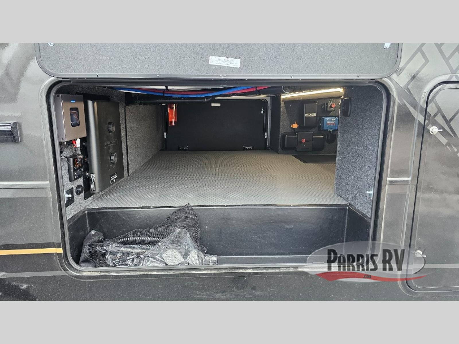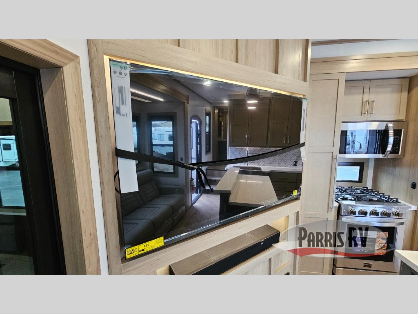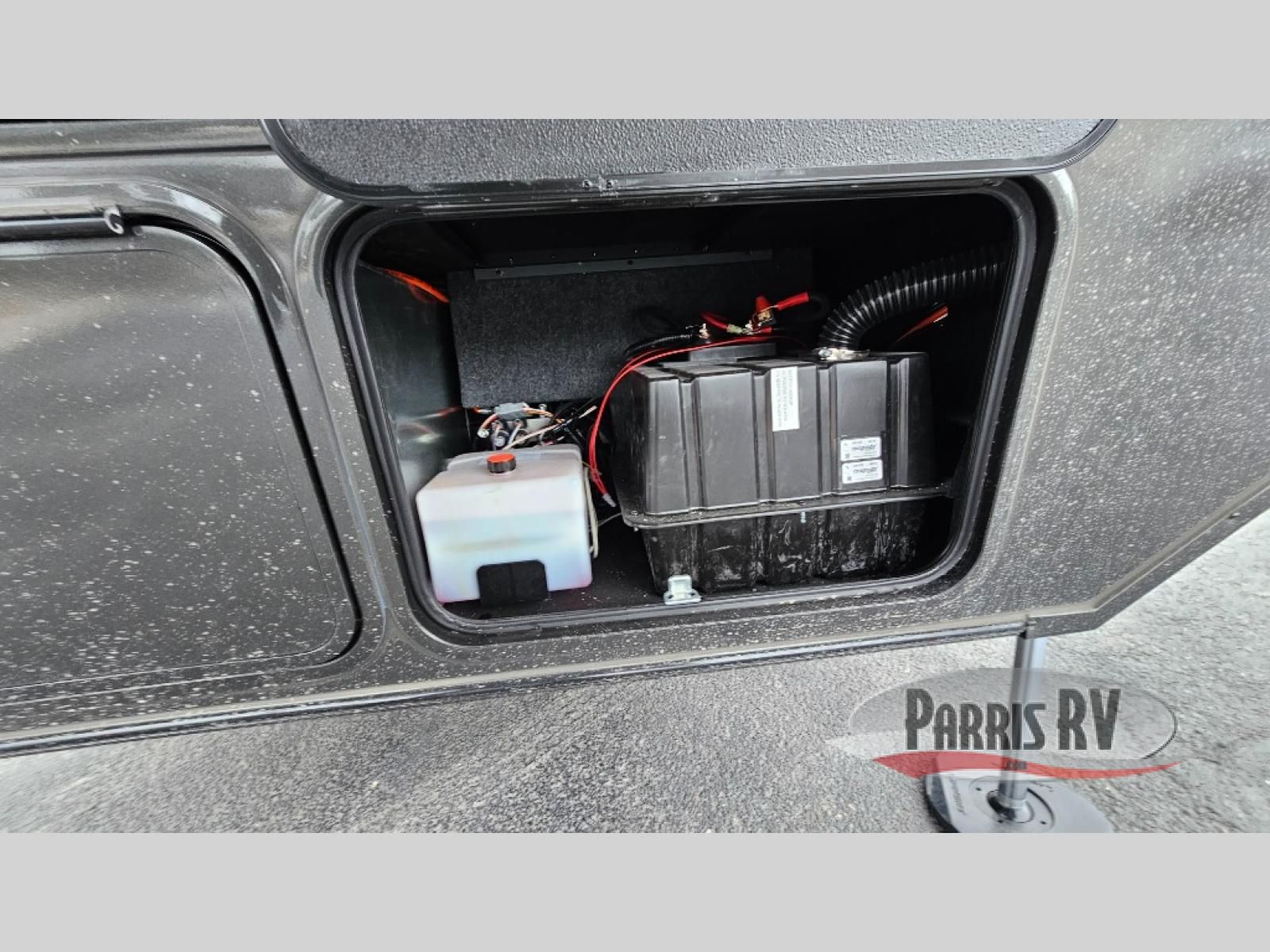 You will have everything you need for a comfortable camping trip and then some with this toy hauler! Load your toys into the 16' garage area with the Lippert Power Play motorized ramp door and secure them with 5,000 lb. frame welded tie-downs. The garage also has an electric bed above dual opposing sofas with a loft with a twin bed and a half bathroom. Create your best meals with the four-burner cooktop and enjoy the company of others sitting at the kitchen island with three bar stools while you prepare it. Relax in true comfort on the 4-seat recliner across from the entertainment center with a fireplace. When you're ready to wind down your nights, take a hot shower in the full bathroom then head directly into the front private bedroom which features a king bed suite with a large front wardrobe for clothing storage, and washer/dryer prep in case you wish to add appliances so you can wash your clothes while you are away!
