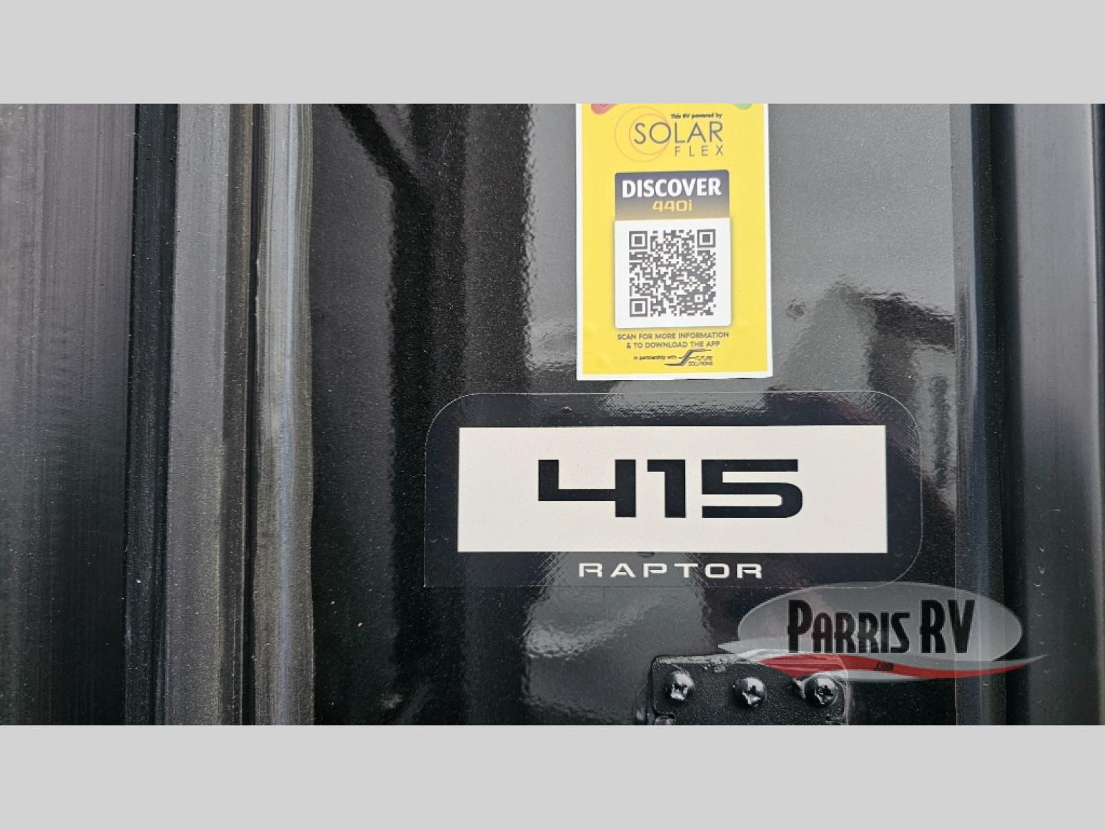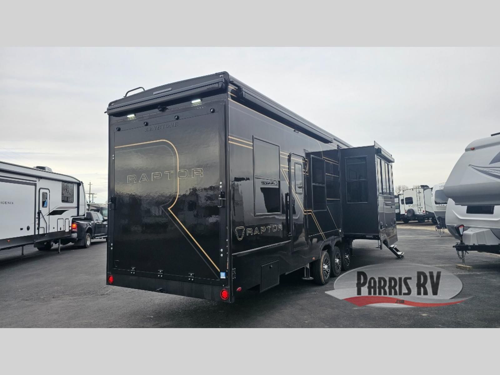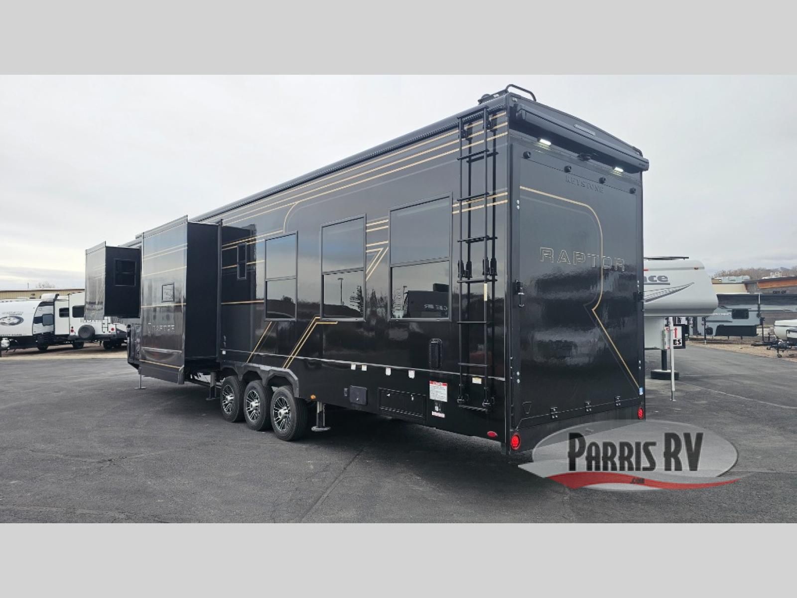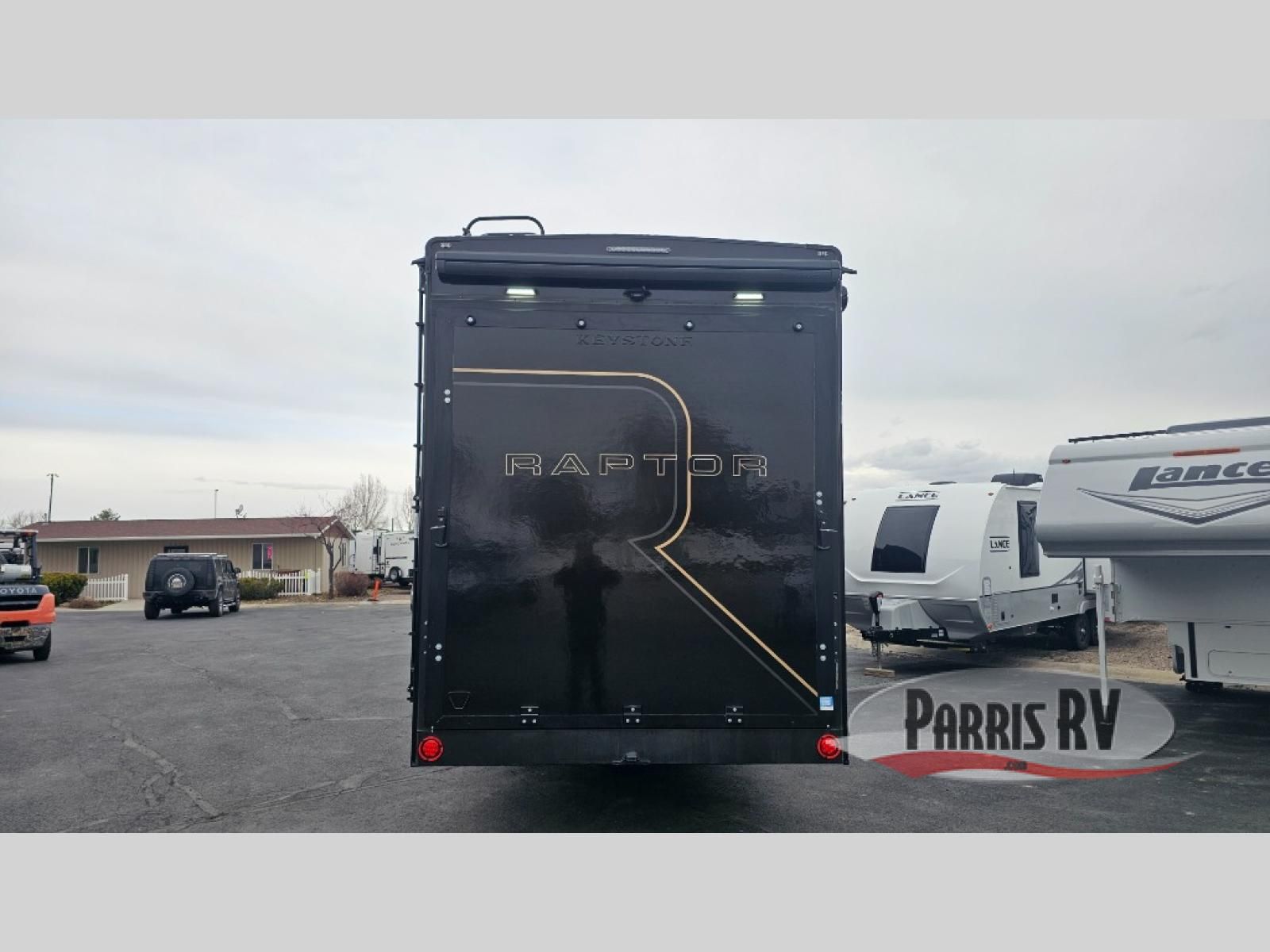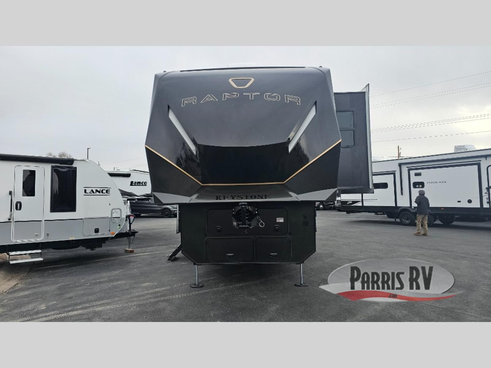 Experience a breath of fresh air with one of these Keystone RV Raptor fifth wheel toy haulers! Their rugged construction consists of a one-piece Alpha Super Flex TPO roof membrane, Dyna Span floor decking, and 5,000 lb. frame-welded tie- downs to keep your toys in place as you travel. Some unexpected conveniences you will appreciate include an Omni-Chill A/C system to keep you cool on those hot summer days, a Furrion backup camera, MaxTurnTM technology with a HeluxTM pin box, and a Generation 3 iN-Command smart automation system with Global Connect to make life easier. There is also designer style vinyl flooring throughout, along with new ceiling treatment with LED accent lighting, beach wood and white cabinetry, and many more interior comforts!