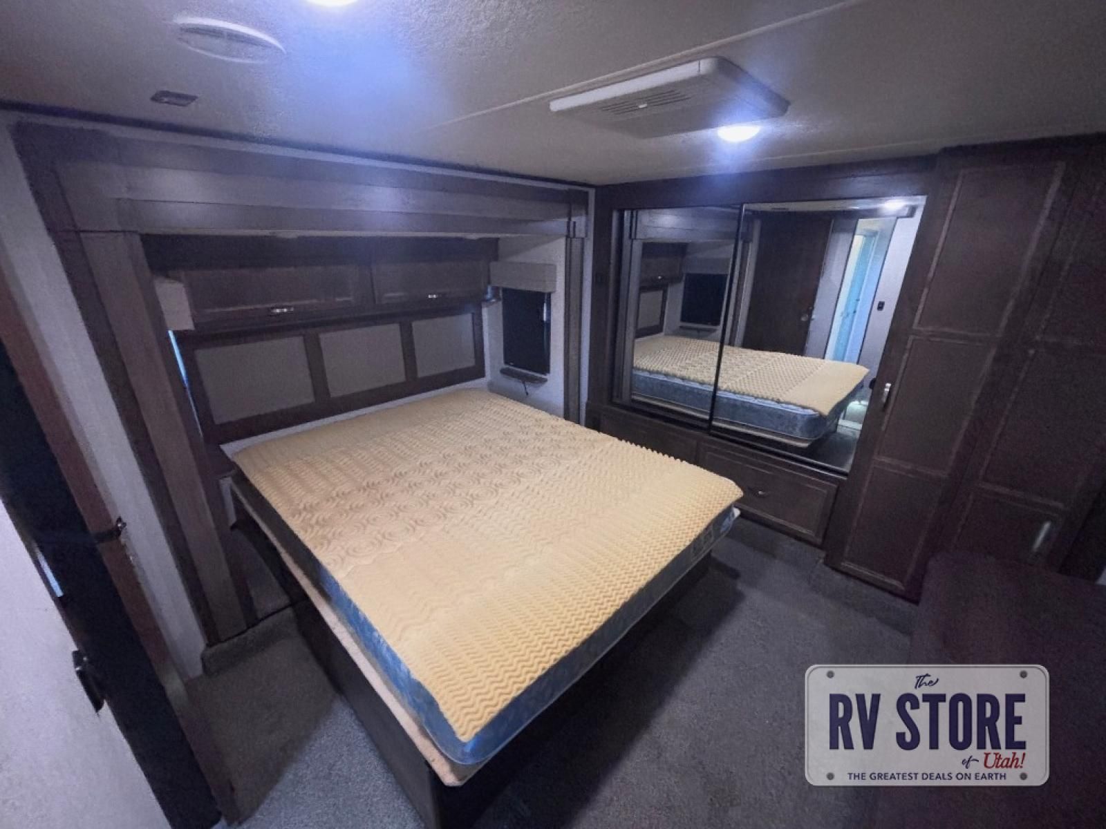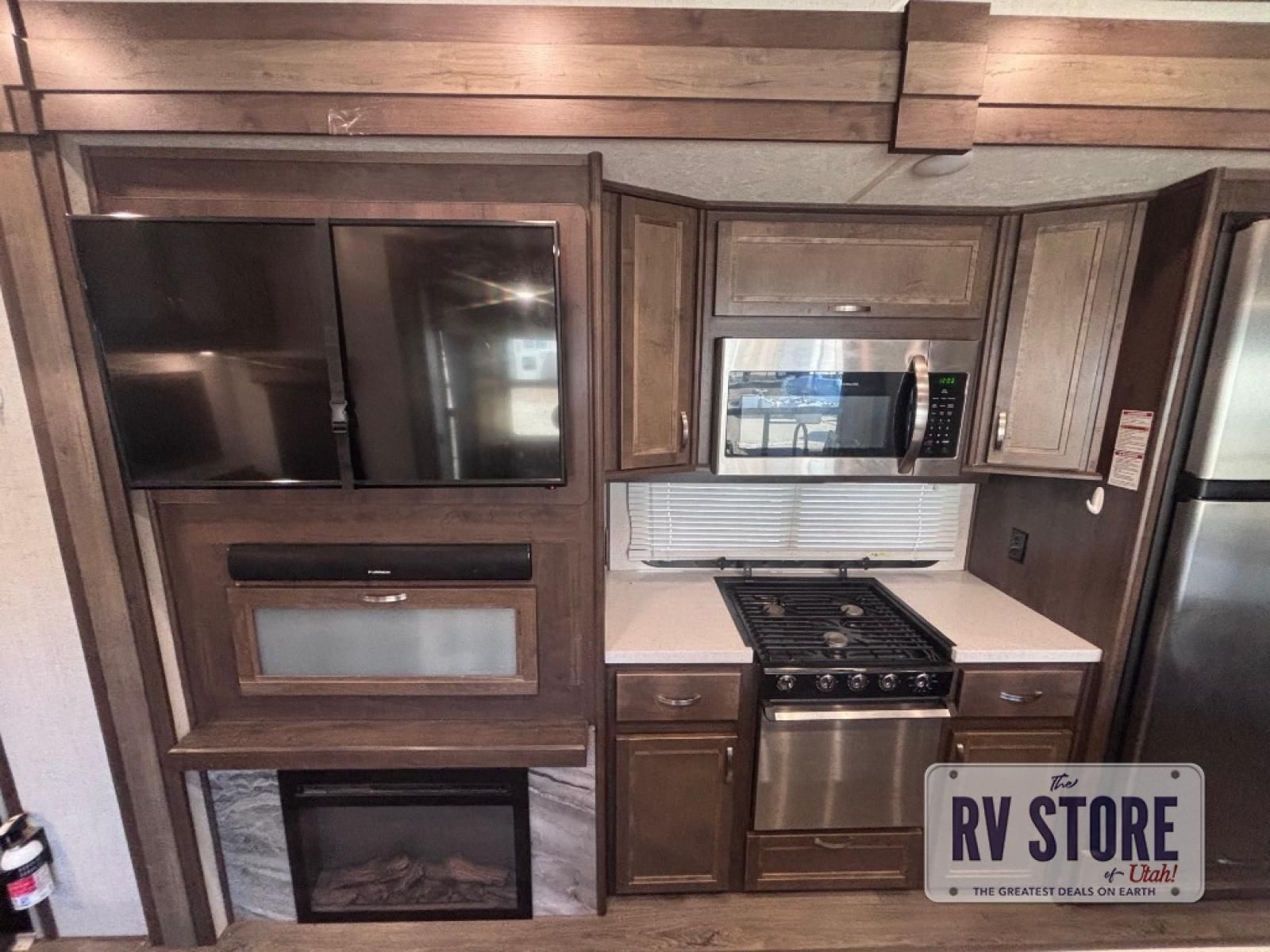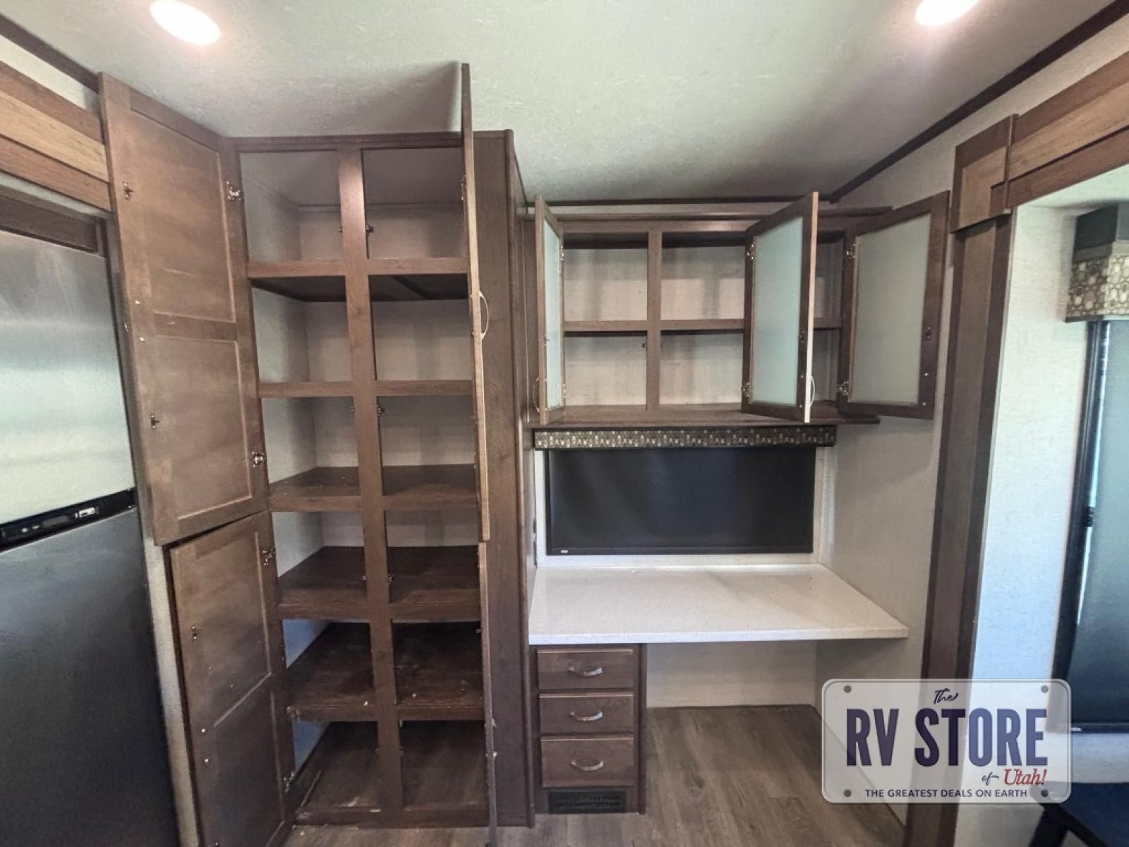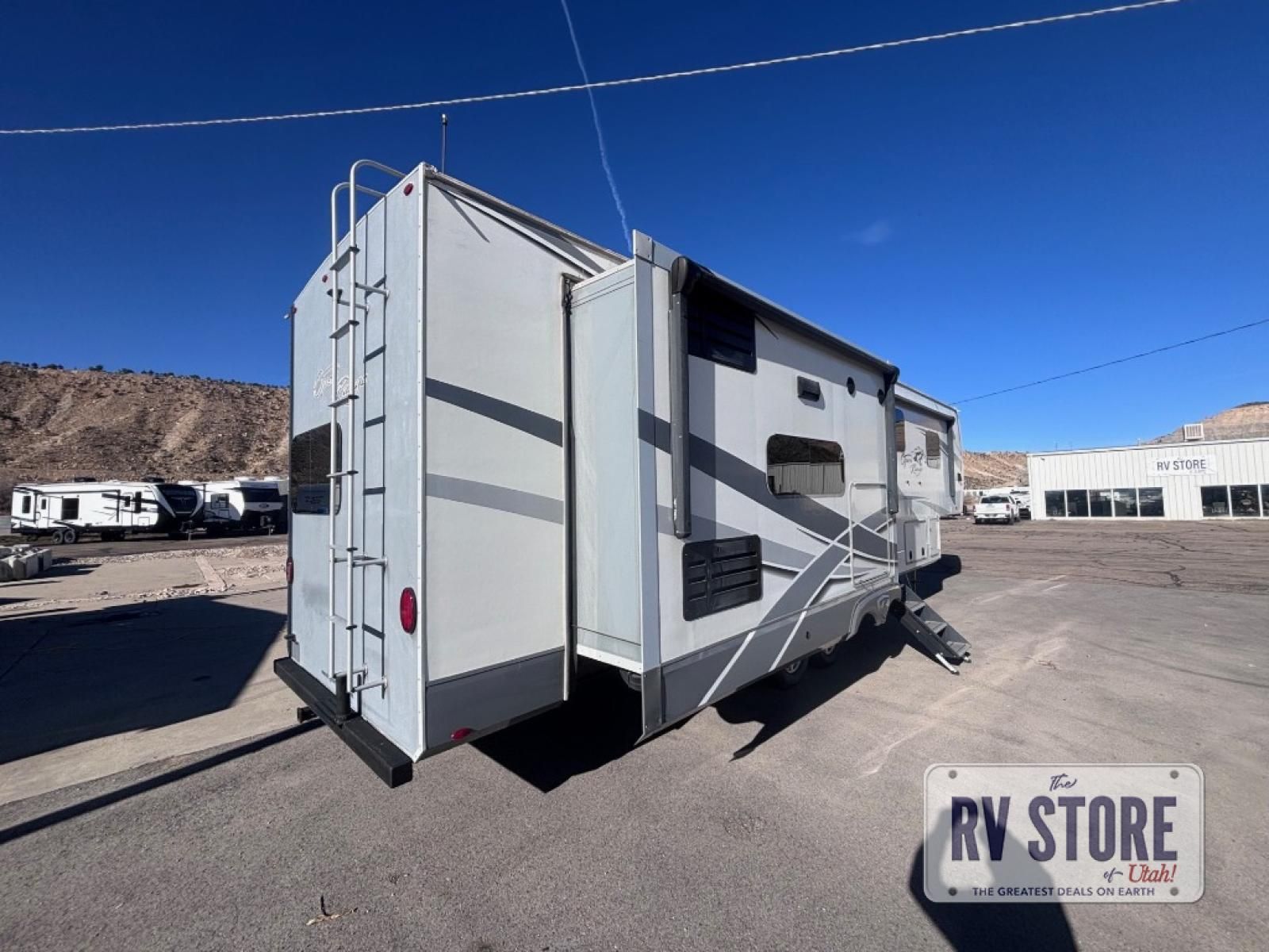 Come see what all the "buzz" is about! This fifth wheel is the perfect couple's RV for several reasons. Just imagine working at the desk after you grabbed a snack from the large pantry, and washed off an apple in the stainless steel sink on the center island. The kitchen layout offers a slide with all the appliances you will need to cook any meal, and a second slide with a free standing dinette and theater seats. There is even a sofa, making this area great for hosting your camping friends when the weather outside isn't just right. You will love the easy access to the dual entry bath especially at night, and the mirrored wardrobe when you are getting dressed for your next adventure. This could be the perfect choice!