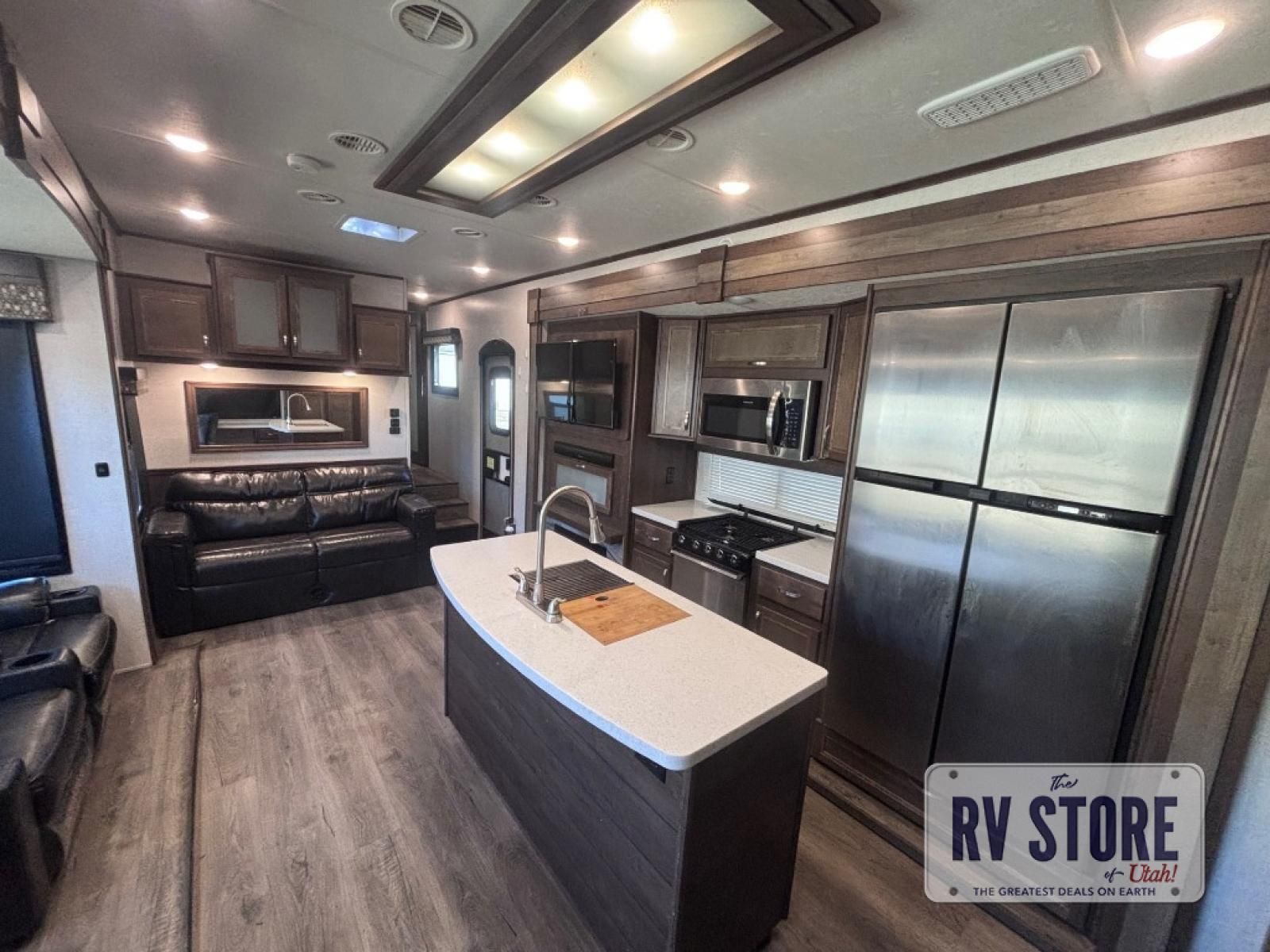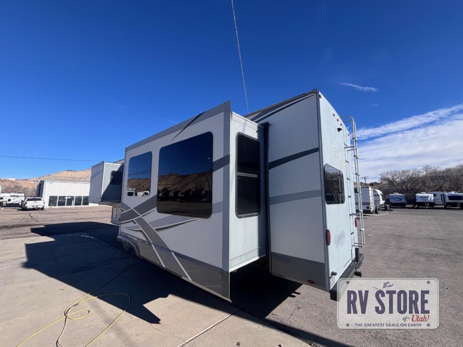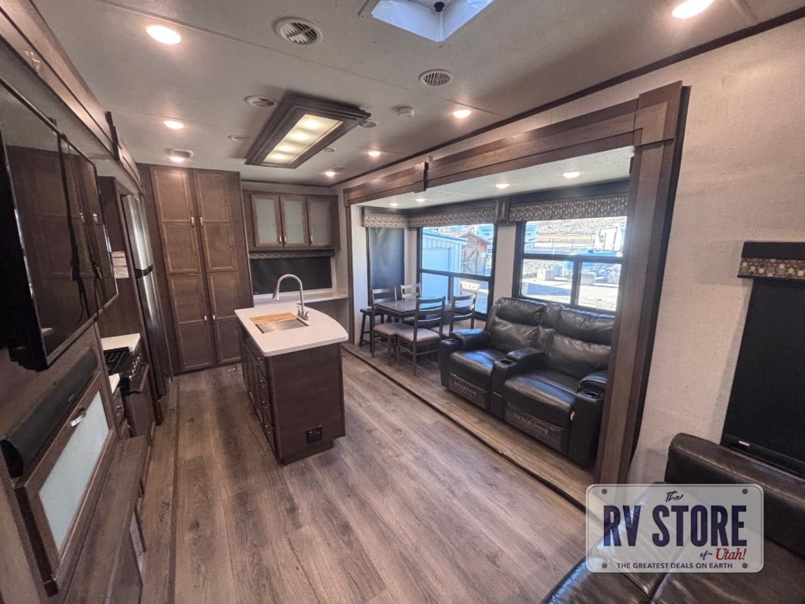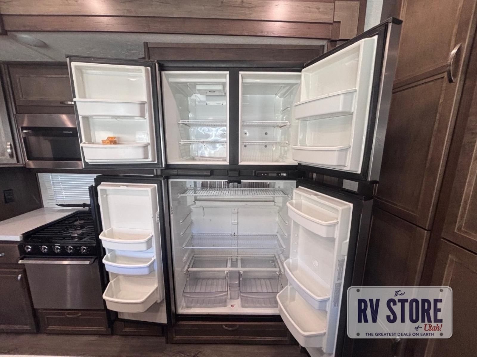 Come see what all the "buzz" is about! This fifth wheel is the perfect couple's RV for several reasons. Just imagine working at the desk after you grabbed a snack from the large pantry, and washed off an apple in the stainless steel sink on the center island. The kitchen layout offers a slide with all the appliances you will need to cook any meal, and a second slide with a free standing dinette and theater seats. There is even a sofa, making this area great for hosting your camping friends when the weather outside isn't just right. You will love the easy access to the dual entry bath especially at night, and the mirrored wardrobe when you are getting dressed for your next adventure. This could be the perfect choice!