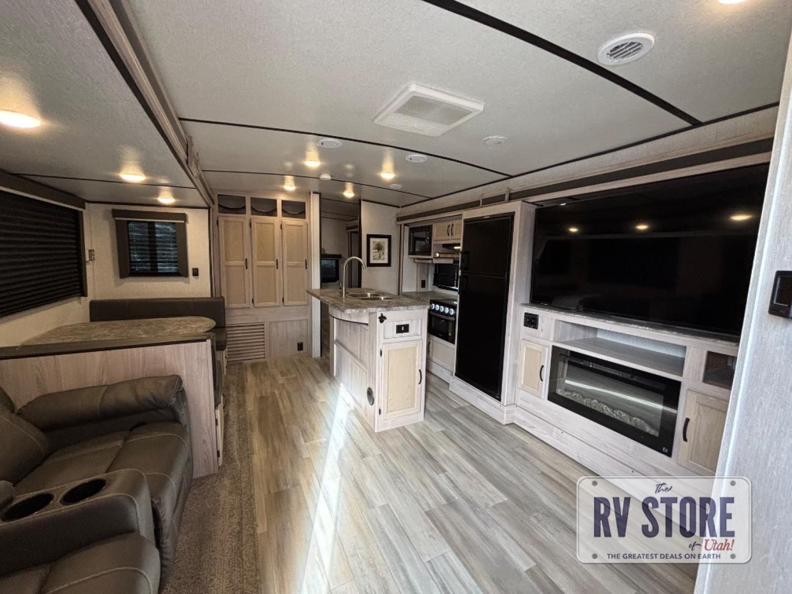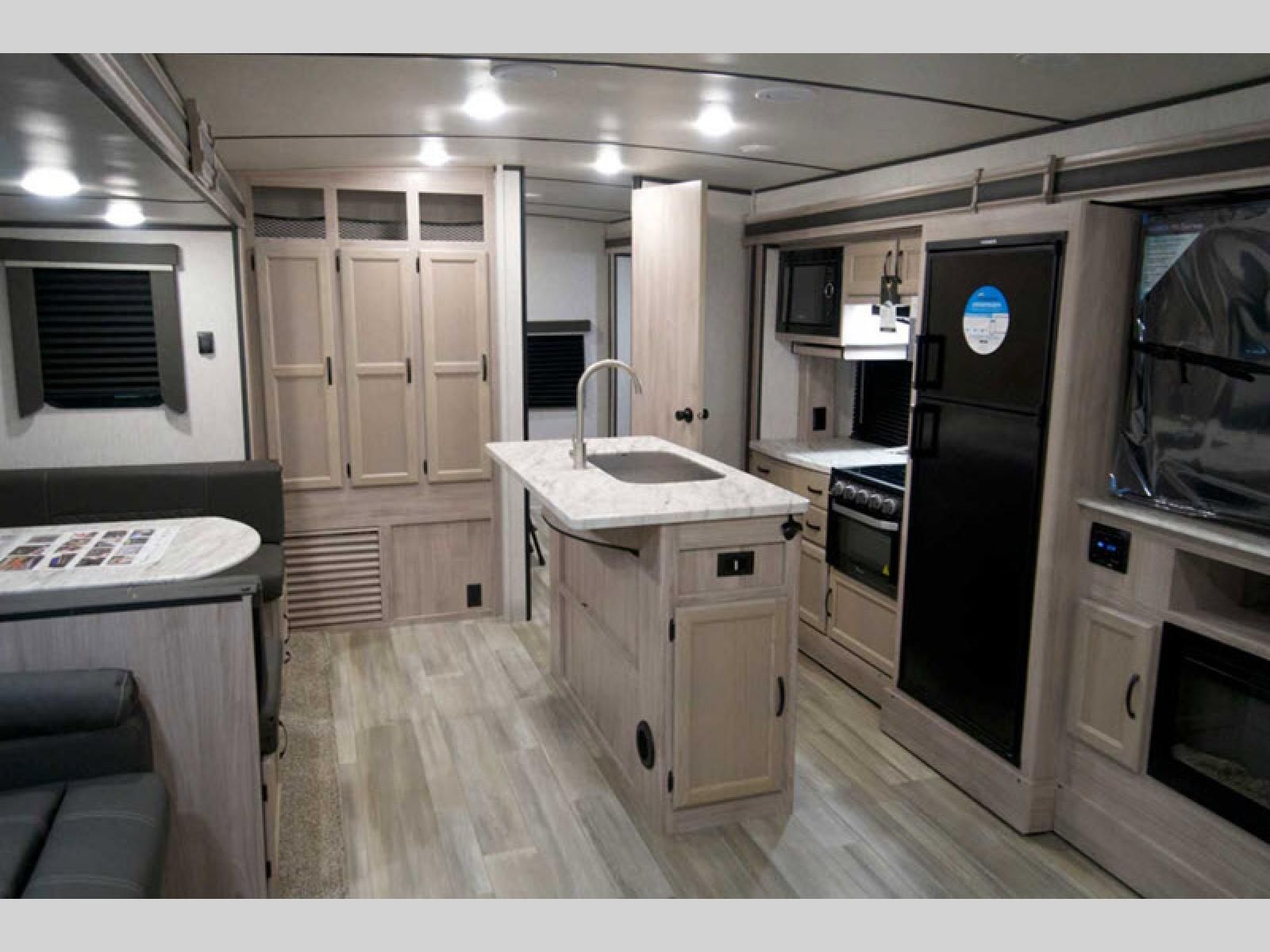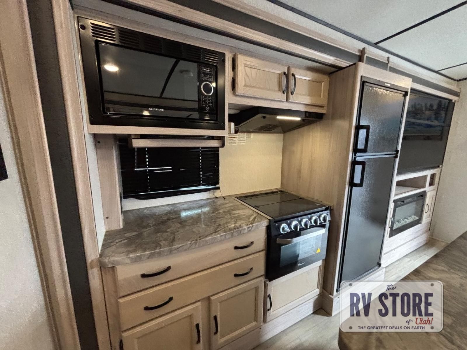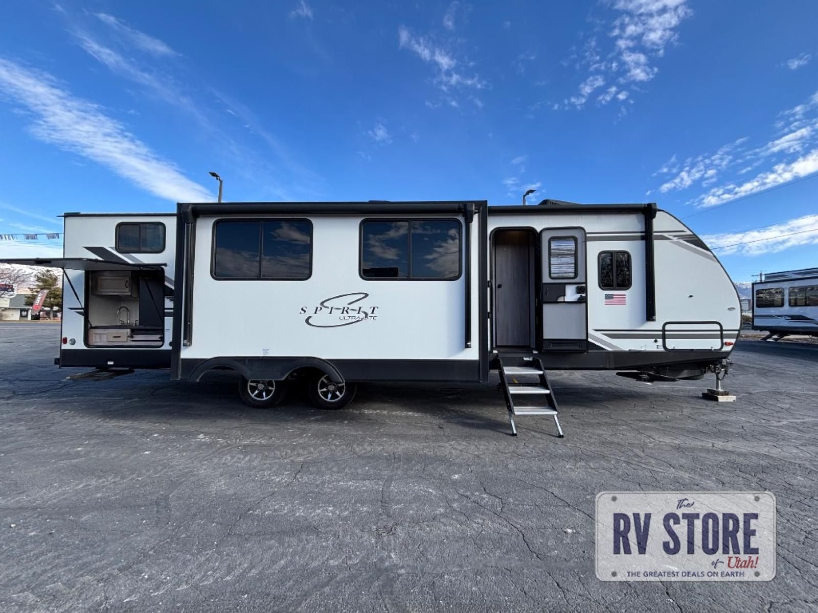 Your family might never want to go home after camping in this Spirit Ultra Lite travel trailer! With its rear private bunkhouse and front private bedroom, you will have the perfect trailer for fun with extra sleeping space for guests, and the three slides give you extra floor space so that no one feels crowded. You will love having a shower with seat in the full bathroom after a long hike or run. The fireplace will keep you cozy when traveling in cooler temperatures, and the air conditioner is nice in the summer. The kids can play and sleep in the bunkhouse that has two bunks and a tri-fold sofa. Making your famous meals is easy in the full kitchen, and you can make a few meals on the outside camp kitchen.