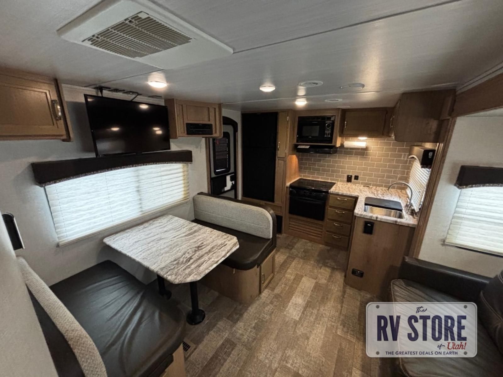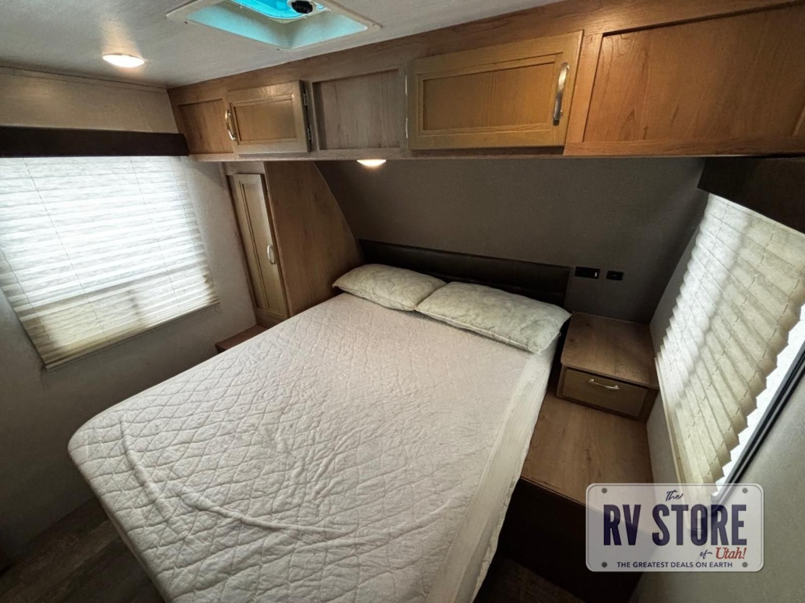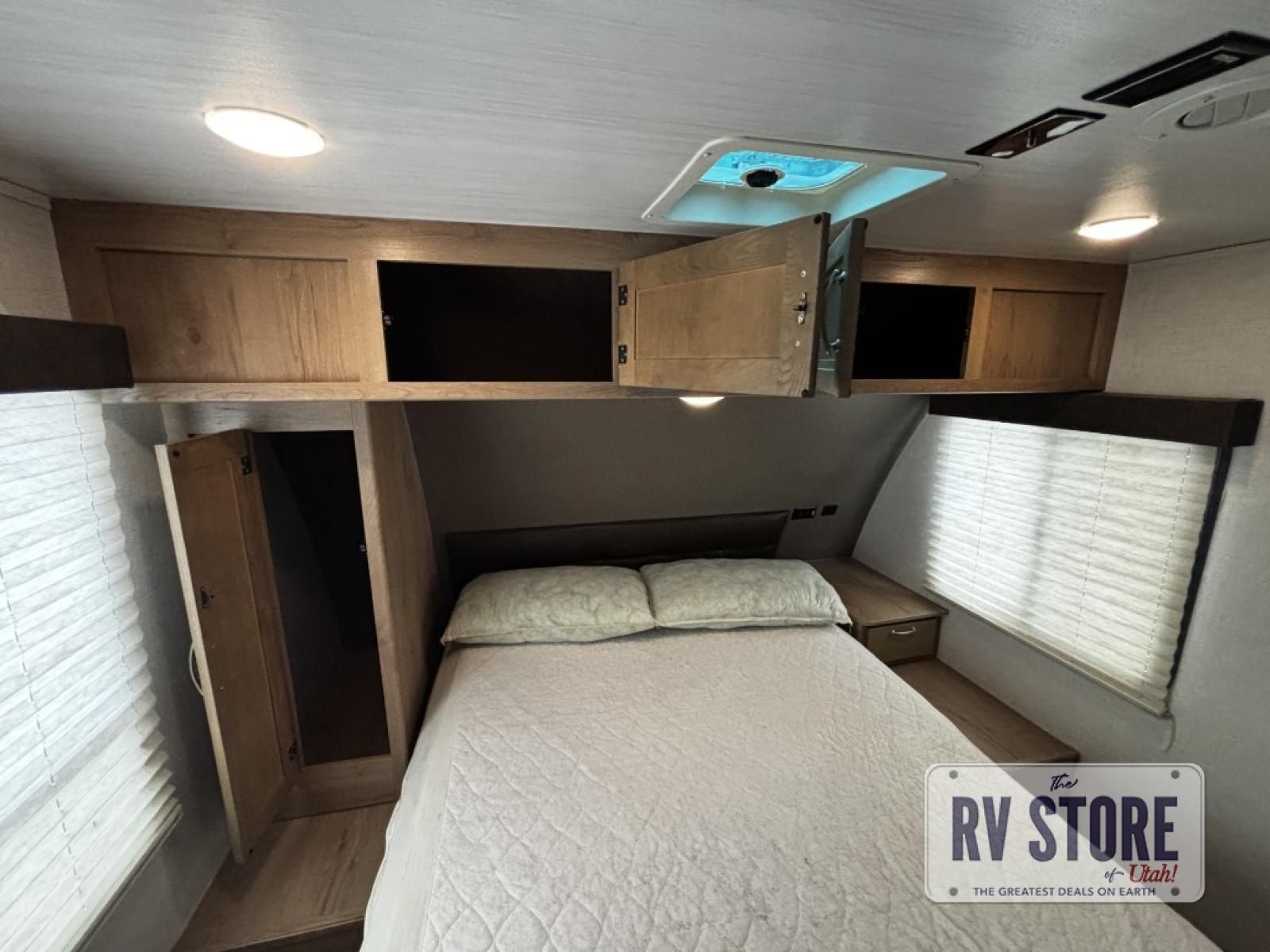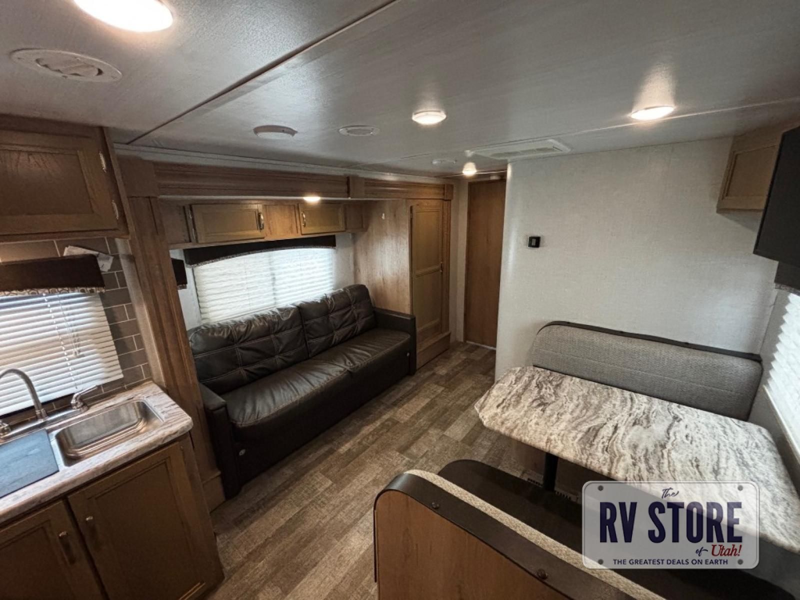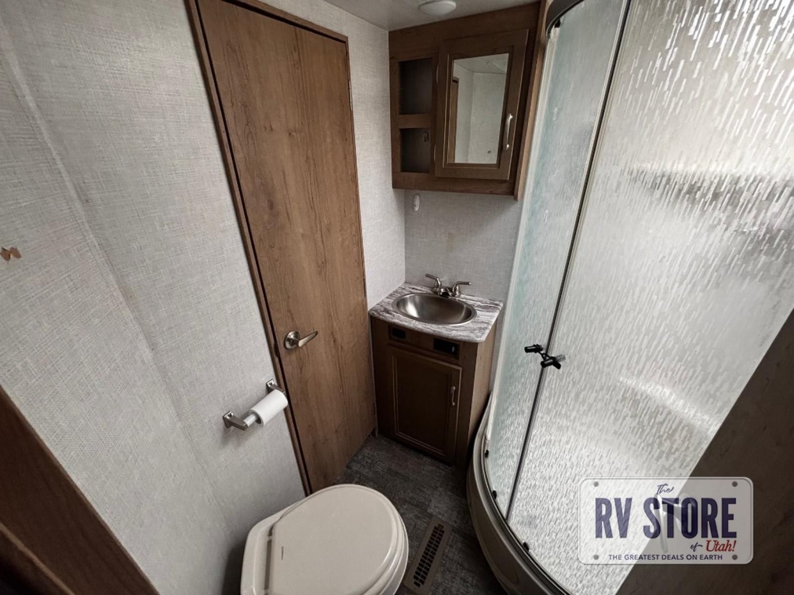 The rear kitchen really makes this Minnie travel trailer unique. You will find it easy and fun to cook while you camp, and dining will be comfortable at the booth dinette inside. You can also choose to take your meals out on a warm, sunny day and enjoy the sites and sounds while you eat at a picnic table or under the 19' power awning in the shade. There is abundant storage throughout with overhead cabinets, wardrobes, and lockable storage spaces on the exterior where you can tuck away outdoor toys, games, and gear. You will also find an outdoor shower which is great for rinsing off before heading inside. The front master suite also features its own private entry door making it convenient to slip outside for a moonlit stroll on a warm, clear night!