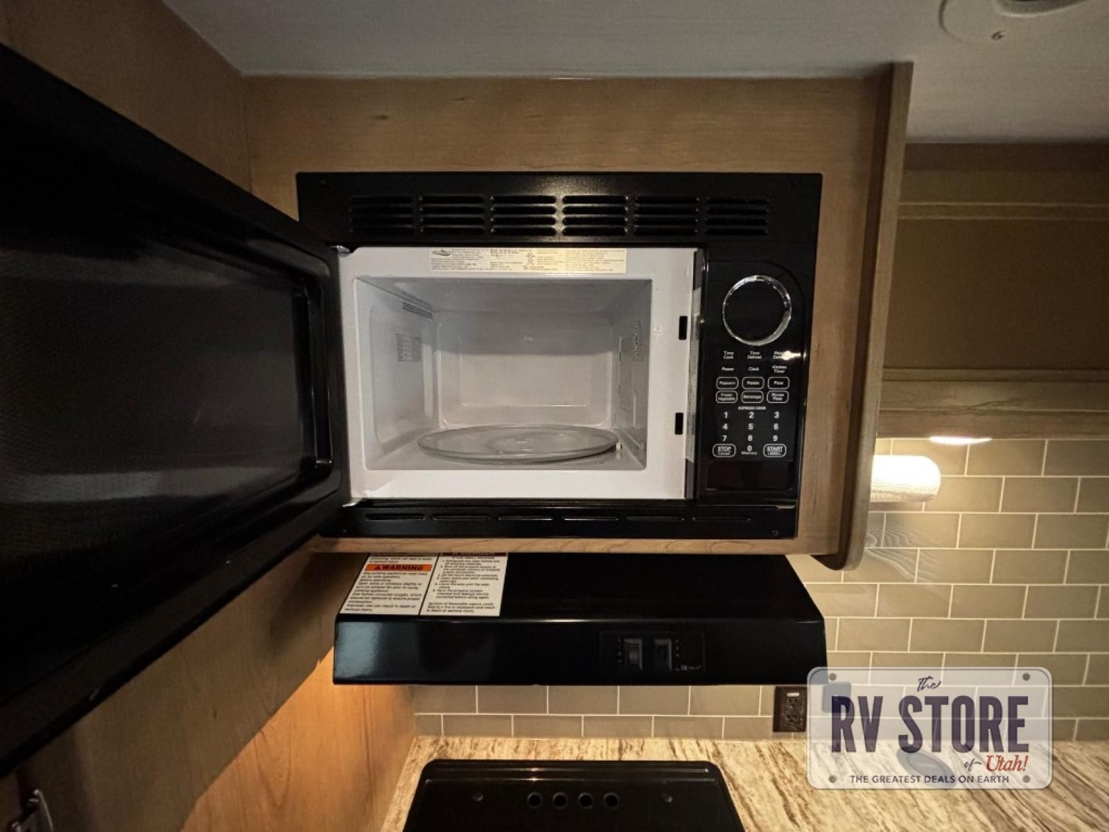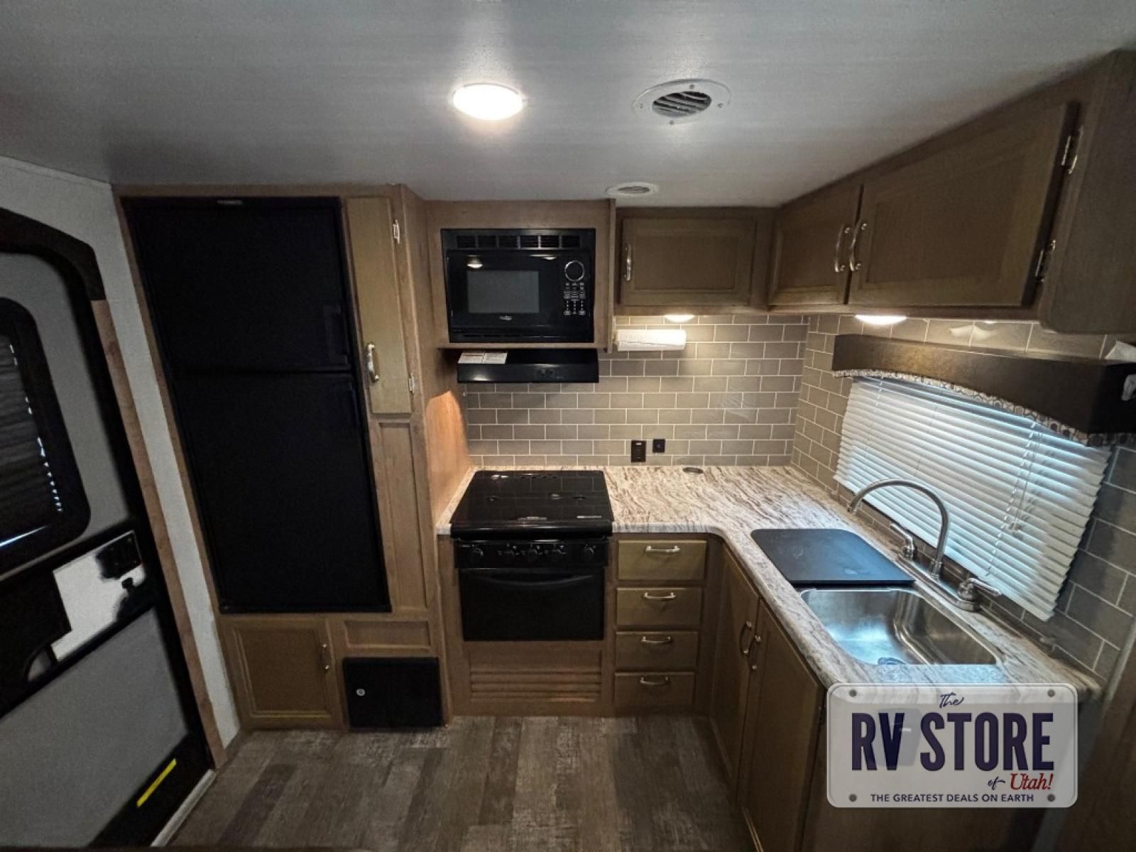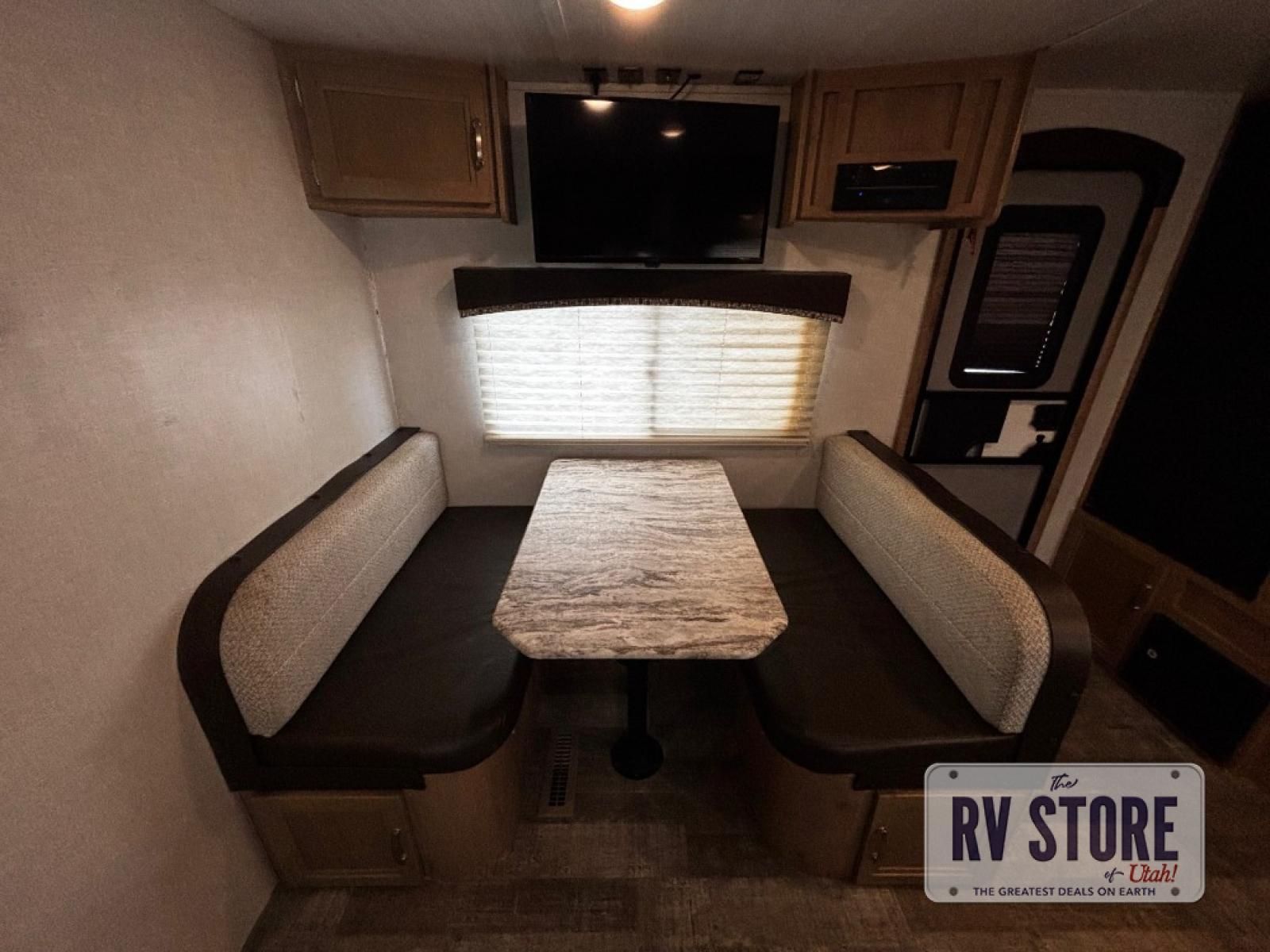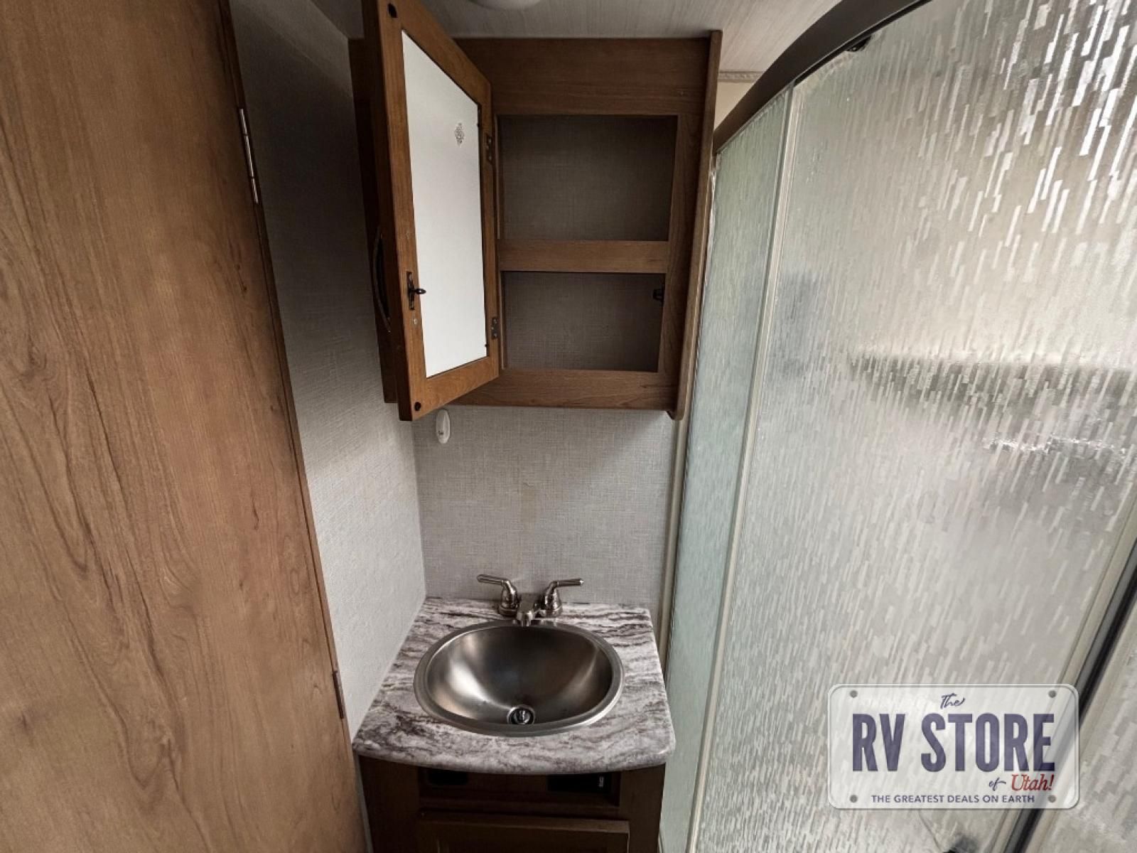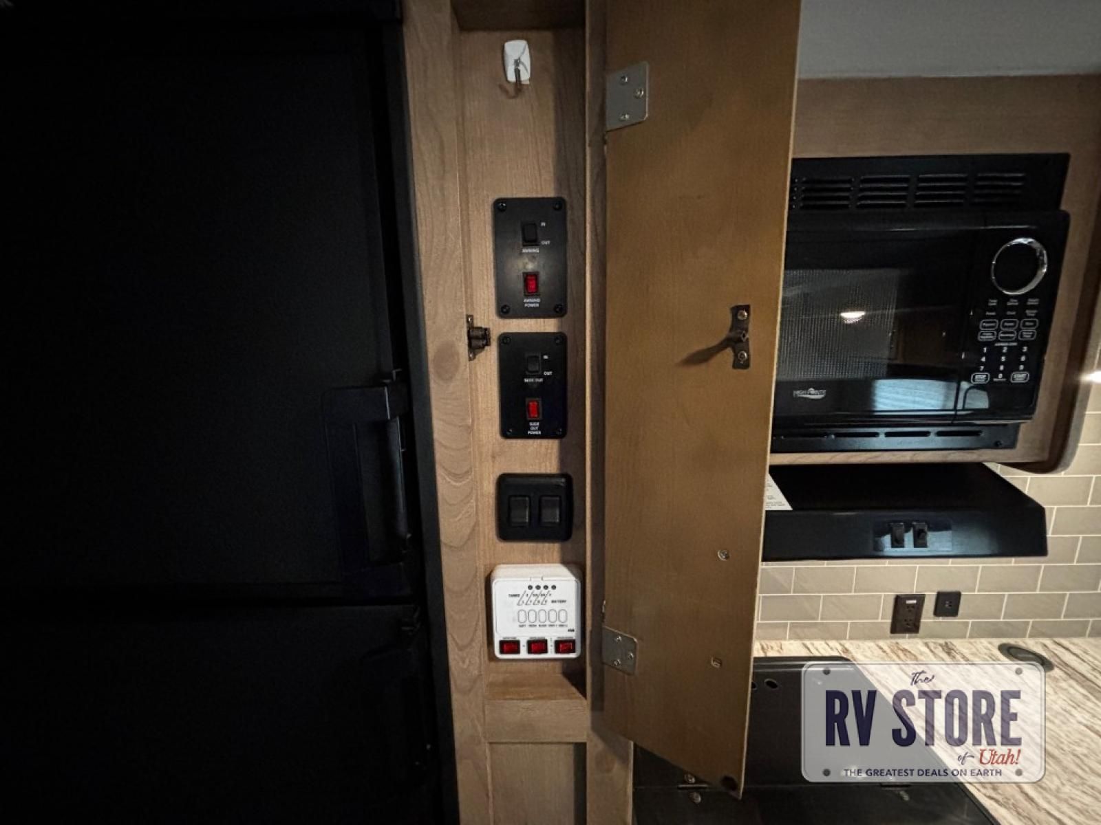 The rear kitchen really makes this Minnie travel trailer unique. You will find it easy and fun to cook while you camp, and dining will be comfortable at the booth dinette inside. You can also choose to take your meals out on a warm, sunny day and enjoy the sites and sounds while you eat at a picnic table or under the 19' power awning in the shade. There is abundant storage throughout with overhead cabinets, wardrobes, and lockable storage spaces on the exterior where you can tuck away outdoor toys, games, and gear. You will also find an outdoor shower which is great for rinsing off before heading inside. The front master suite also features its own private entry door making it convenient to slip outside for a moonlit stroll on a warm, clear night!