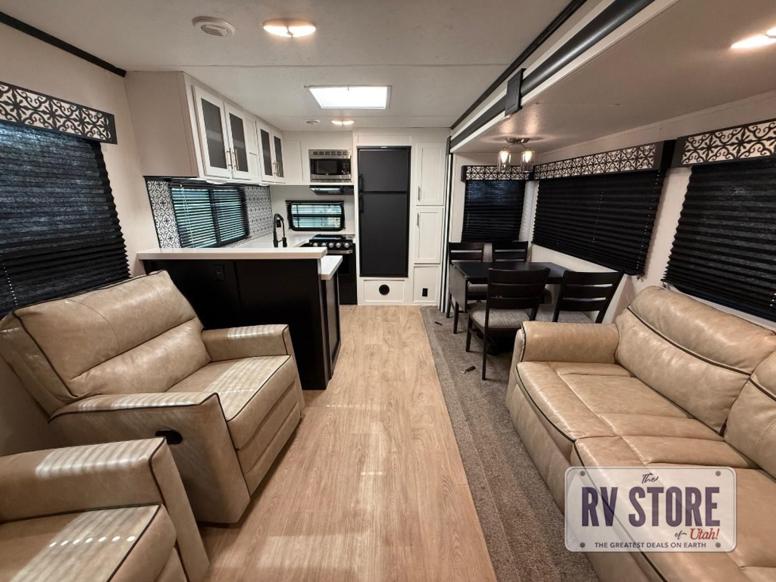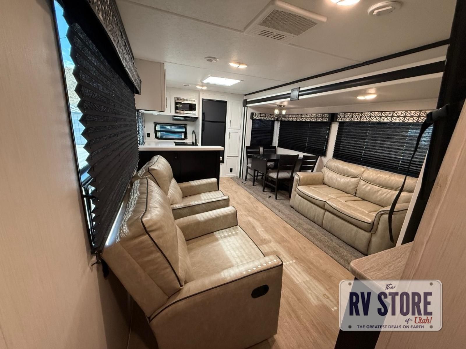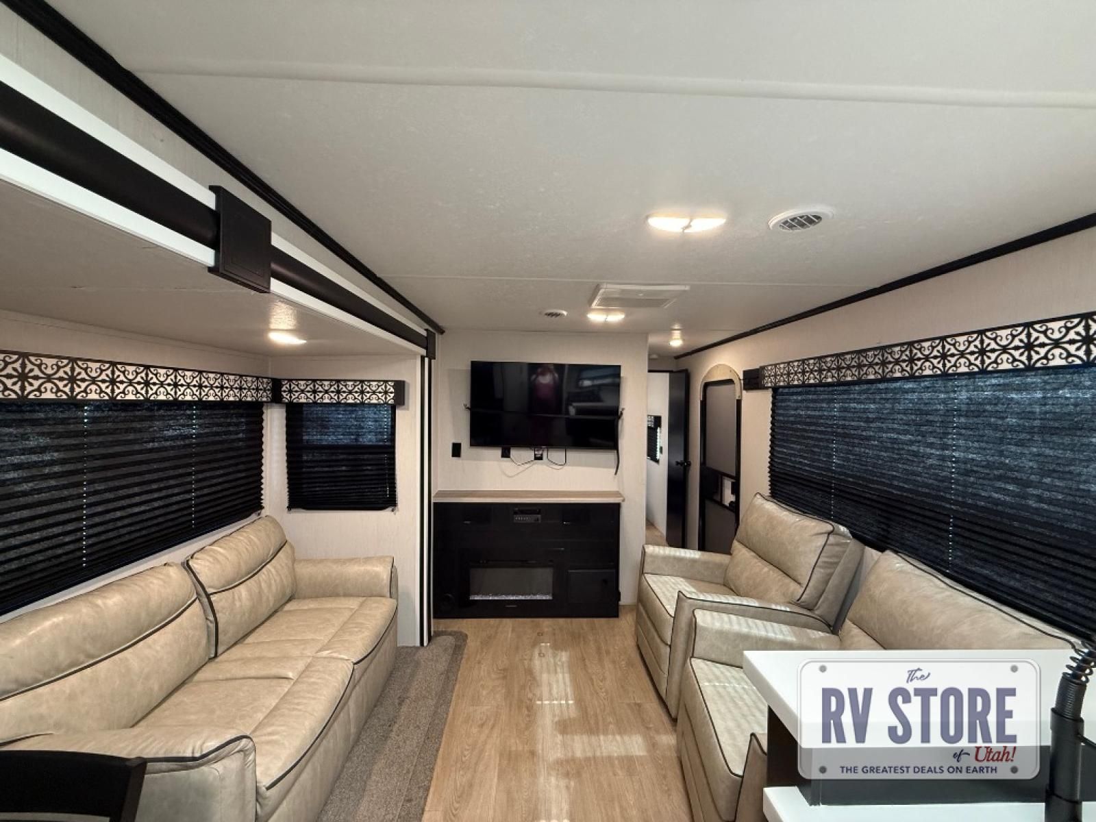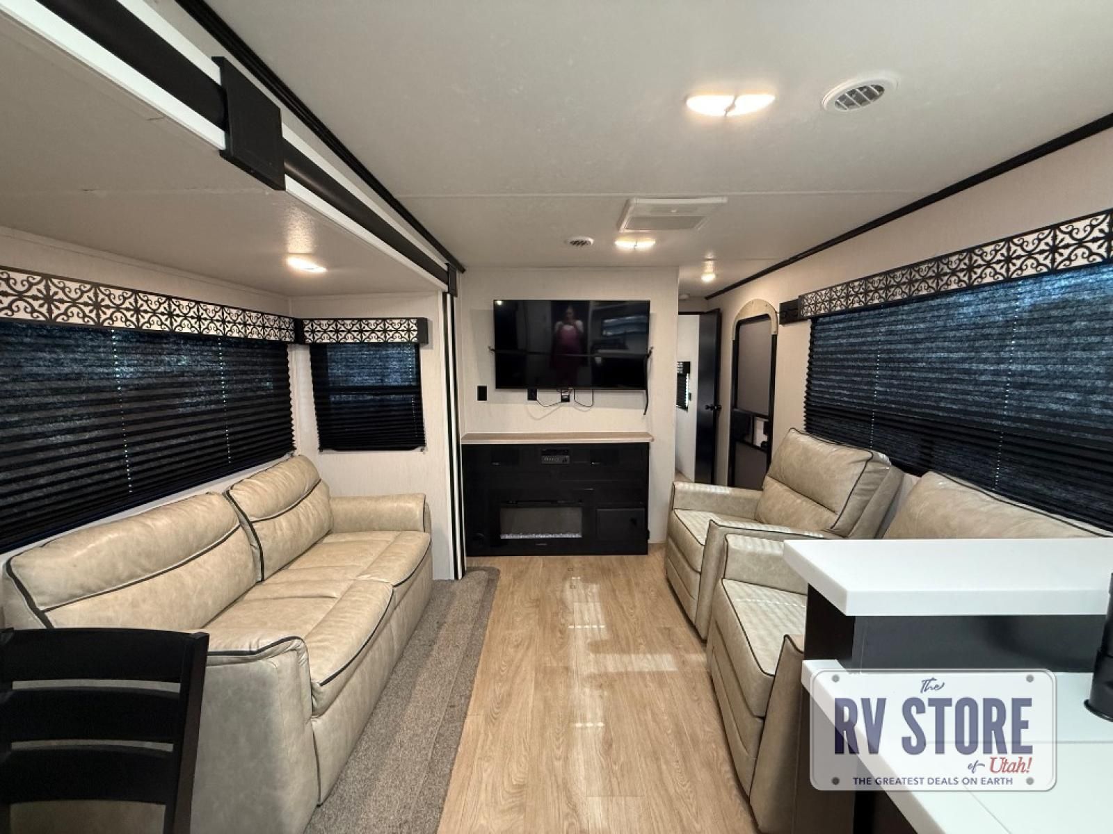 Pack your bags and head to your favorite state park in this travel trailer! The chef of the family will love their options to cook in the rear kitchen indoors, or use the outside kitchen that includes a refrigerator and a grill. Your crew can relax on the lounge chairs, the tri-fold sofa, or at the oversized dinette. This travel trailer also includes a fireplace with a 50" TV so you can enjoy a nice cozy evening watching your favorite movies, and the panoramic windows will let in tons of natural light during the daytime!