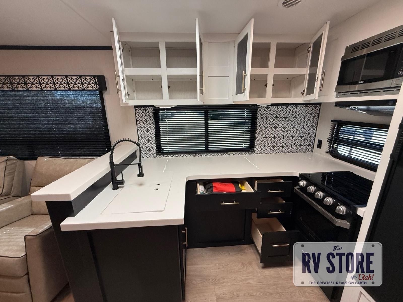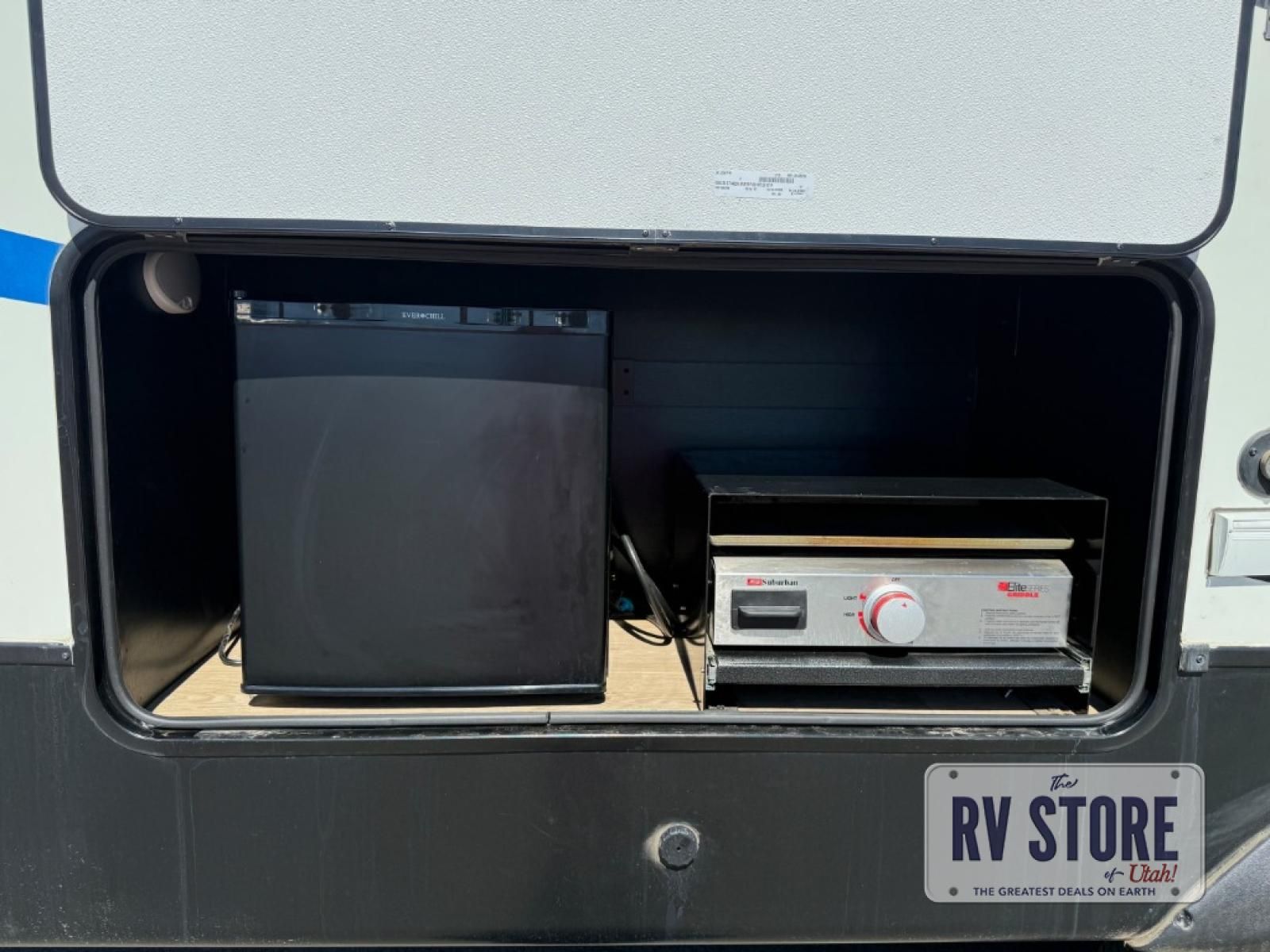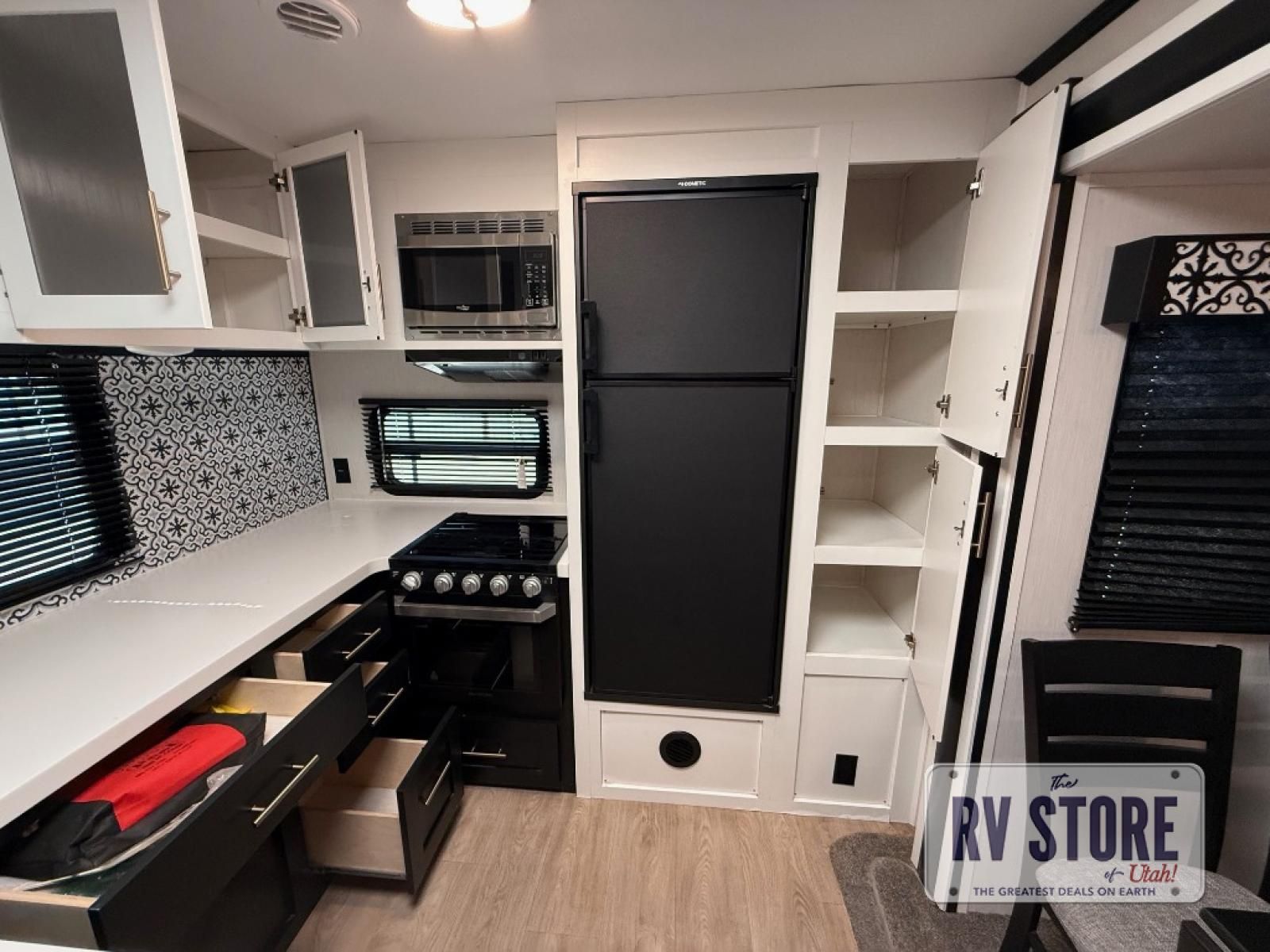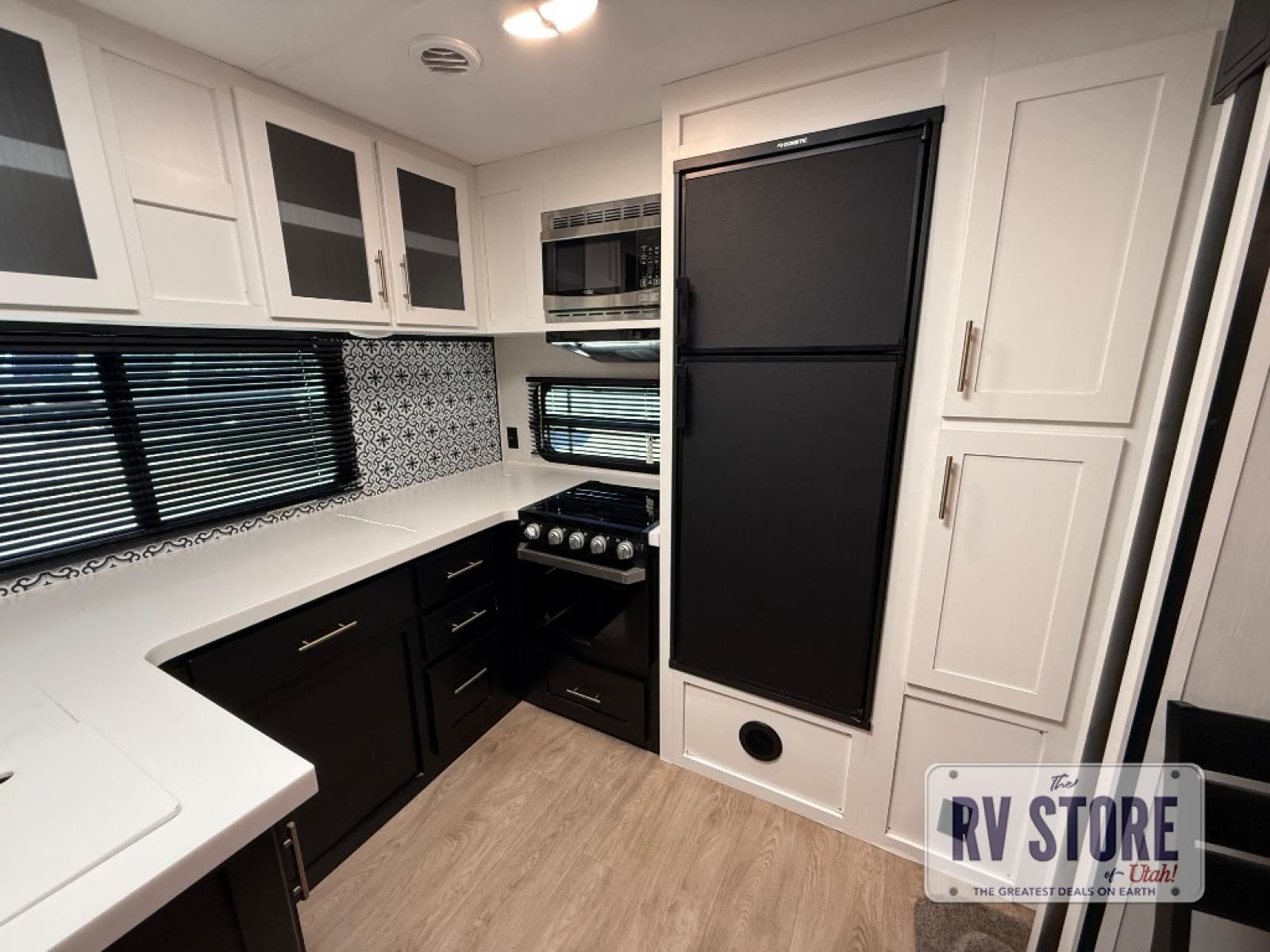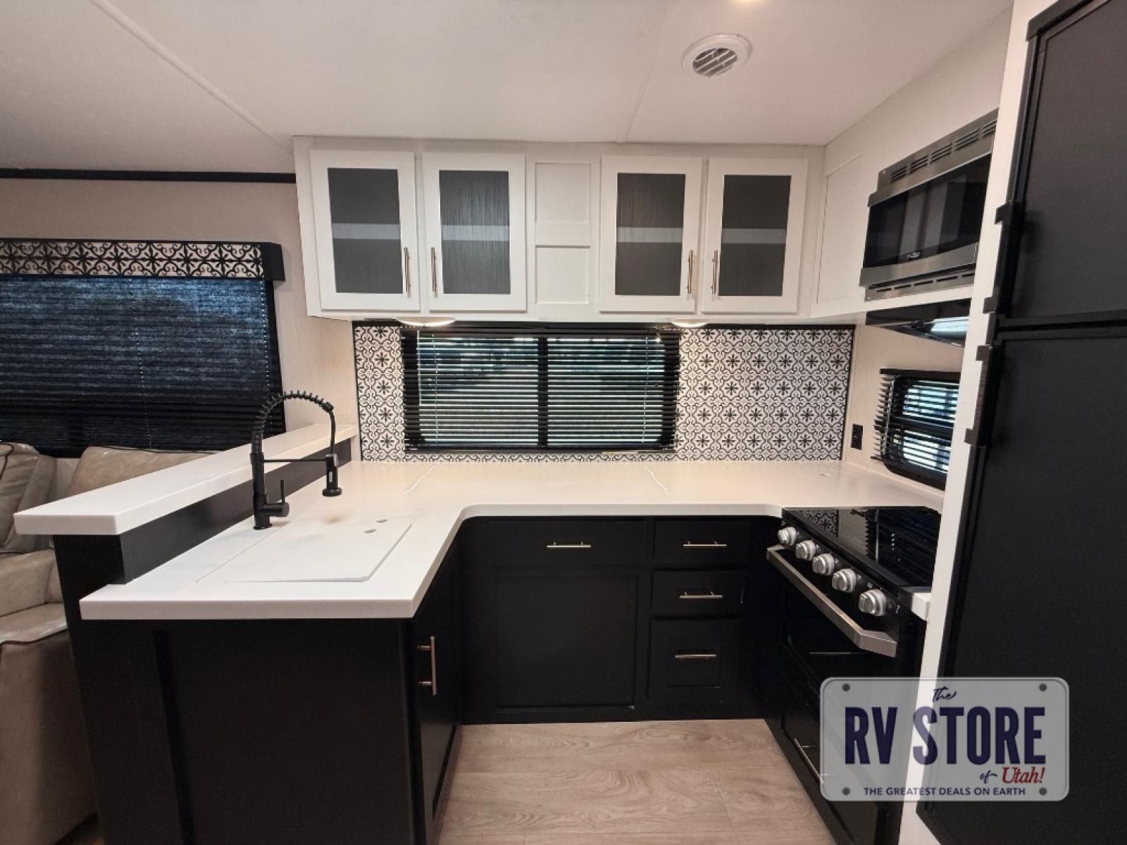 Pack your bags and head to your favorite state park in this travel trailer! The chef of the family will love their options to cook in the rear kitchen indoors, or use the outside kitchen that includes a refrigerator and a grill. Your crew can relax on the lounge chairs, the tri-fold sofa, or at the oversized dinette. This travel trailer also includes a fireplace with a 50" TV so you can enjoy a nice cozy evening watching your favorite movies, and the panoramic windows will let in tons of natural light during the daytime!