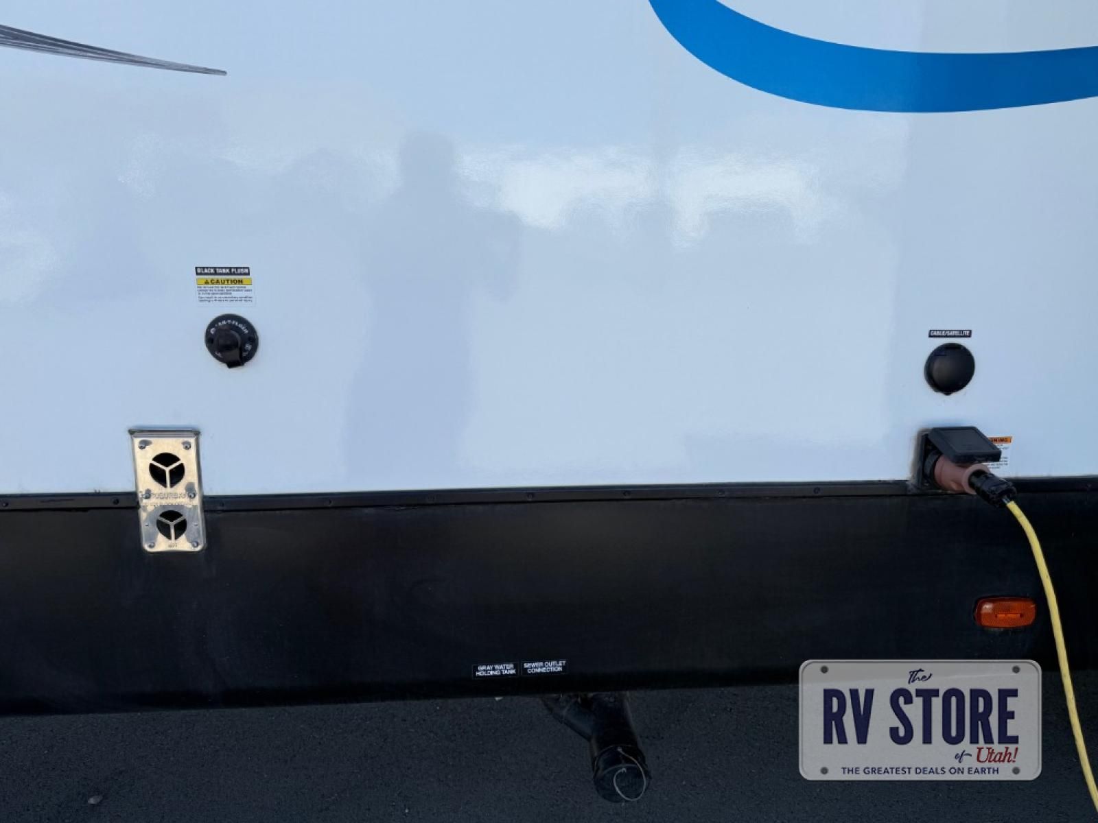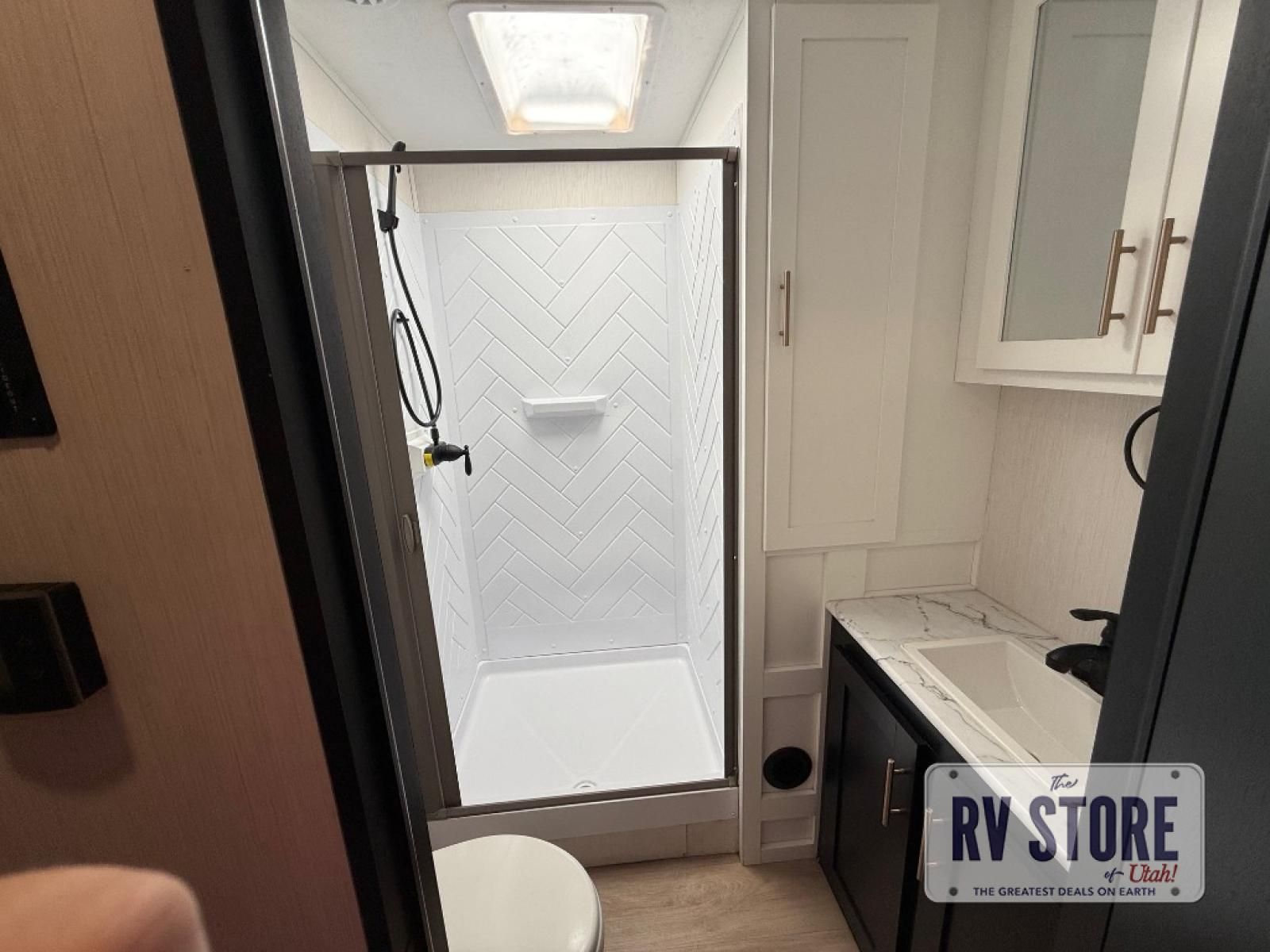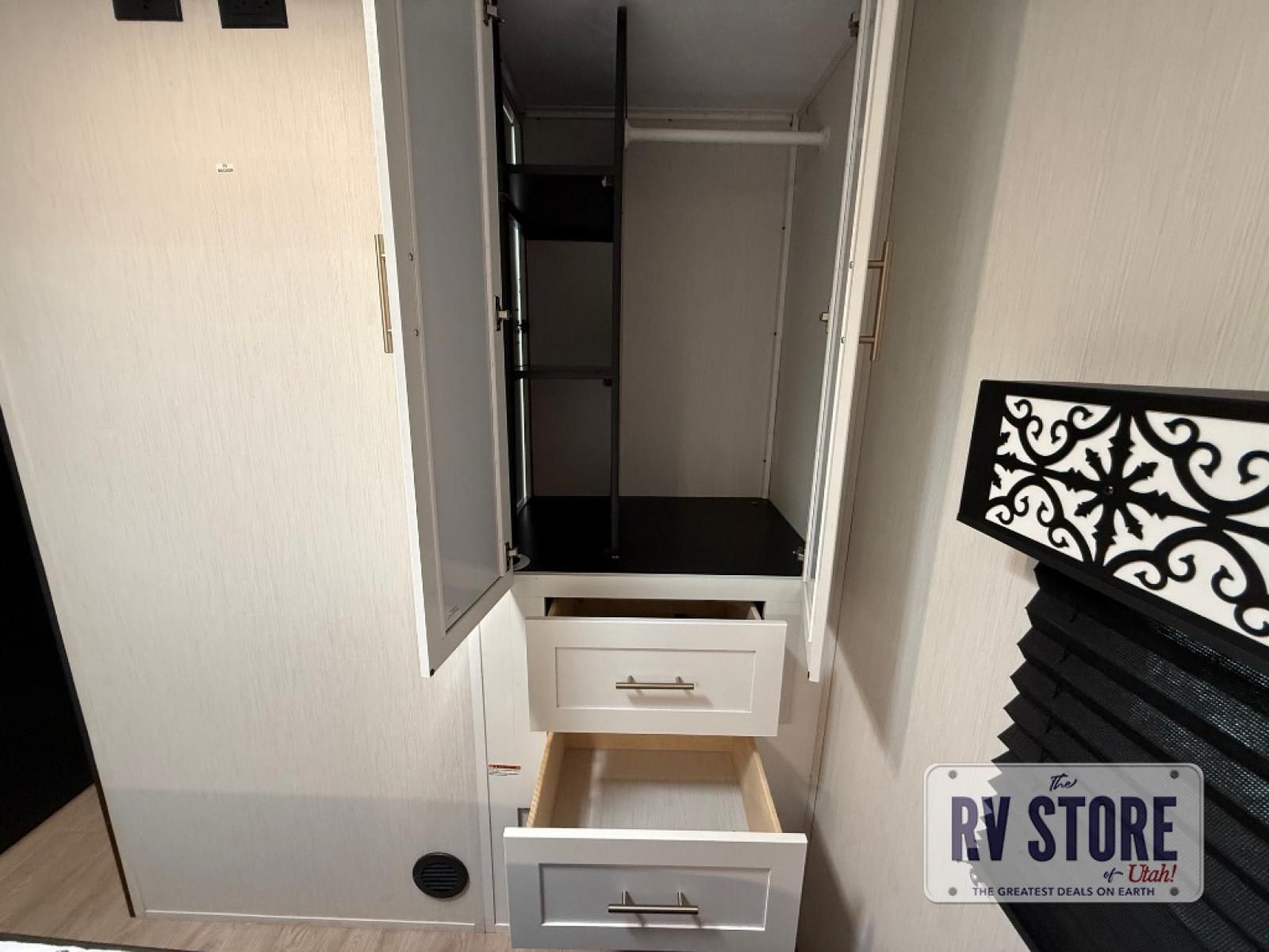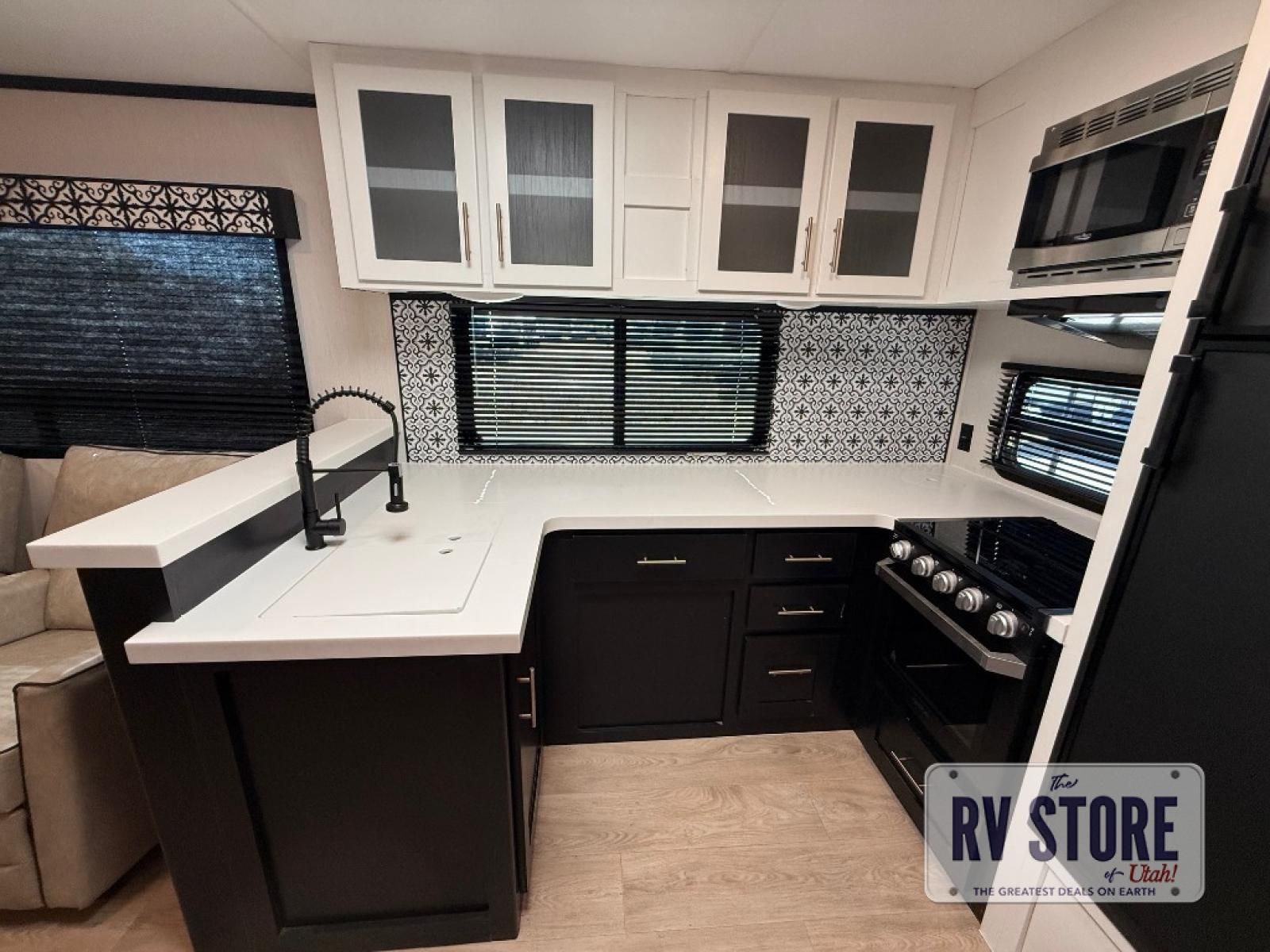 Pack your bags and head to your favorite state park in this travel trailer! The chef of the family will love their options to cook in the rear kitchen indoors, or use the outside kitchen that includes a refrigerator and a grill. Your crew can relax on the lounge chairs, the tri-fold sofa, or at the oversized dinette. This travel trailer also includes a fireplace with a 50" TV so you can enjoy a nice cozy evening watching your favorite movies, and the panoramic windows will let in tons of natural light during the daytime!