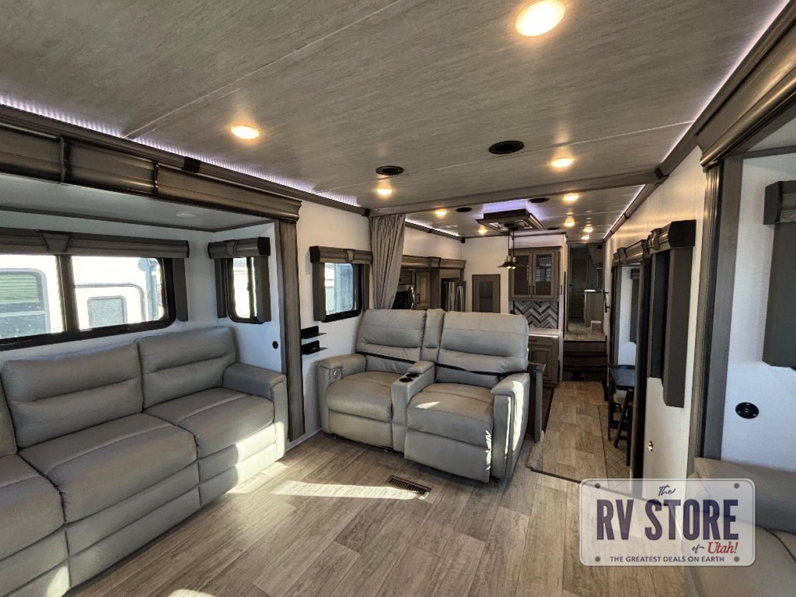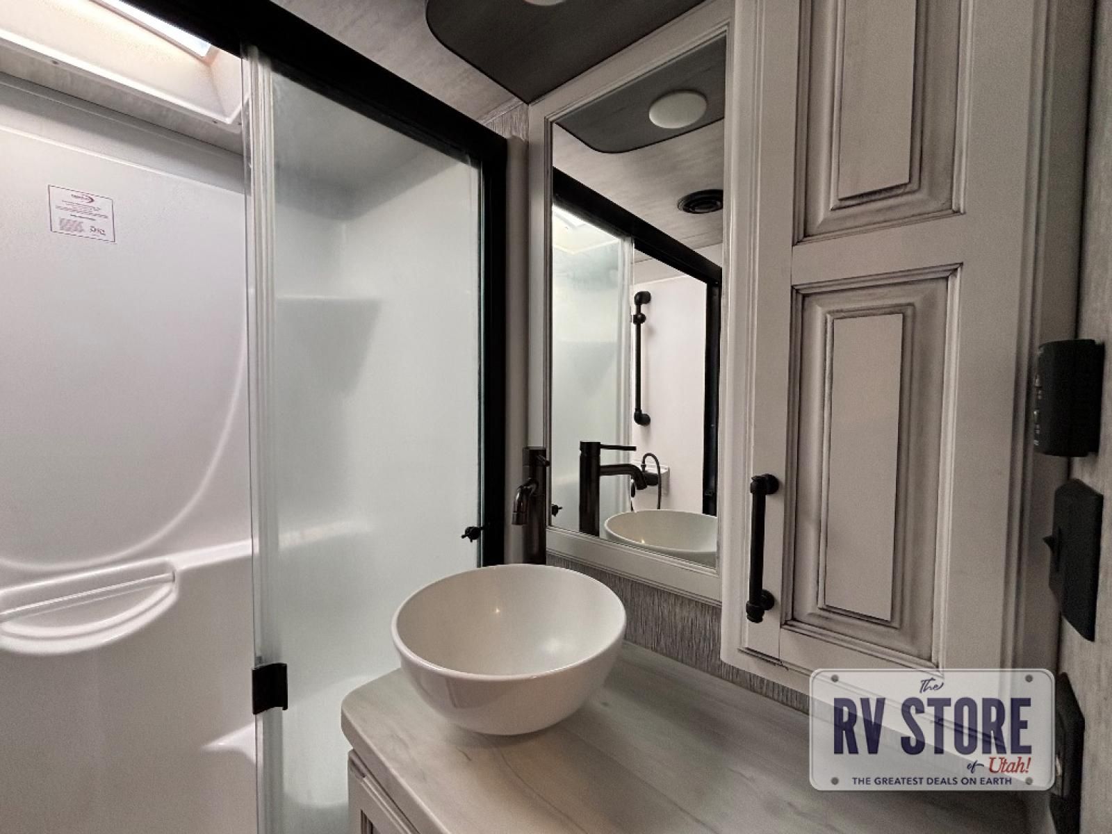 The coffee lover will enjoy camping in this fifth wheel with the coffee station in the kitchen! The kitchen also has an island, a large pantry, a glass top range with convection microwave and range hood that has a pull-down spice rack, a 18 cu. ft. residential refrigerator, and floor cabinets for your storage needs. Eat your meals and play card games at the free standing legless dinette with 110V outlets to charge your electronics. The separated living area has opposing hide-a-bed sofas and power Thomas Payne theater seating across from a rear entertainment center with a telescoping 50" LCD HDTV and a 5,000 BTU decorative fireplace heater with storage on either side. When you're ready to wind down your nights, head to the front private bedroom to enjoy a good night's rest on the king bed slide with storage underneath and there is a front closet with a clothing hamper and an area to add the optional stackable washer and dryer to have clean clothes for your longer trips!