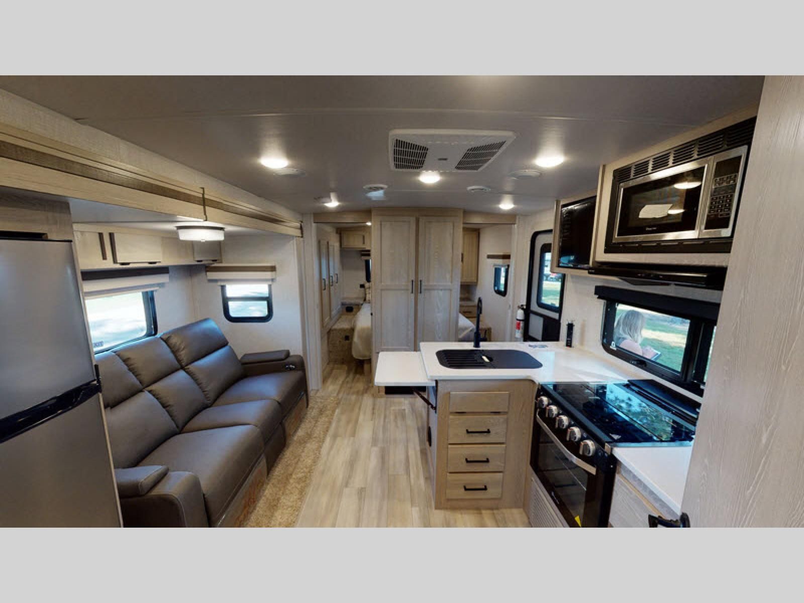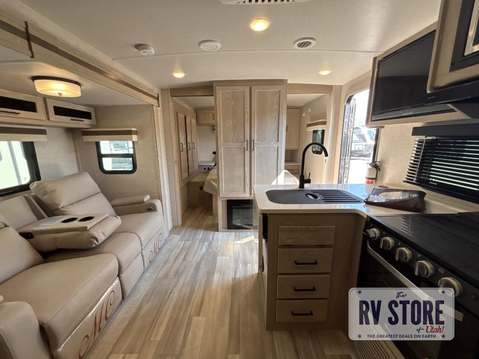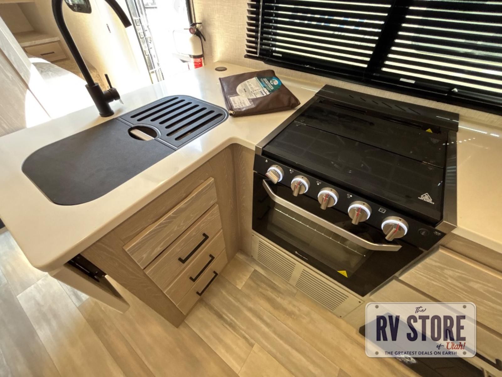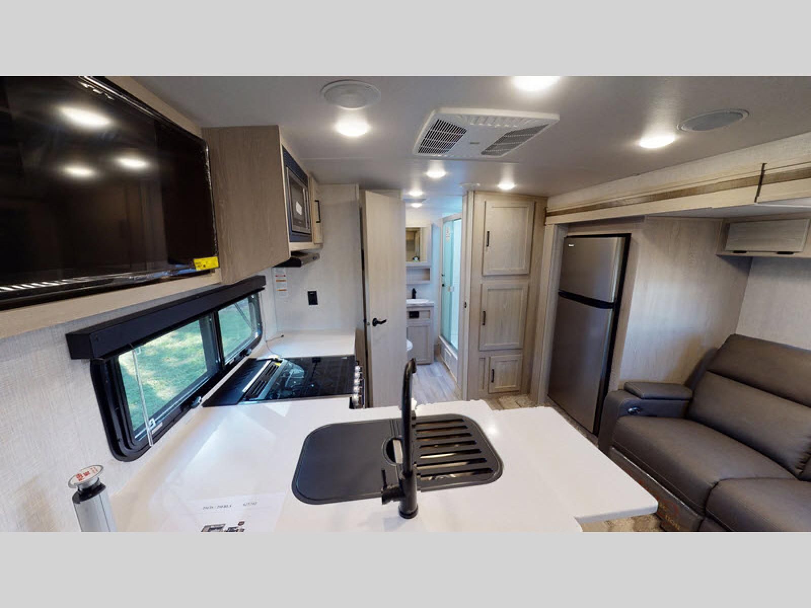 Inside, you’ll find a Murphy bed up front that folds down over a sofa, maximizing living space during the day while still offering a comfortable sleeping area at night. The kitchen is located in the rear and includes solid-surface countertops, a large refrigerator, three-burner cooktop, microwave, and plenty of cabinet storage.