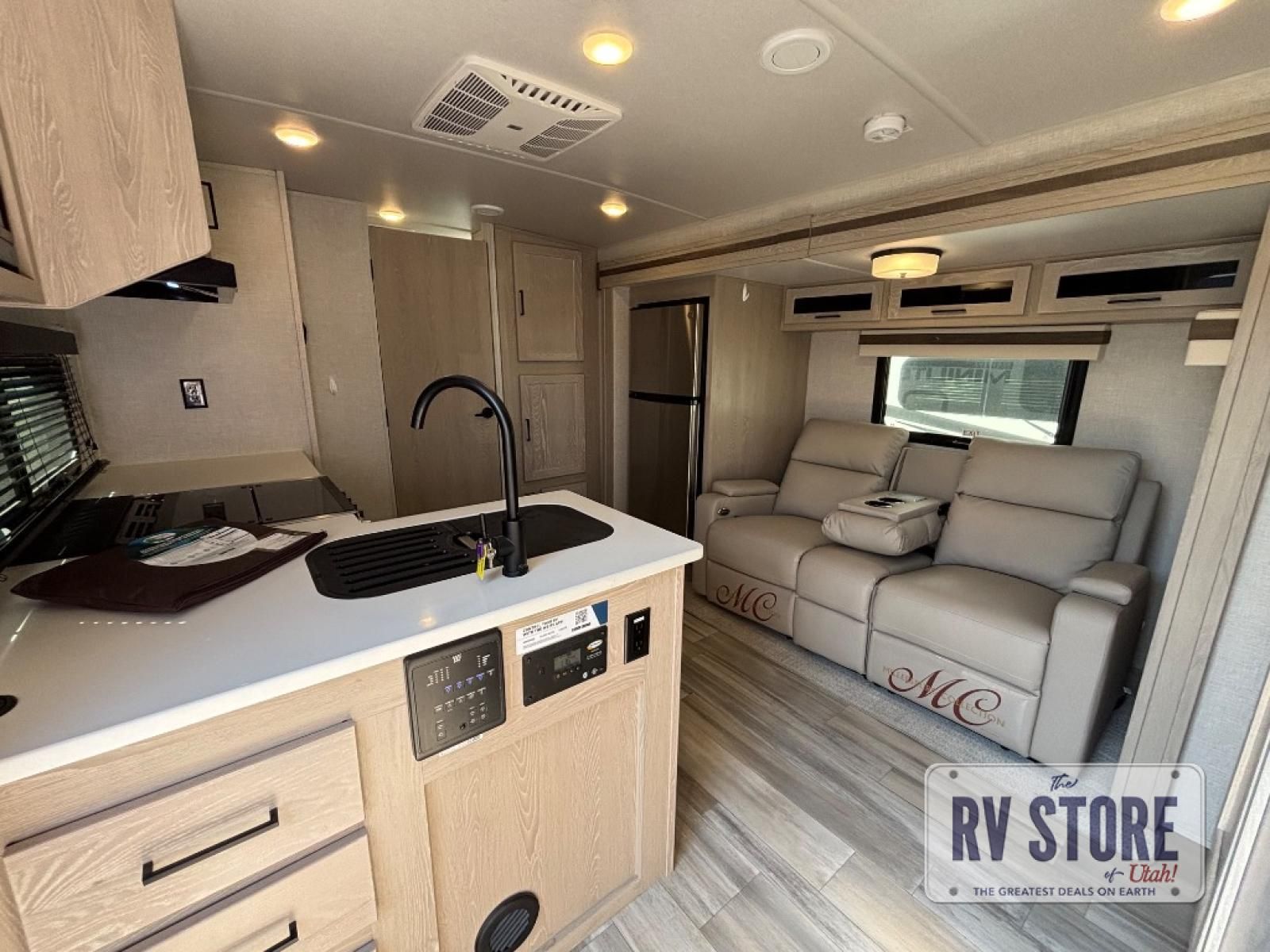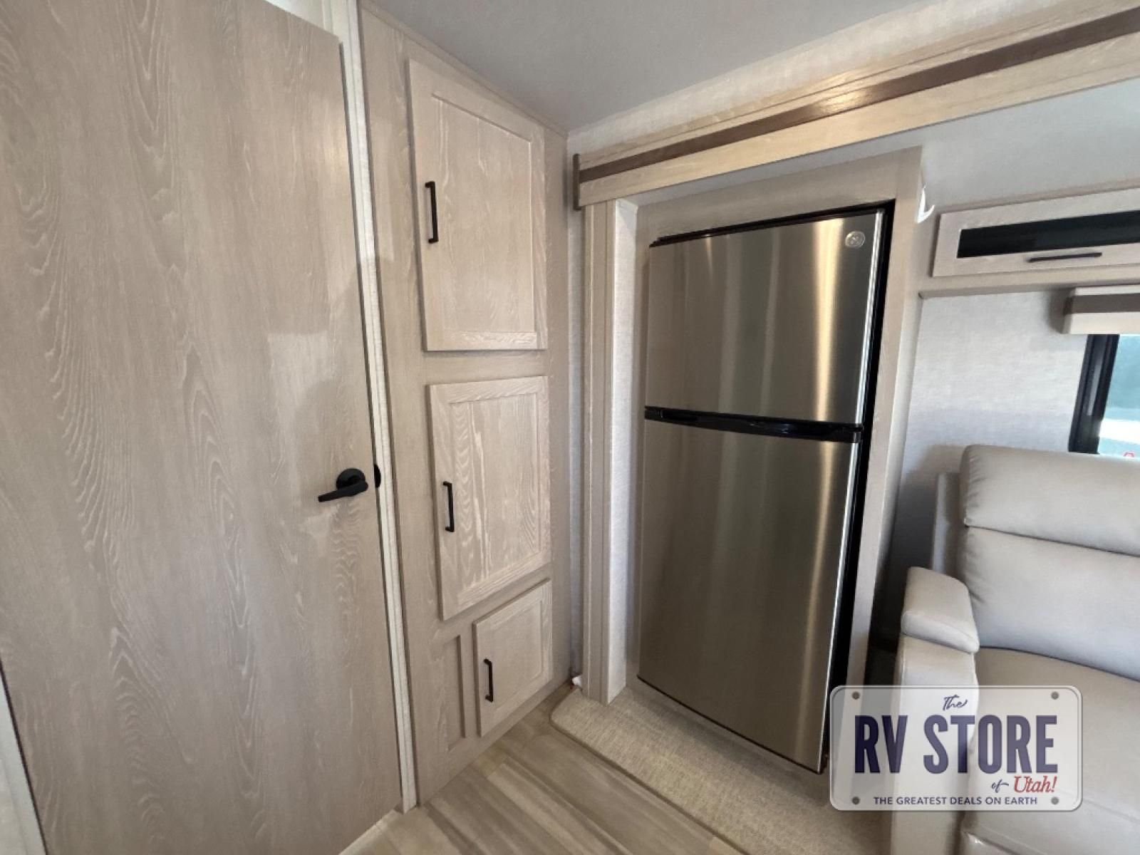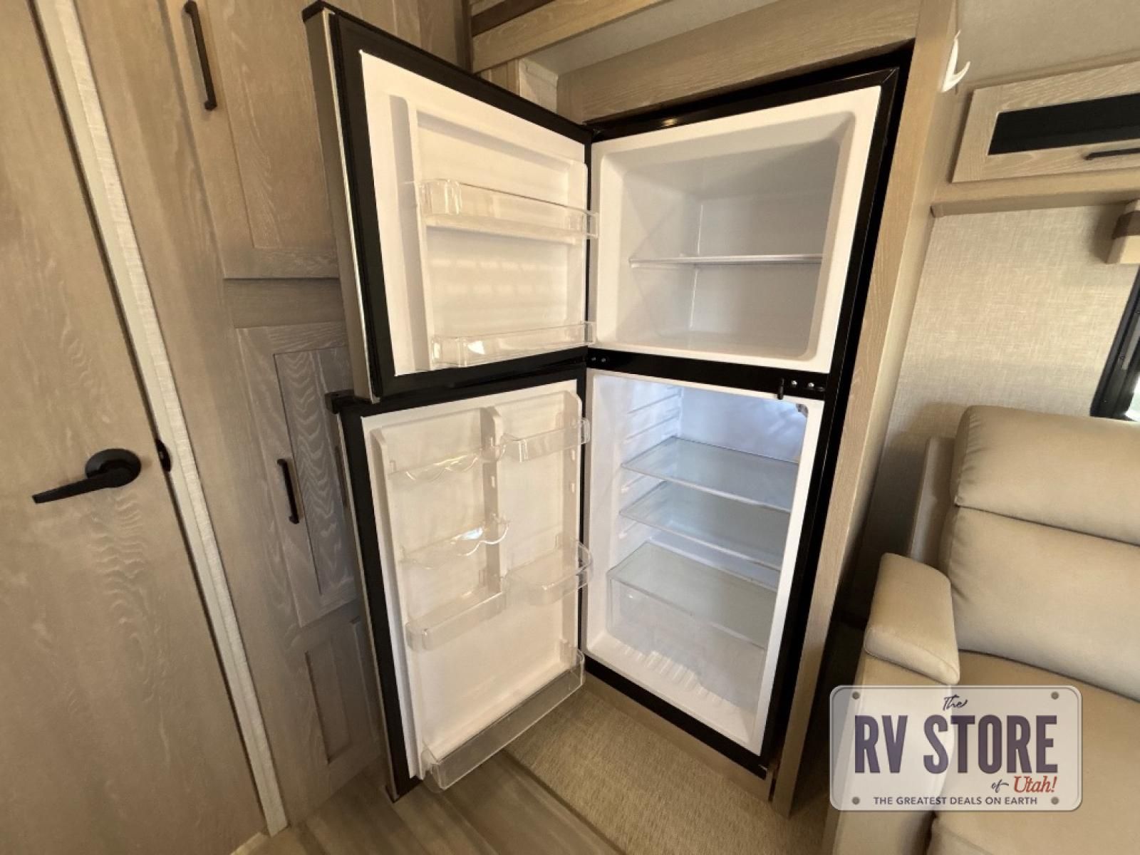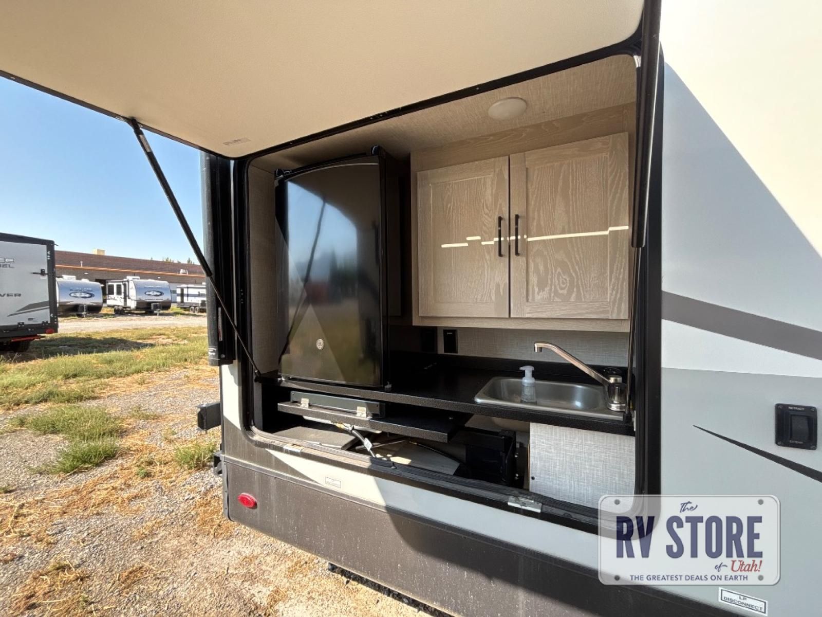 Inside, you’ll find a Murphy bed up front that folds down over a sofa, maximizing living space during the day while still offering a comfortable sleeping area at night. The kitchen is located in the rear and includes solid-surface countertops, a large refrigerator, three-burner cooktop, microwave, and plenty of cabinet storage.