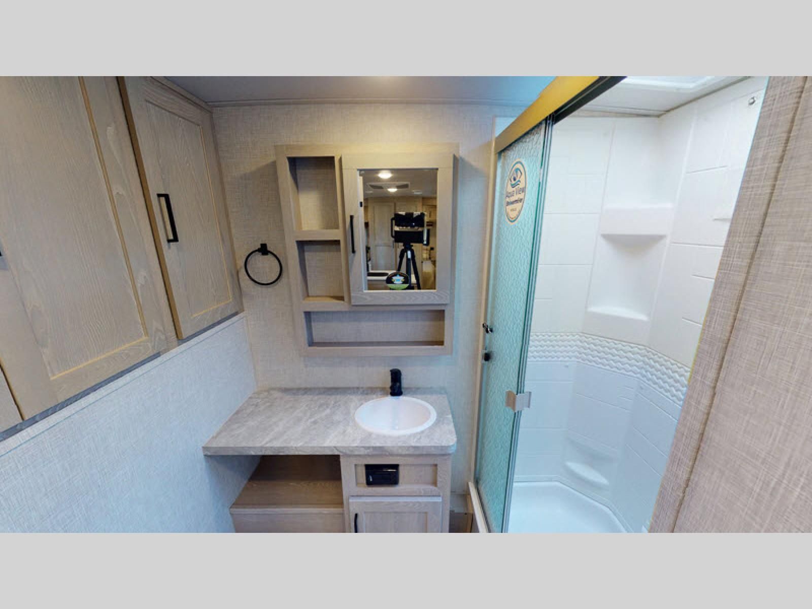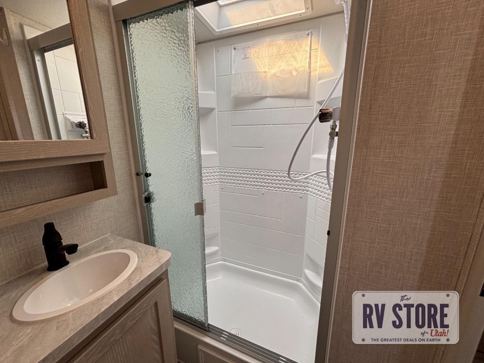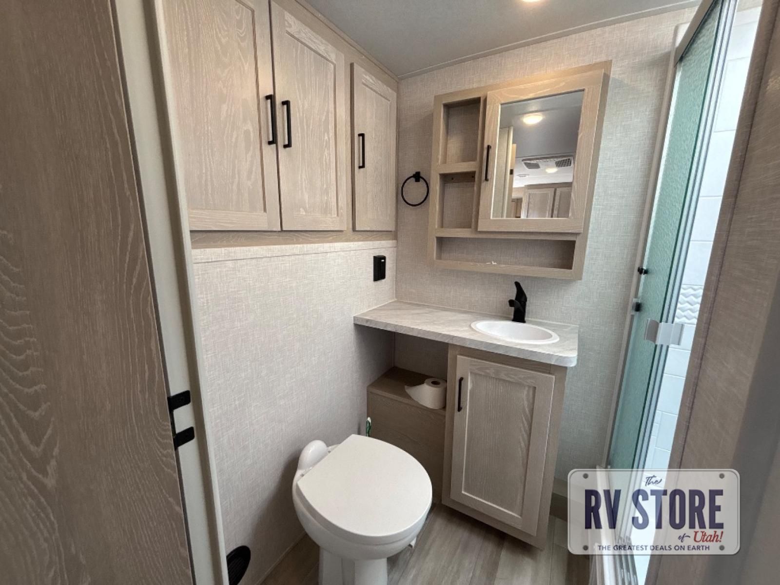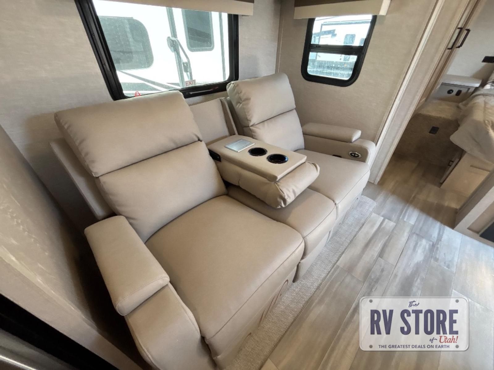 The living area features theater seating and a dinette for relaxing or entertaining. A full bathroom with shower, sink, and toilet provides self-contained convenience, while panoramic windows and LED lighting keep the space bright and inviting.