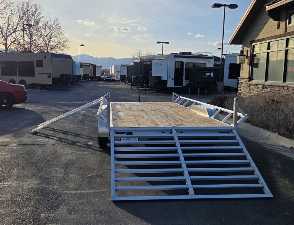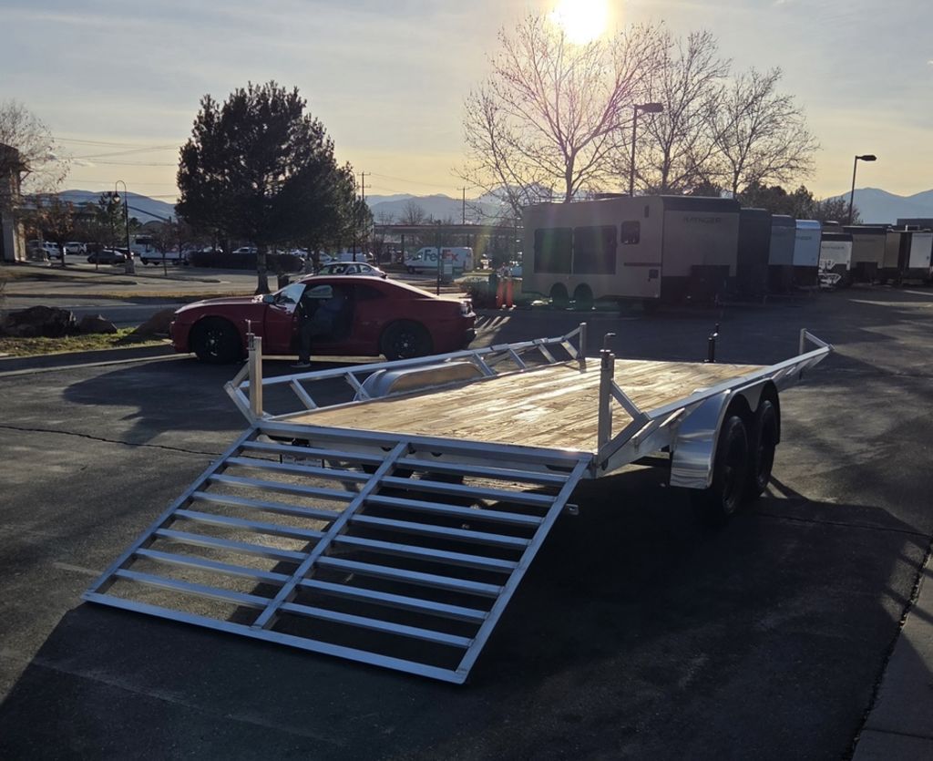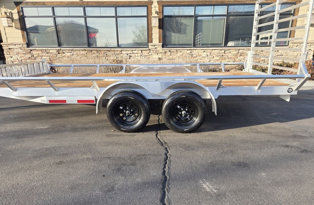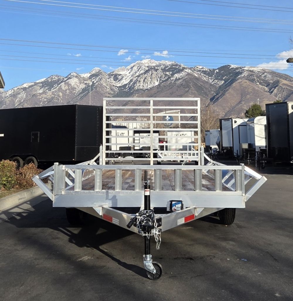 BRAND NEW Baughman Aluminum 7x16 UTV/ATV/Utility with Side LOAD Ramps AND Rear Ramp!! Angled Sides for easy side load and unload!! This is not your average trailer, this Premium Baughman comes with high strength aluminum welds, premium decking with recessed D rings for easy tie down, super light side ramps with built in storage, plus an easy to use pin locking ramp!! Did you know this trailer is light enough for most people to simply hand lift off your trailer ball!!?? Super light and easy to move around with built in tongue jack wheel!!! Recessed Lights, ALL Aluminum Deck, and More! Call or Text to come pick up this gorgeous trailer!! 7TL065164
