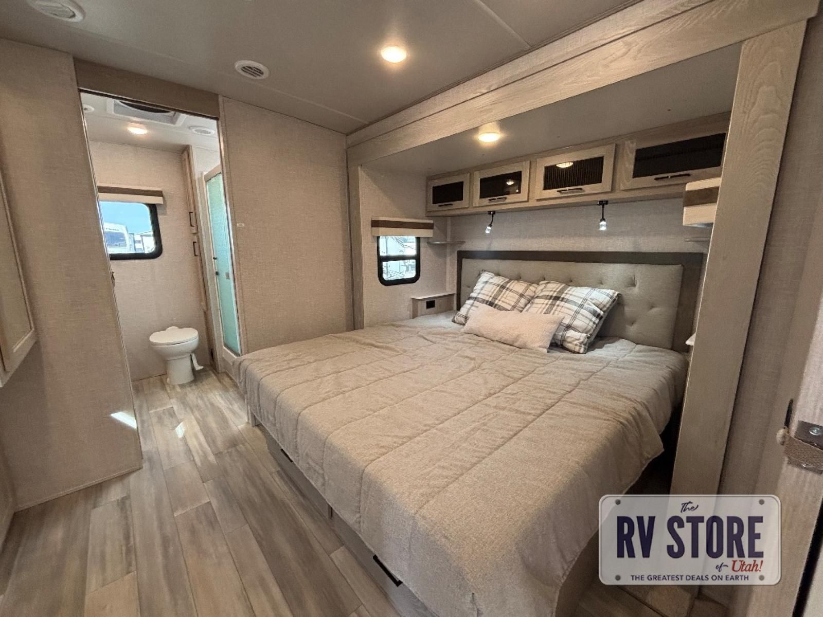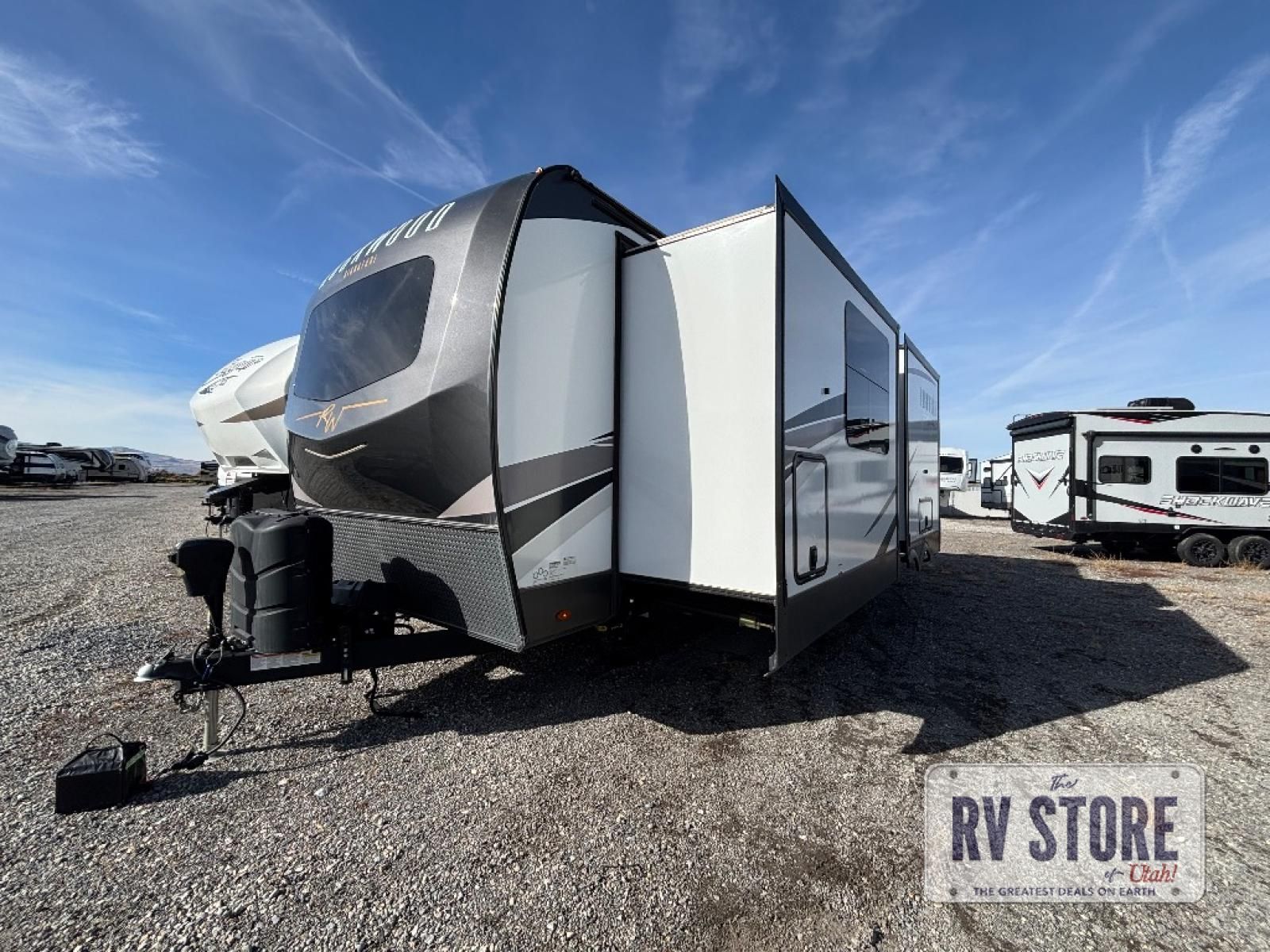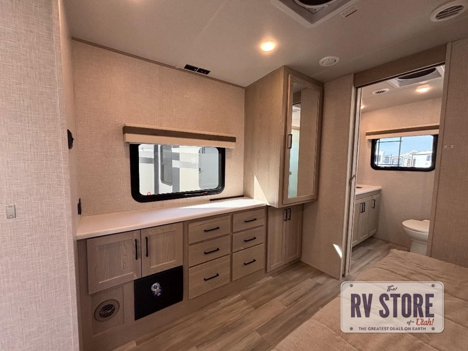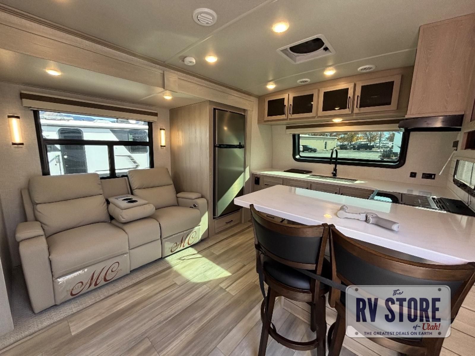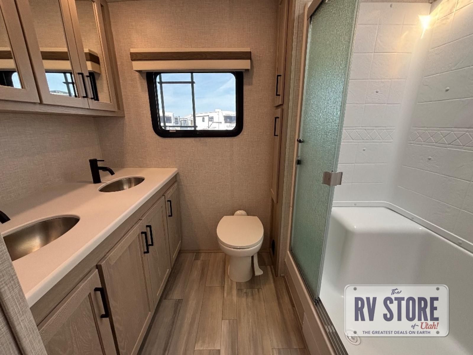 This front kitchen, couple's trailer is ready for adventure when you are! Once you arrive at your destination, prepare a quick lunch on the outside griddle, and enjoy the shade provided by the 19' power awning. You can eat outside, or inside at the counter with stools. The theatre seat will make this travel trailer feel more like home, and the double slides provide more space to stretch out. Within the master bedroom you'll find a king bed, a large wardrobe and a dresser, plus an optional TV. And check out the full rear bath with dual bath sinks and a shower with a seat! Now, that's what I call comfort!
