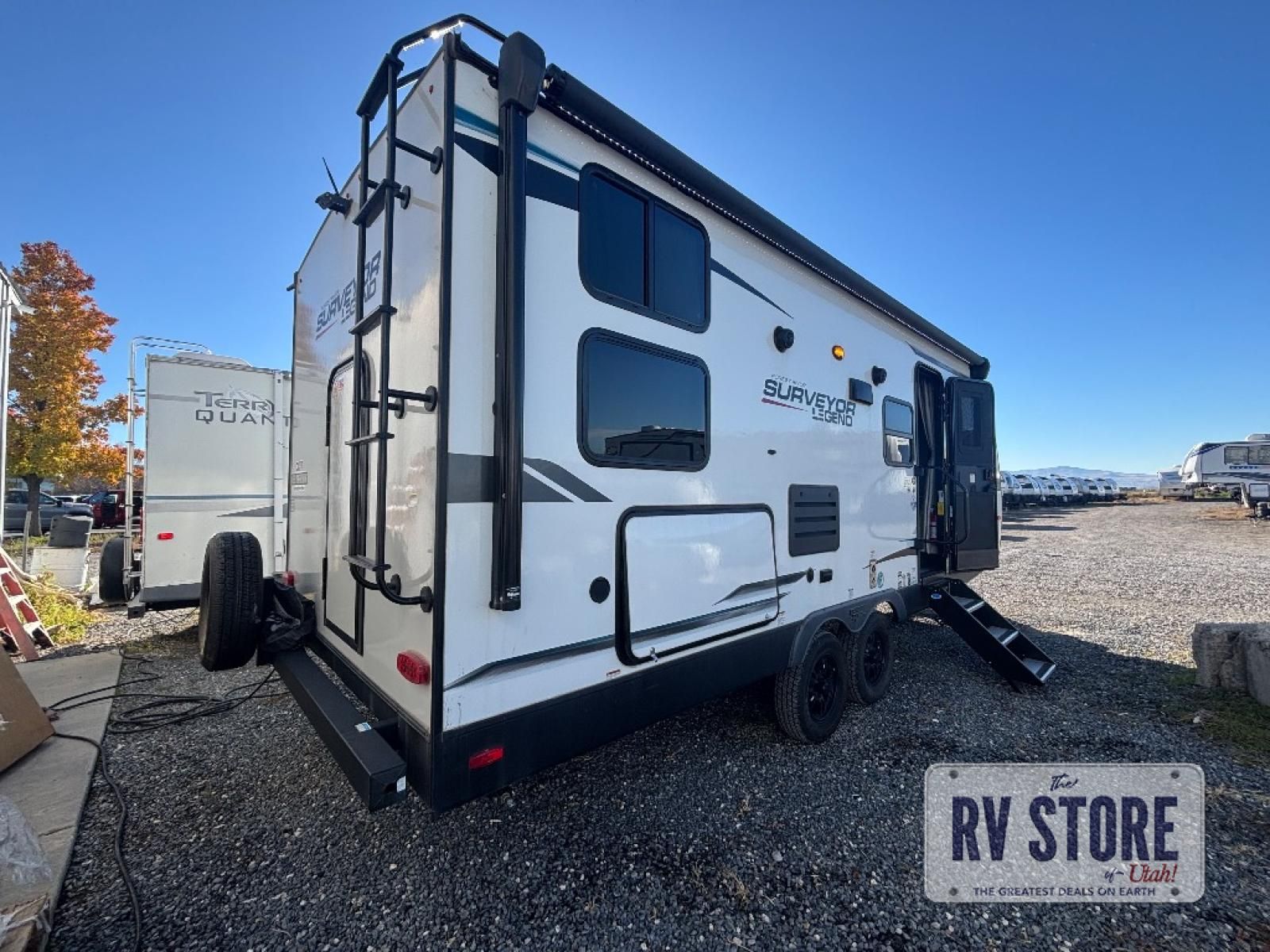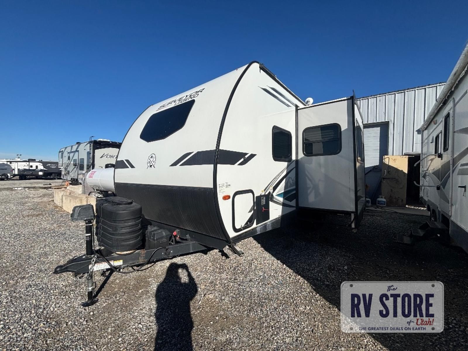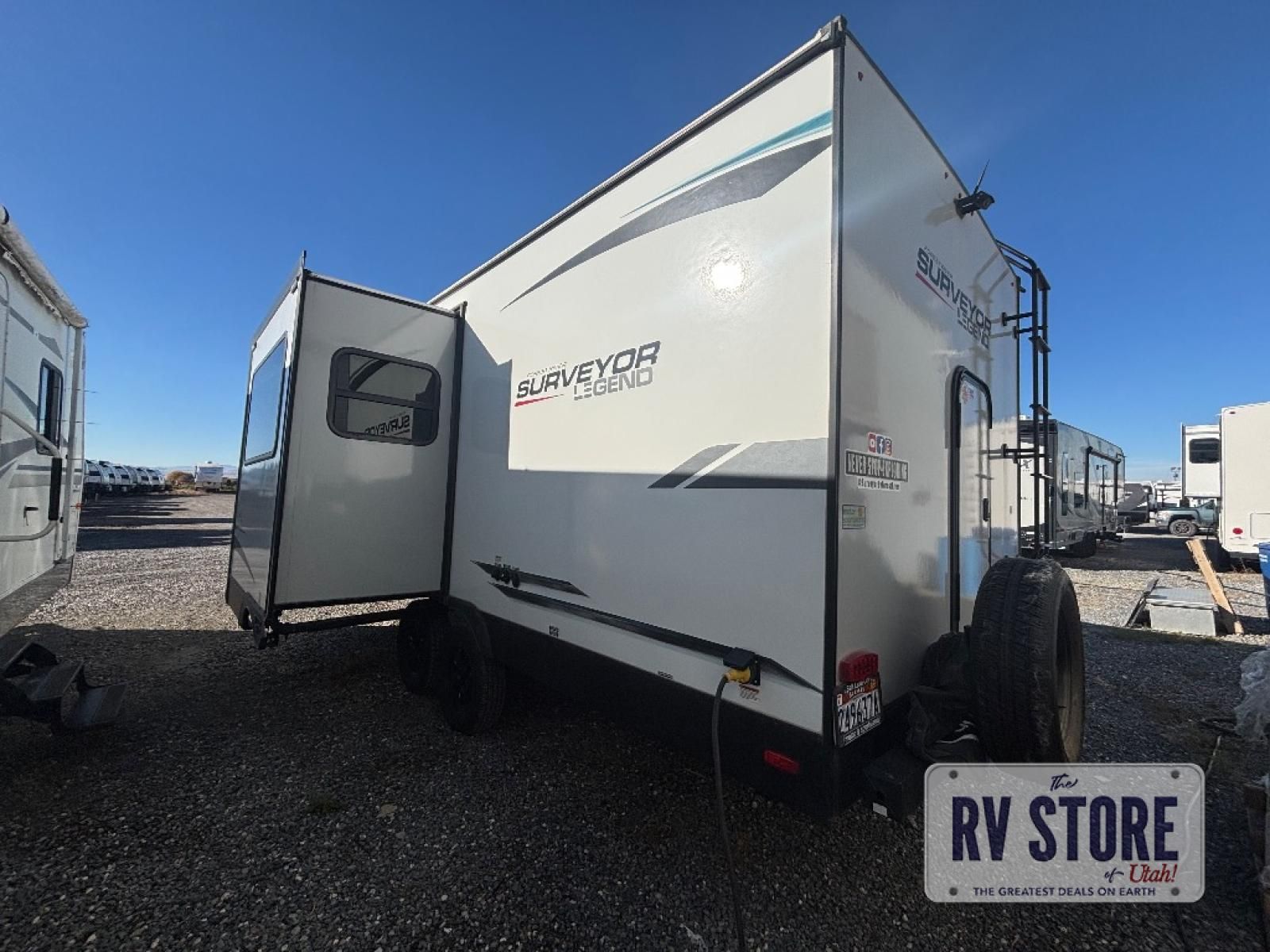 With any Surveyor Legend travel trailer by Forest River you will enjoy quality craftsmanship, convenient amenities, and at-home comforts. The Azdel composite panels provide a longer-lasting trailer, and the power tongue jack will get you back on the road in no-time. Each model includes the Surveyor Legend Package that comes standard with pleated night shades, an automotive style tinted front windshield, a multi-zone Bluetooth stereo, and more. You'll enjoy the one-touch electric awning with LED lights outdoors, plus rooftop solar prep and rear camera prep to make parking easier than ever. The inside will have you feeling right at home with Surf(x) seamless countertops, Congoleum designer carefree linoleum, residential faucets in the bath and kitchen, plus many more essentials you won't want to camp without.Â
