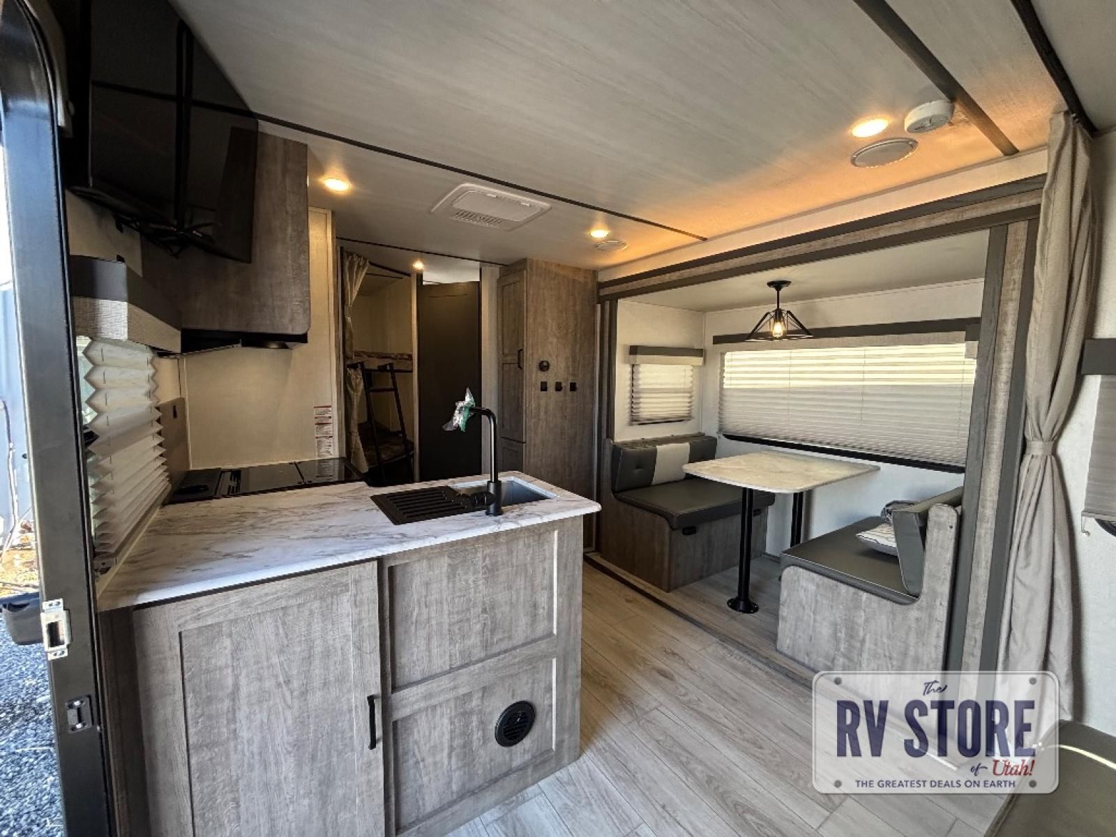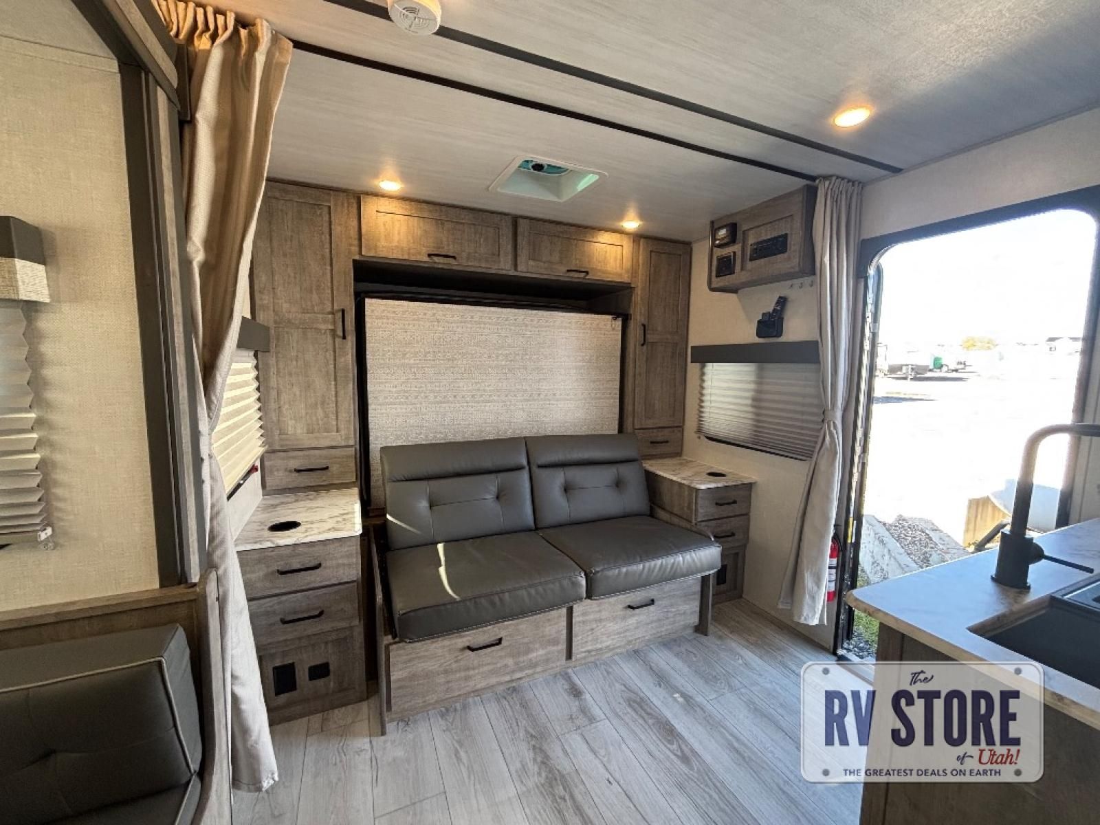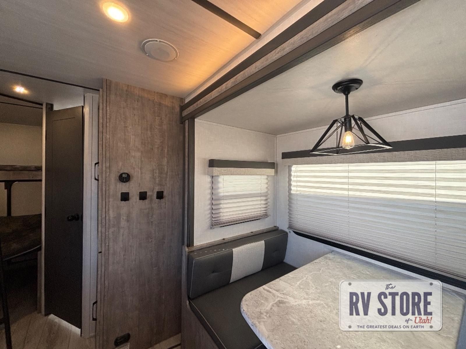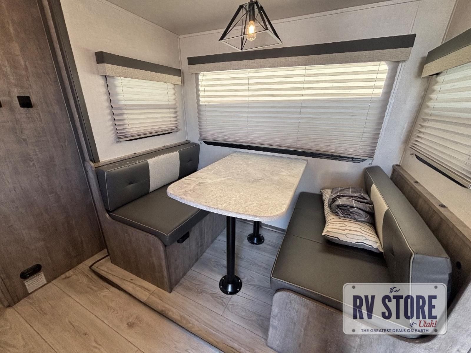 Every trip to the campground will be spent in comfort with this single slide out travel trailer. Once you arrive at the site, remove the kayaks or bikes from the rear storage door, start lunch on the outside kitchen, and put out the 15' power awning with LED lights. The interior includes a booth dinette slide with EZ access storage, a bar top with stools, plus an HD LED TV for movie nights. After a day of fun, head to the front private bedroom for a great night's rest on the queen bed, and you can store your belongings in the dual bedroom wardrobes!