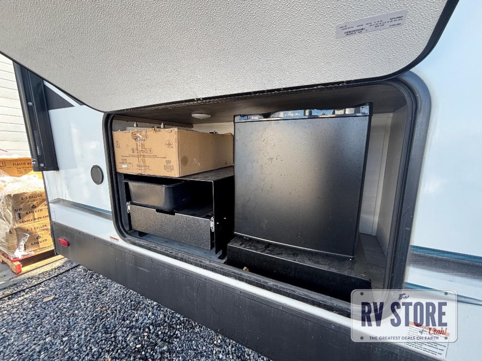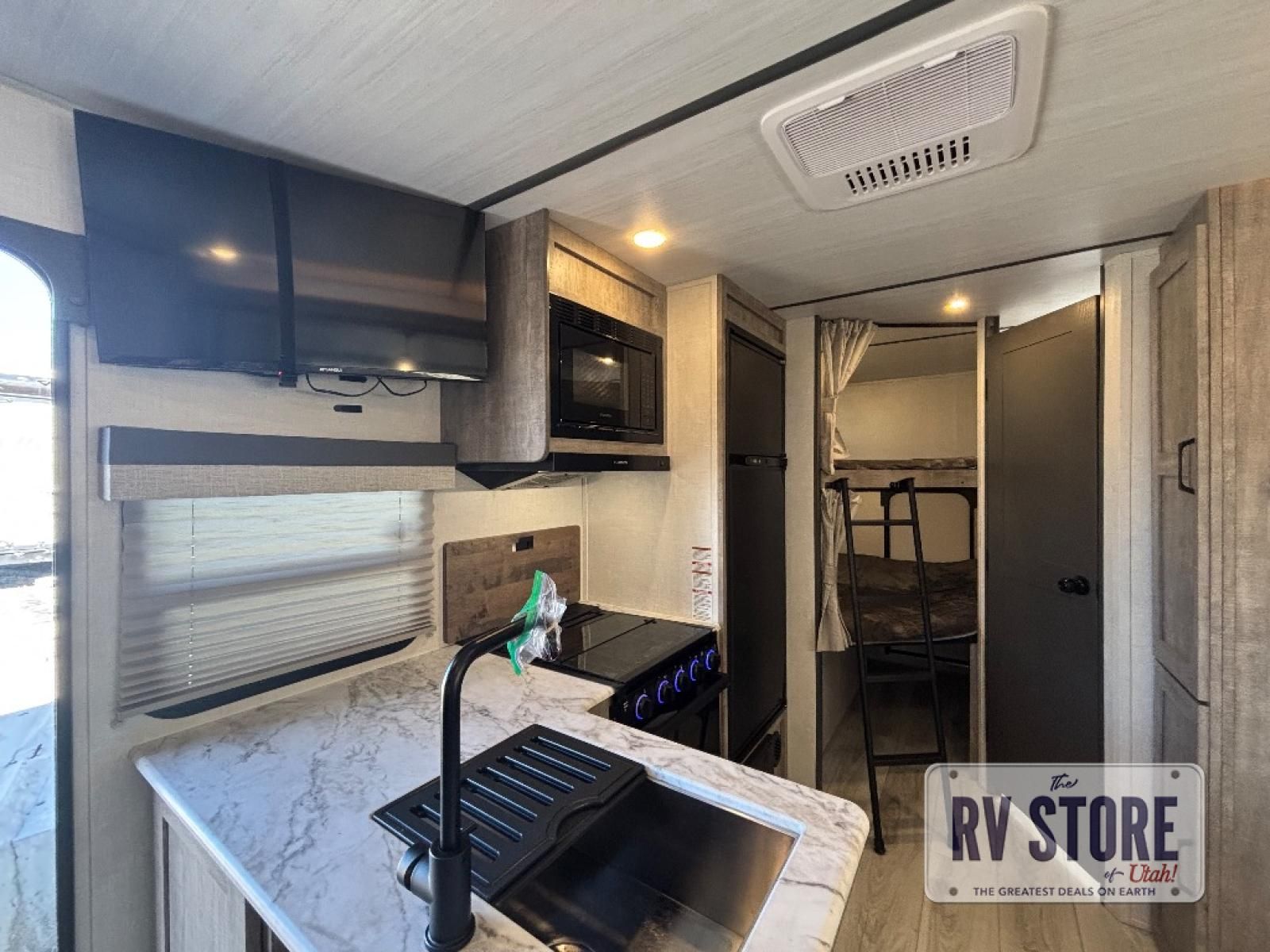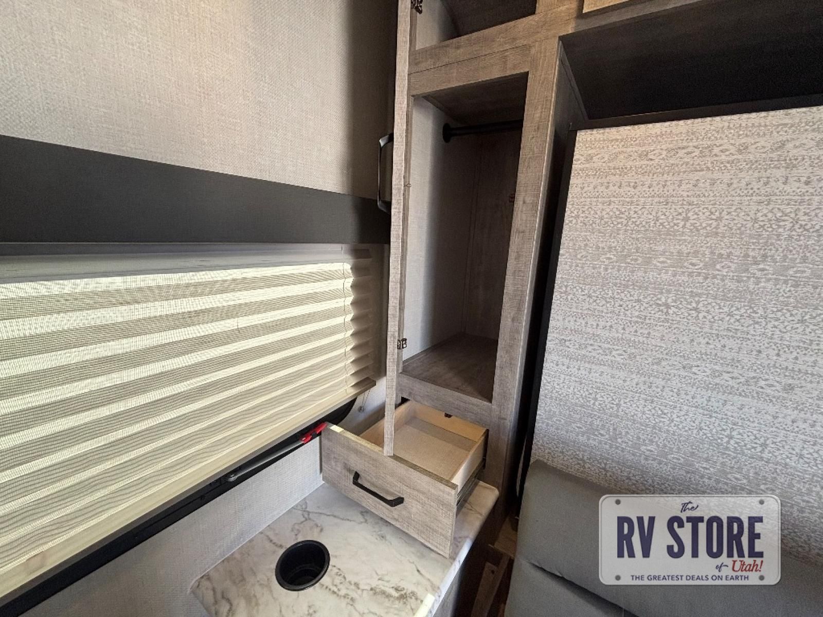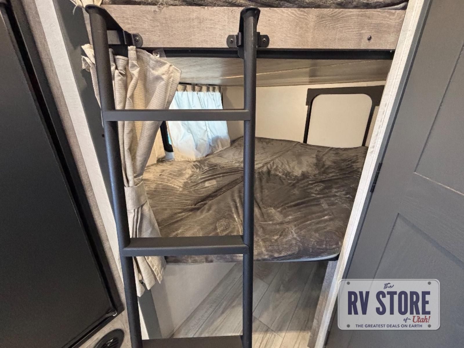 Every trip to the campground will be spent in comfort with this single slide out travel trailer. Once you arrive at the site, remove the kayaks or bikes from the rear storage door, start lunch on the outside kitchen, and put out the 15' power awning with LED lights. The interior includes a booth dinette slide with EZ access storage, a bar top with stools, plus an HD LED TV for movie nights. After a day of fun, head to the front private bedroom for a great night's rest on the queen bed, and you can store your belongings in the dual bedroom wardrobes!