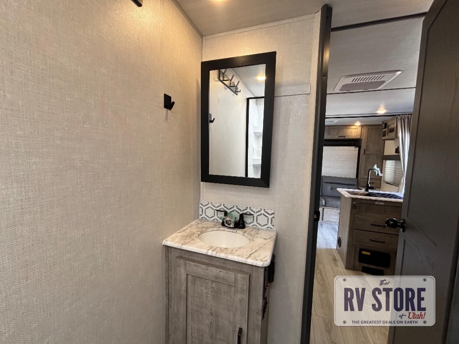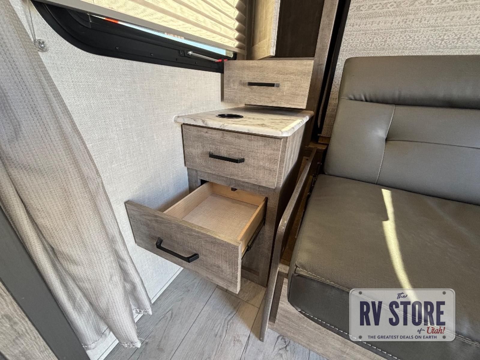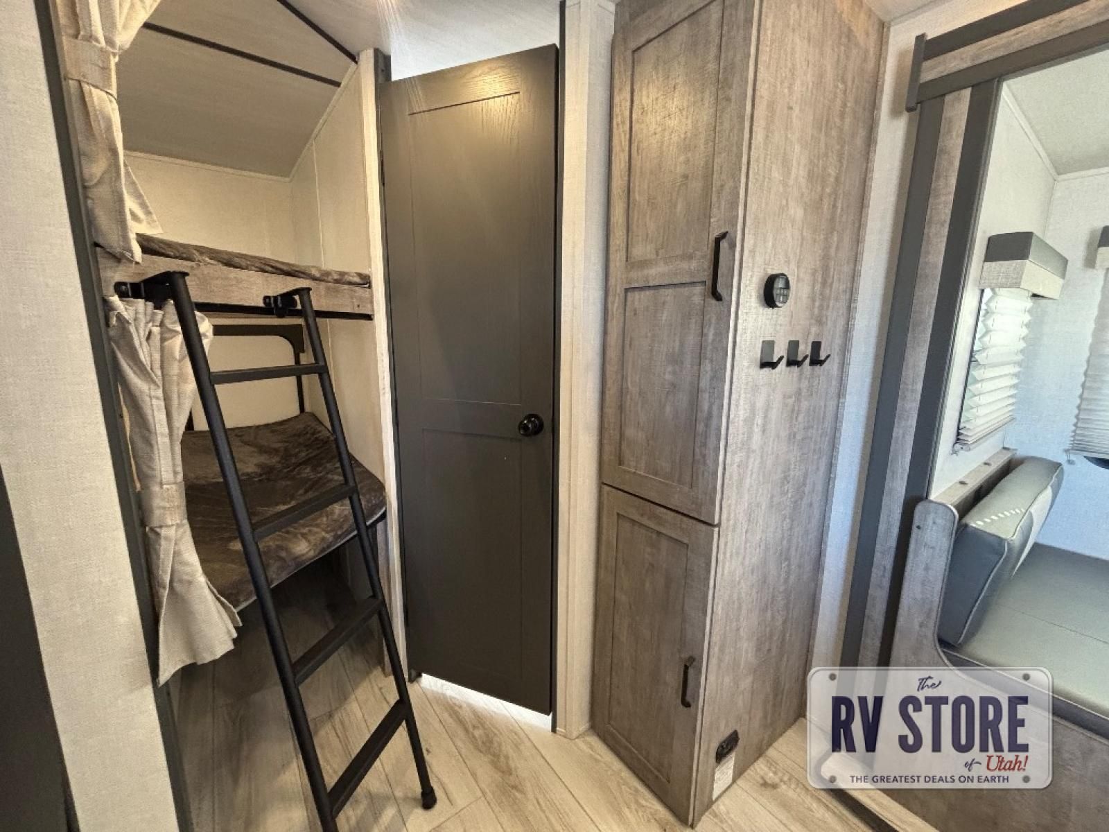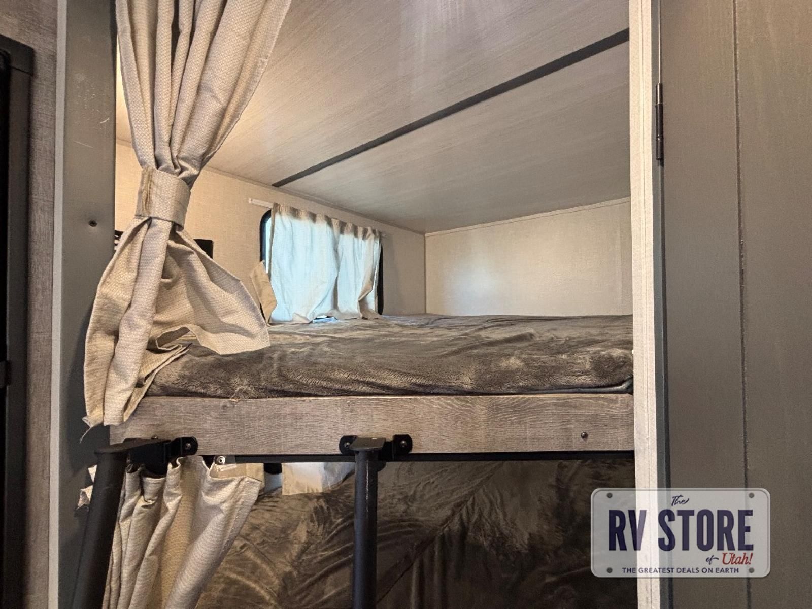 Every trip to the campground will be spent in comfort with this single slide out travel trailer. Once you arrive at the site, remove the kayaks or bikes from the rear storage door, start lunch on the outside kitchen, and put out the 15' power awning with LED lights. The interior includes a booth dinette slide with EZ access storage, a bar top with stools, plus an HD LED TV for movie nights. After a day of fun, head to the front private bedroom for a great night's rest on the queen bed, and you can store your belongings in the dual bedroom wardrobes!