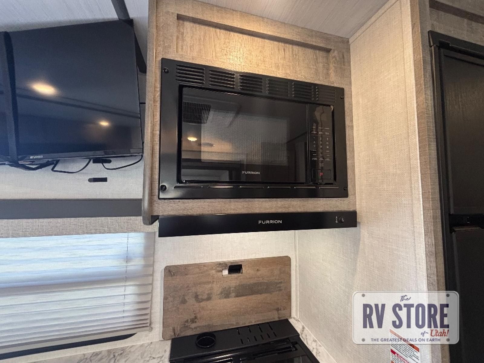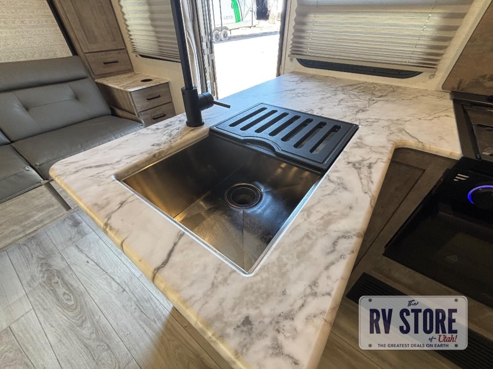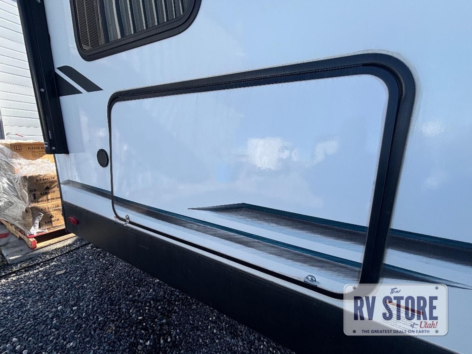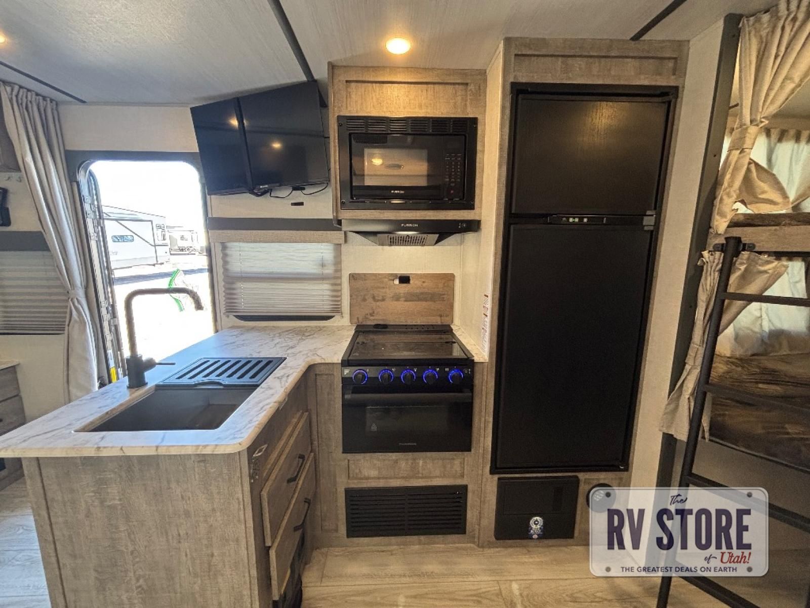 Every trip to the campground will be spent in comfort with this single slide out travel trailer. Once you arrive at the site, remove the kayaks or bikes from the rear storage door, start lunch on the outside kitchen, and put out the 15' power awning with LED lights. The interior includes a booth dinette slide with EZ access storage, a bar top with stools, plus an HD LED TV for movie nights. After a day of fun, head to the front private bedroom for a great night's rest on the queen bed, and you can store your belongings in the dual bedroom wardrobes!