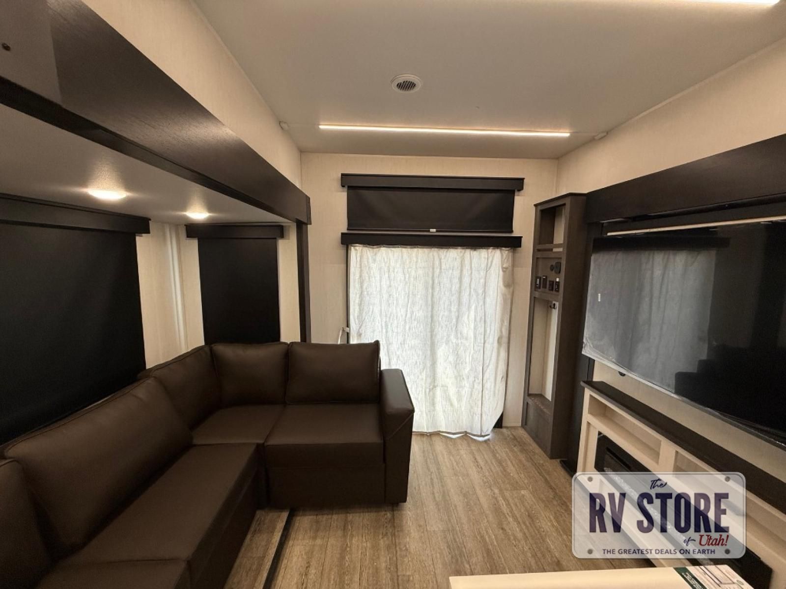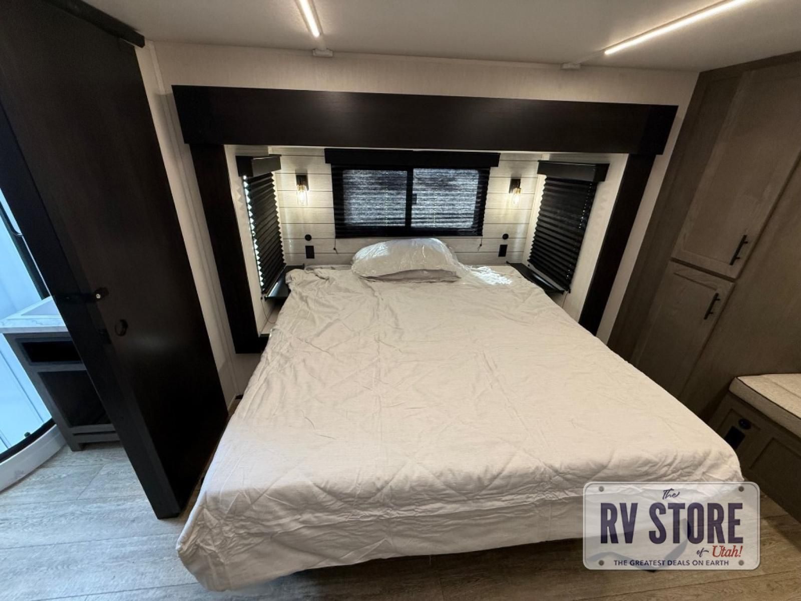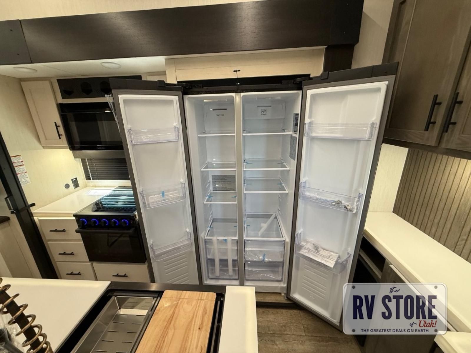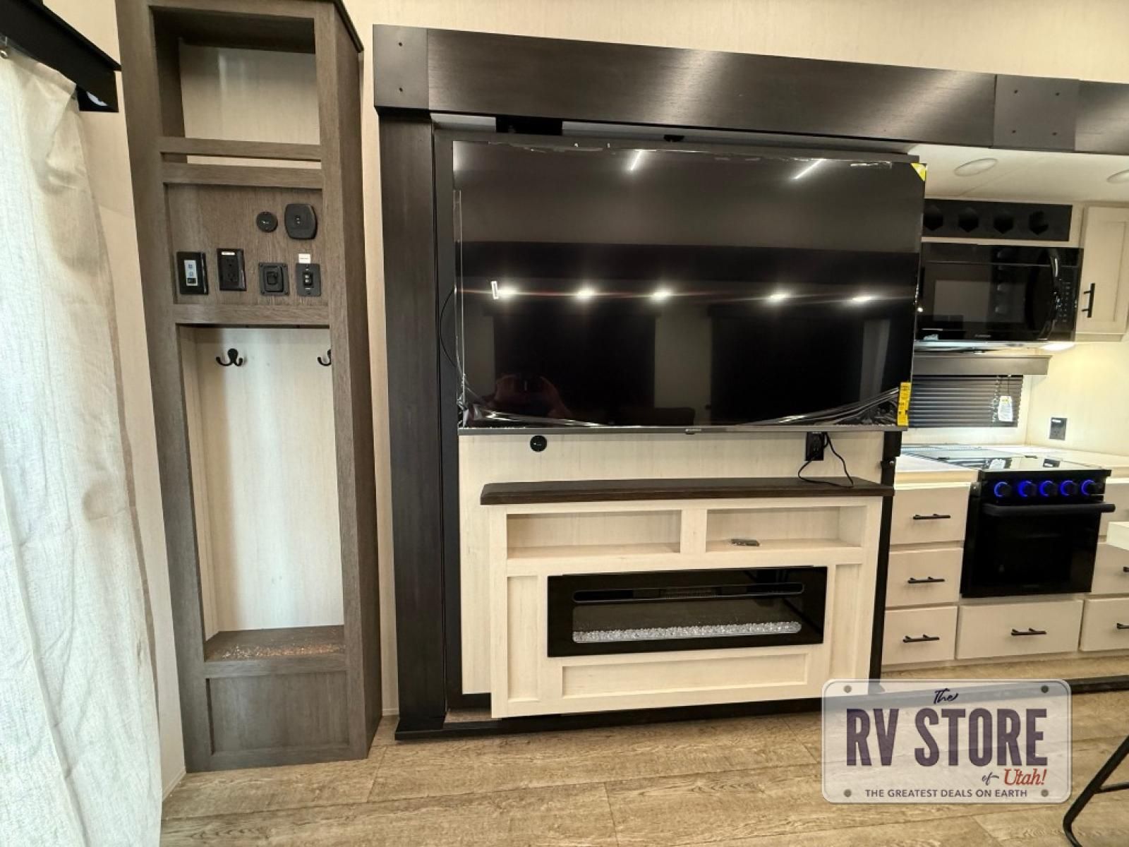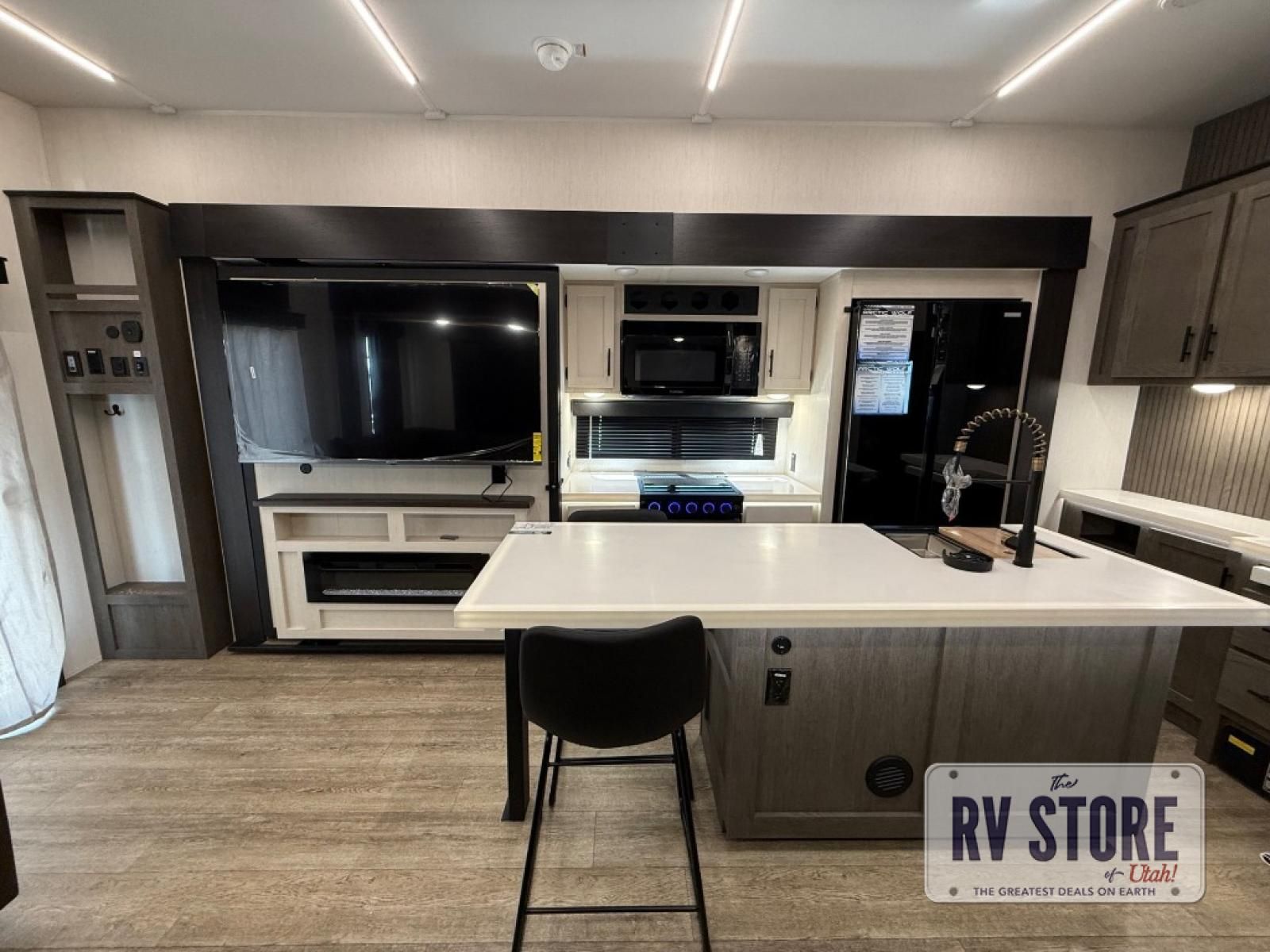 You're going to love camping in this triple slide out fifth wheel that is packed with amenities! The rear deck with a covered patio will provide a place to visit with campground neighbors, and inside, there is an L-shaped tri-fold sofa where guests can sleep. You'll find a king bed slide in the front master bedroom for you, along with a front bench seat, a bedroom fireplace, plus washer and dryer prep if you choose to add these appliances. The kitchen is any chef's dream with its large island with two chairs, pull-out countertop extension, spacious 16 cu. ft. refrigerator, plus a hidden pantry behind the TV for all the dry goods.