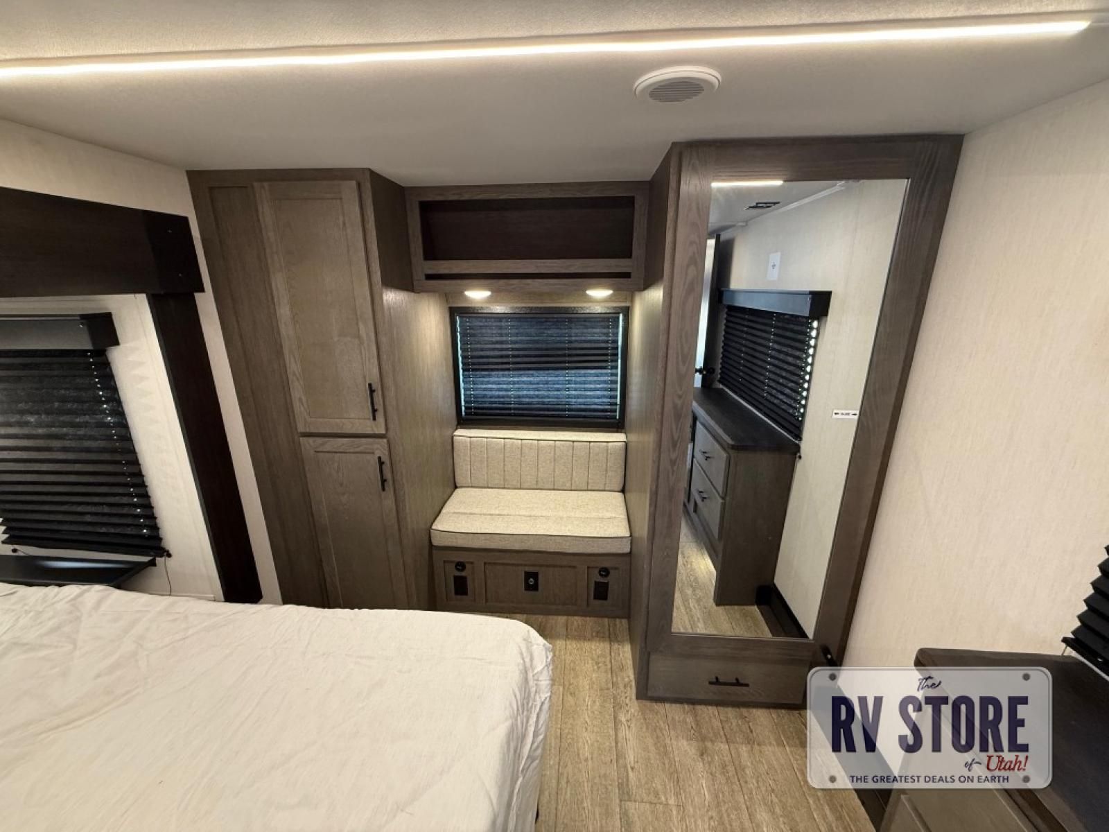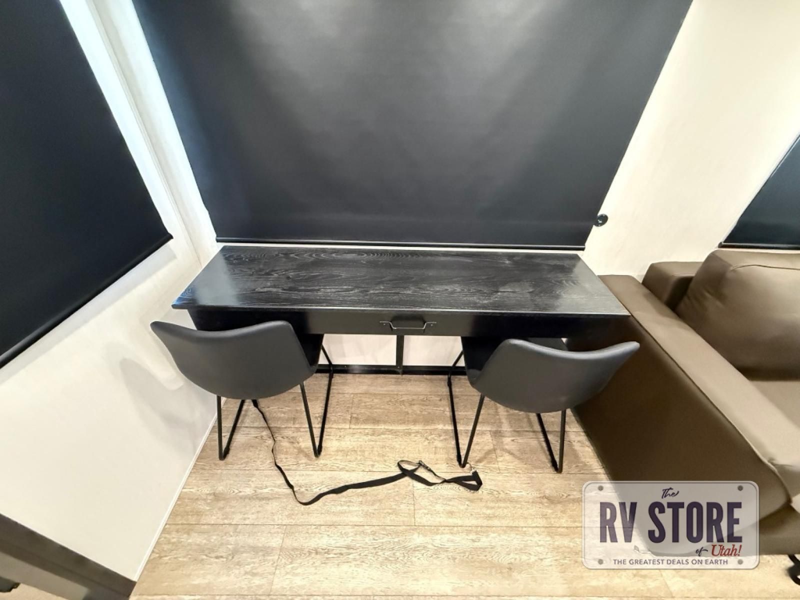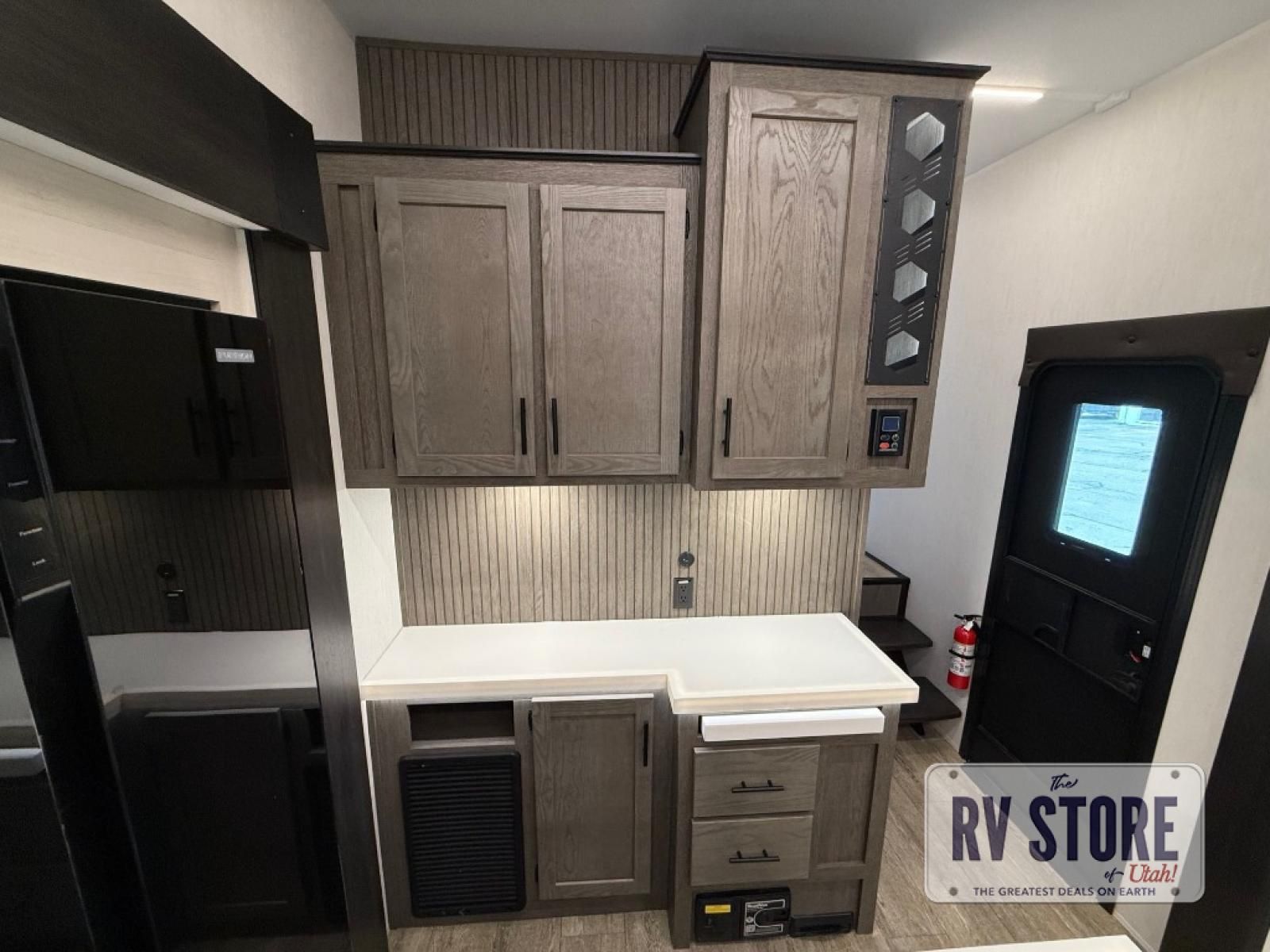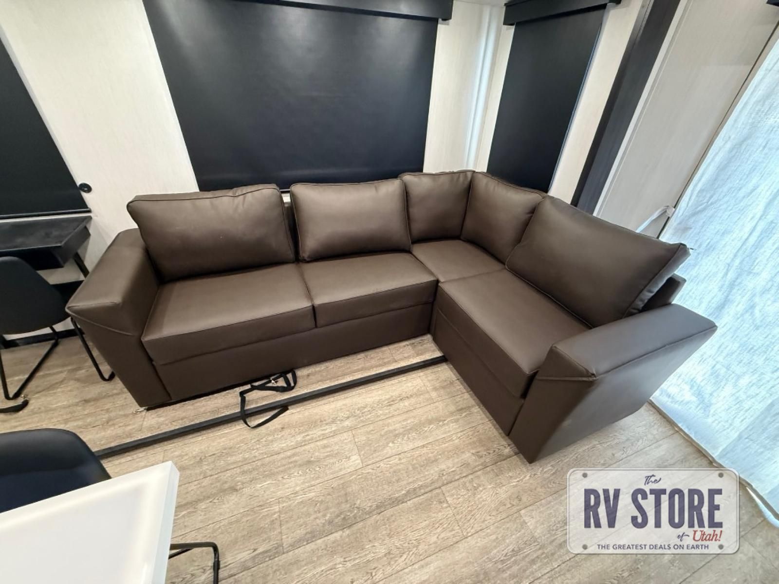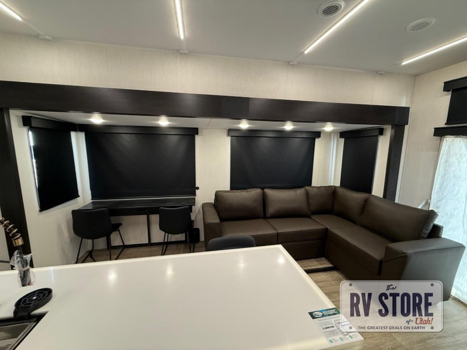 You're going to love camping in this triple slide out fifth wheel that is packed with amenities! The rear deck with a covered patio will provide a place to visit with campground neighbors, and inside, there is an L-shaped tri-fold sofa where guests can sleep. You'll find a king bed slide in the front master bedroom for you, along with a front bench seat, a bedroom fireplace, plus washer and dryer prep if you choose to add these appliances. The kitchen is any chef's dream with its large island with two chairs, pull-out countertop extension, spacious 16 cu. ft. refrigerator, plus a hidden pantry behind the TV for all the dry goods.