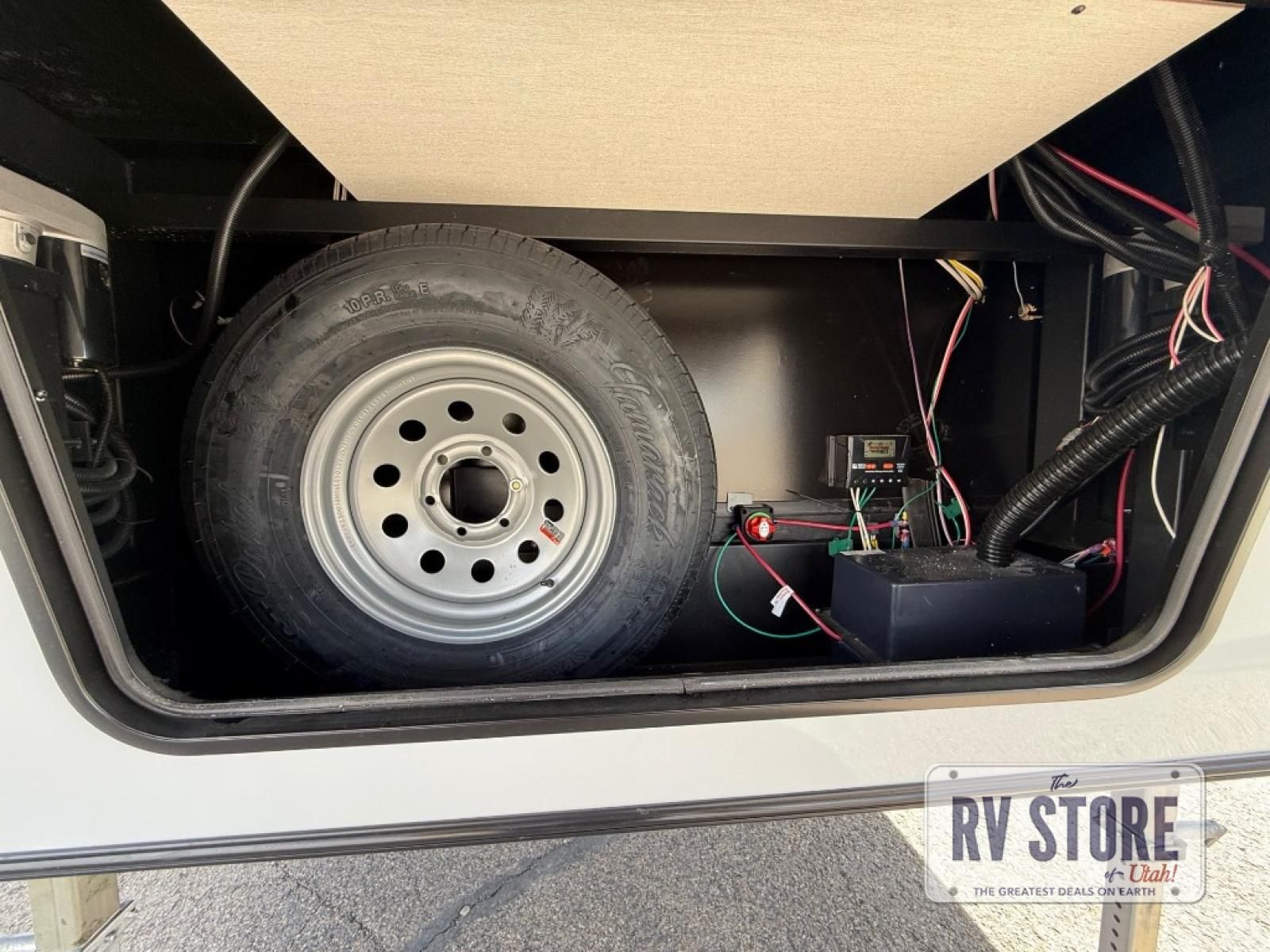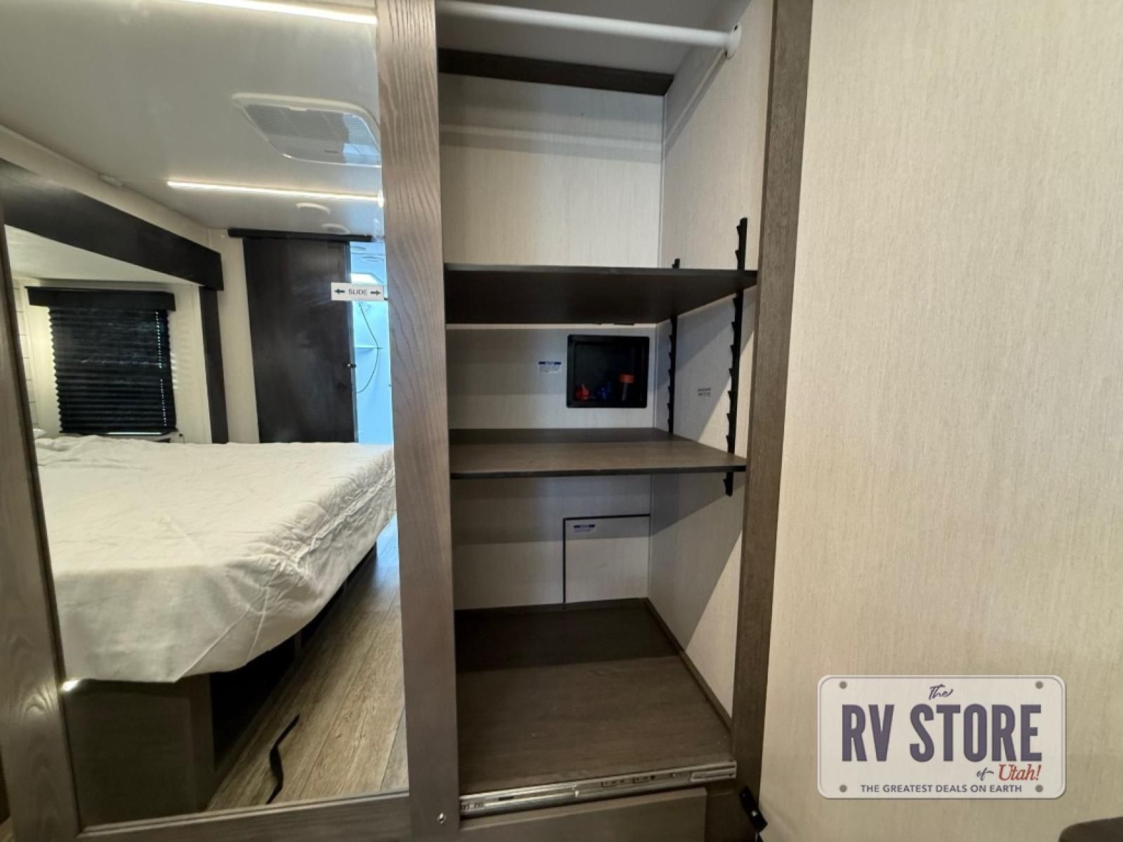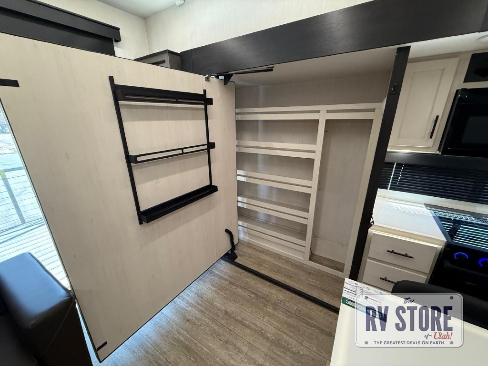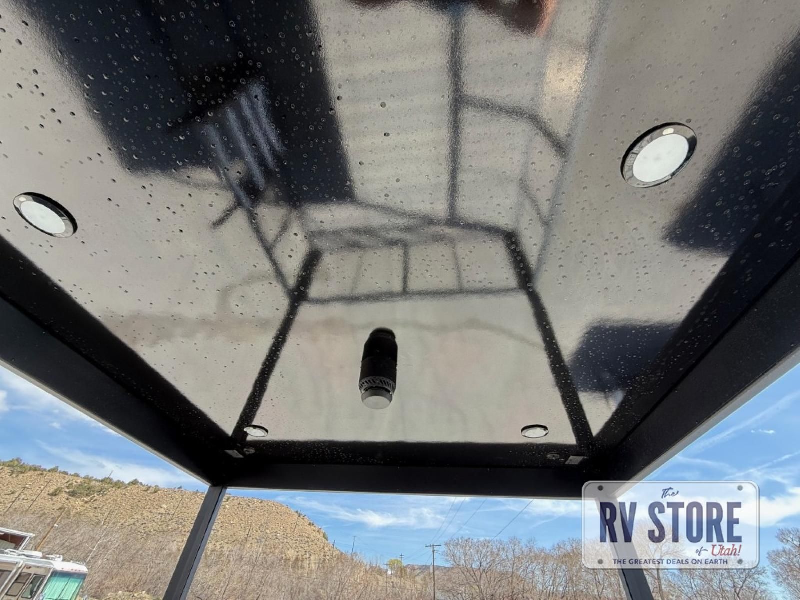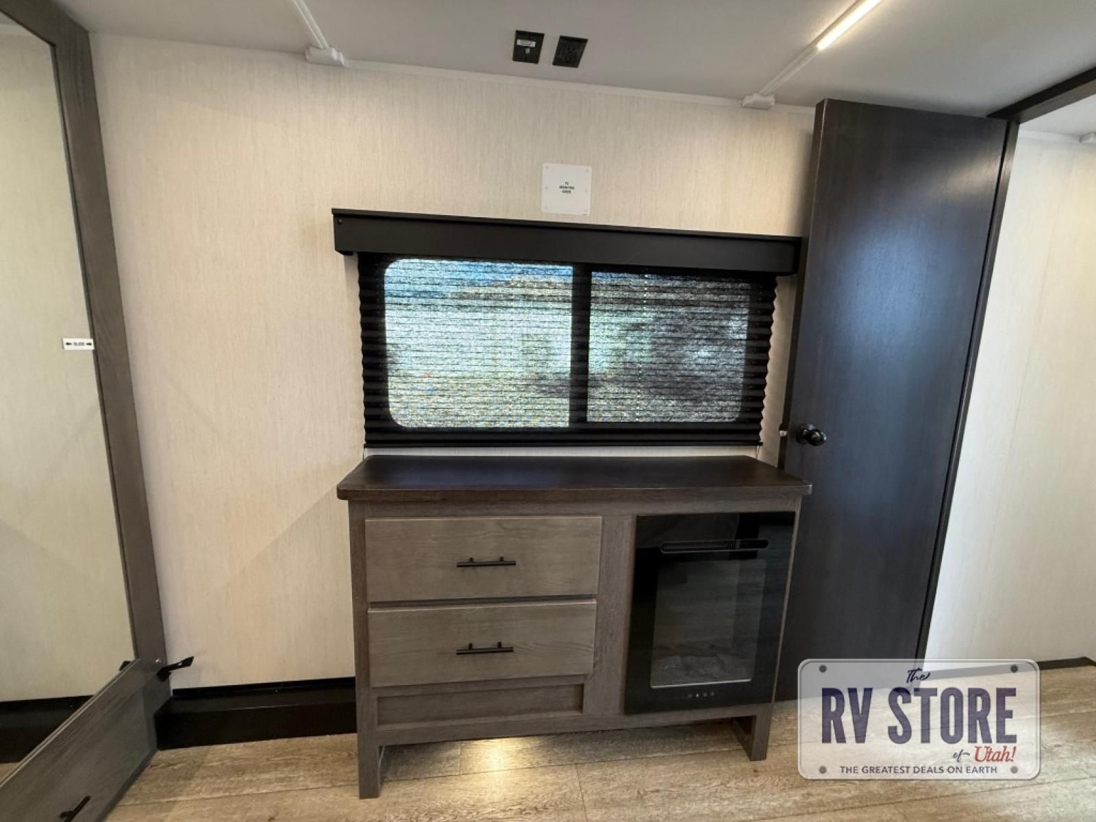 You're going to love camping in this triple slide out fifth wheel that is packed with amenities! The rear deck with a covered patio will provide a place to visit with campground neighbors, and inside, there is an L-shaped tri-fold sofa where guests can sleep. You'll find a king bed slide in the front master bedroom for you, along with a front bench seat, a bedroom fireplace, plus washer and dryer prep if you choose to add these appliances. The kitchen is any chef's dream with its large island with two chairs, pull-out countertop extension, spacious 16 cu. ft. refrigerator, plus a hidden pantry behind the TV for all the dry goods.