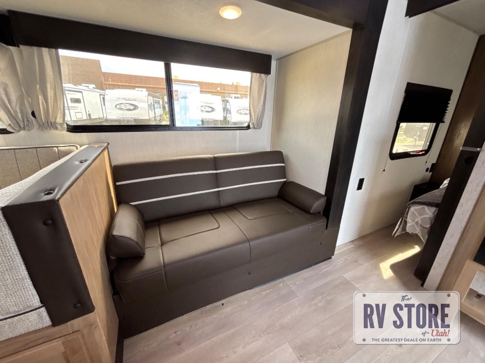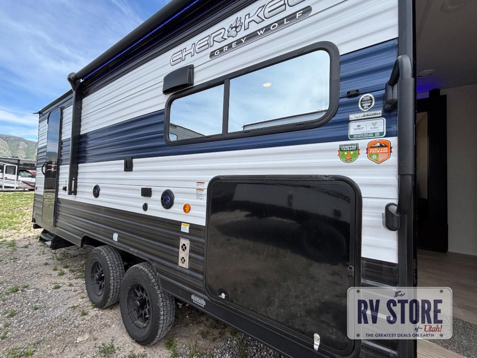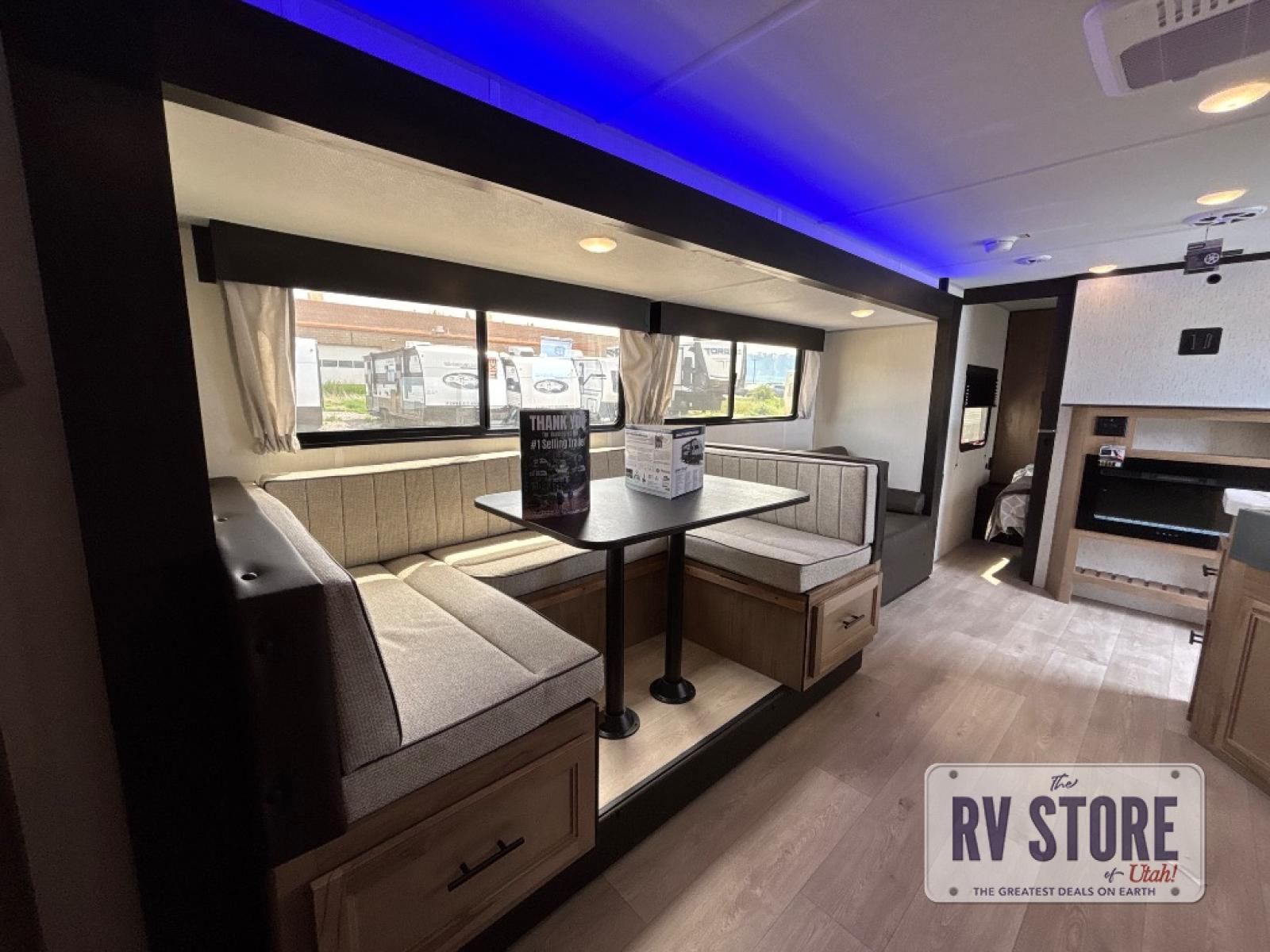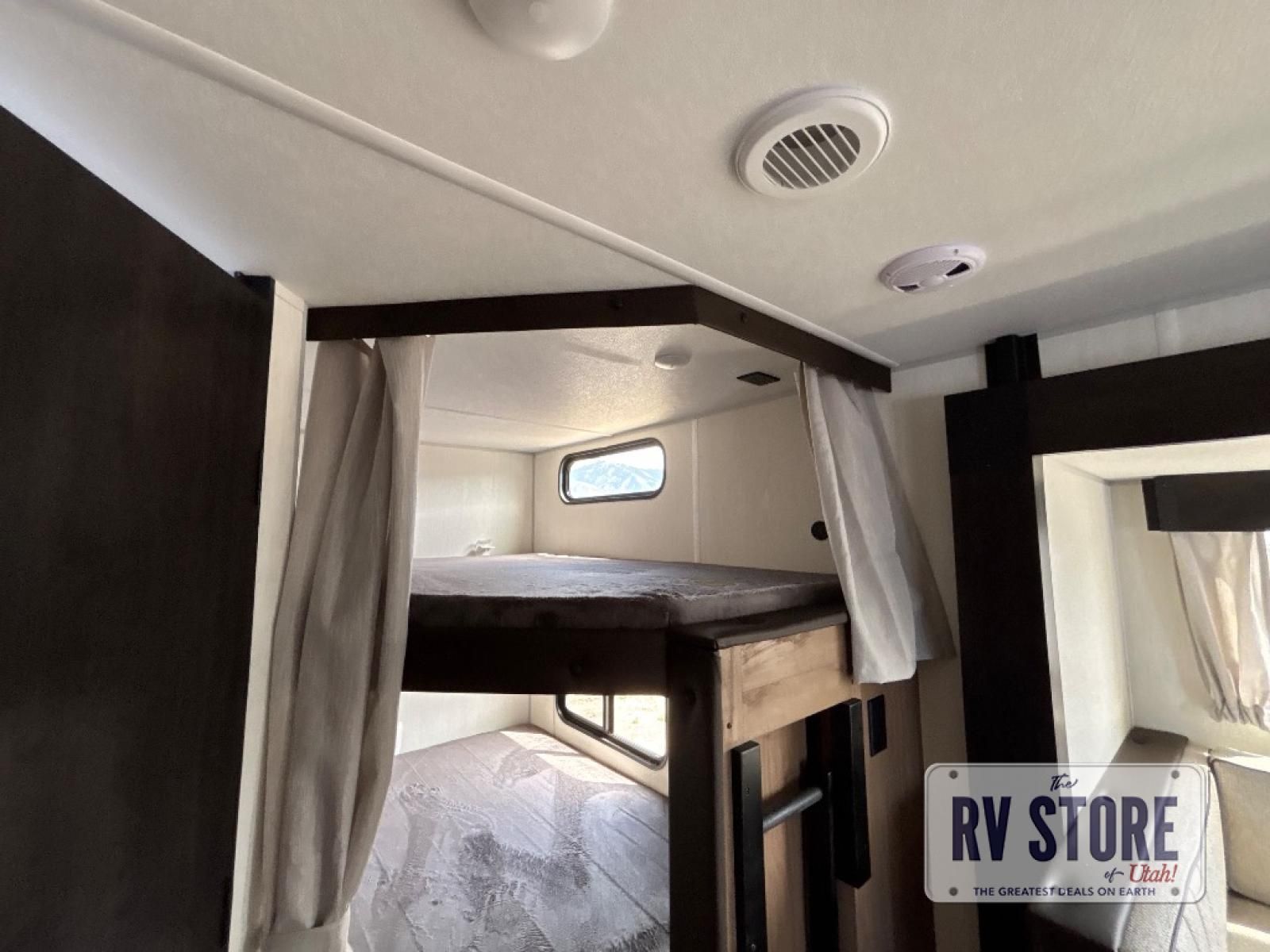 Come on inside this Cherokee Grey Wolf travel trailer and experience the convenience of a smooth flow of traffic in and out with two entry doors. The rear door leads into a full bath which is great for accessibility. Once inside, you will notice the large U-shaped dinette and the sofa which sit on the slide and create a spacious footprint for moving about, as well as great places to play games and socialize with your friends and family. A walk-in pantry provides plenty of storage allowing you to stock up on your favorite snacks and dry goods for your family adventure. At night, there is sleeping space for everyone between the double-size bunks and the RV king bed, plus the furniture.