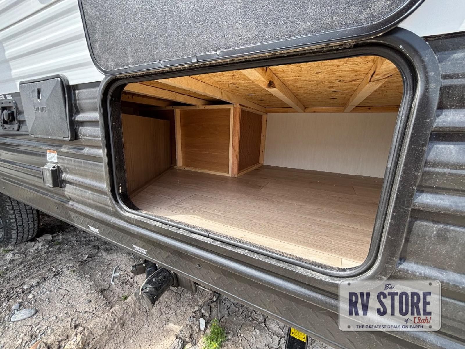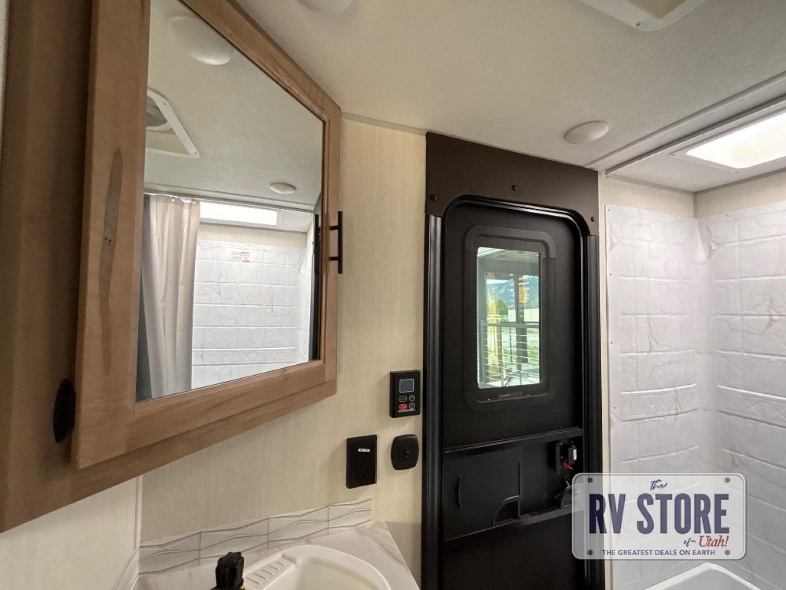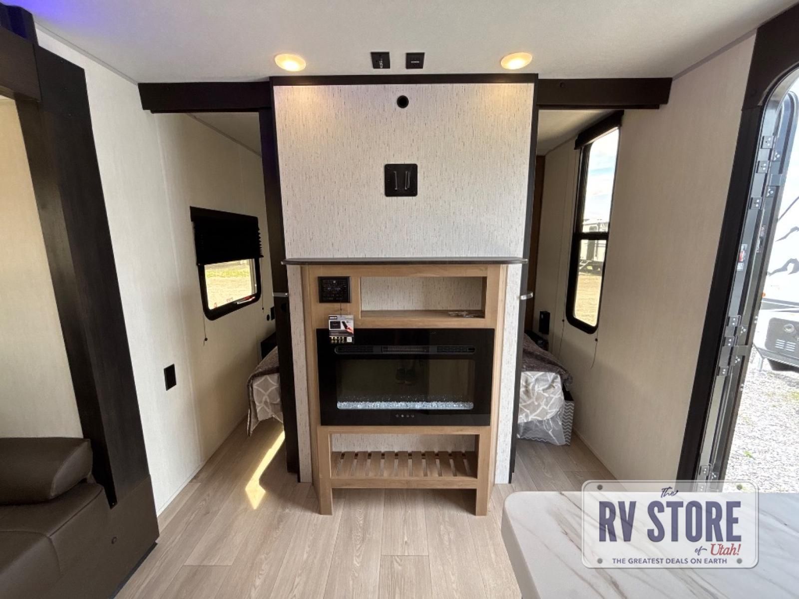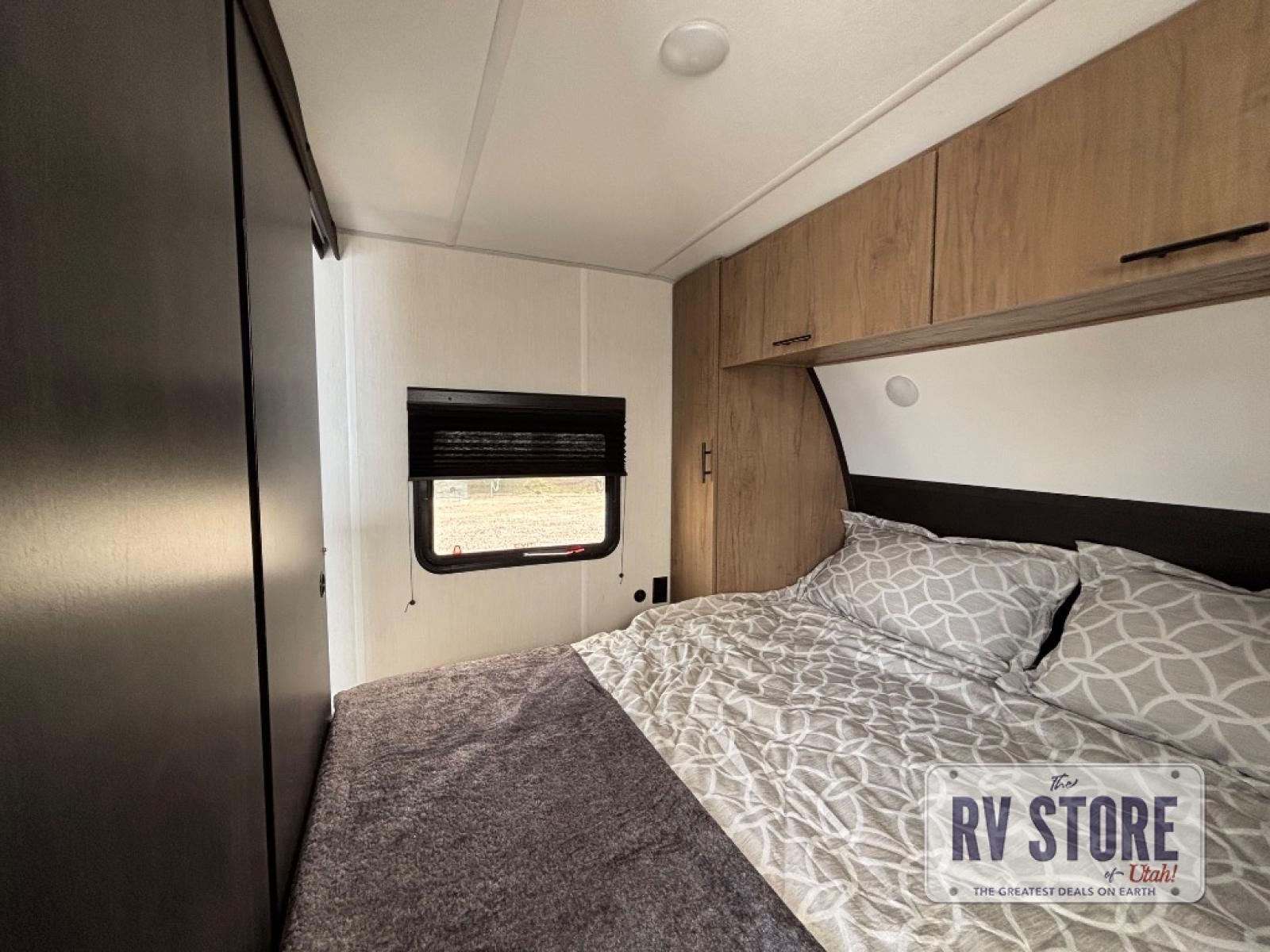 Come on inside this Cherokee Grey Wolf travel trailer and experience the convenience of a smooth flow of traffic in and out with two entry doors. The rear door leads into a full bath which is great for accessibility. Once inside, you will notice the large U-shaped dinette and the sofa which sit on the slide and create a spacious footprint for moving about, as well as great places to play games and socialize with your friends and family. A walk-in pantry provides plenty of storage allowing you to stock up on your favorite snacks and dry goods for your family adventure. At night, there is sleeping space for everyone between the double-size bunks and the RV king bed, plus the furniture.