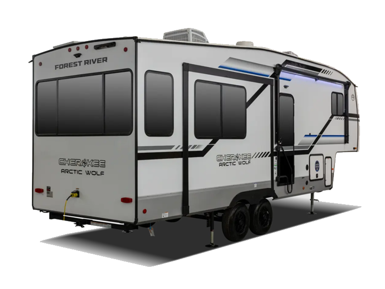 You'll have the very best time tackling outdoor adventures with the Forest River Cherokee Arctic Wolf fifth wheel! Each model has been constructed with a âToughBendâ rigid skirt metal design, Leash Latch pet safety technology, an outside shower with hot/cold water, and a 1x engineered wood âSuperTrussâ roof structure with 3/8" decking for added durability. There is also an automatic leveling and stabilization system, slam latch storage doors with "Safety Stay" magnets, plus 12V heat pads on all holding tanks with help withstand colder temperatures. Inside, you'll love the solid surface kitchen countertops with underlighting, along with a carpetless floor design, and fully adjustable, slow rise, blackout roller shades. The on-demand tankless hot water heater will provide endless hot water and the central A/C unit with Quick Cool will ensure your comfort during those hot summer camping months. There are many more stand-out features found on these fifth wheels; check them out!