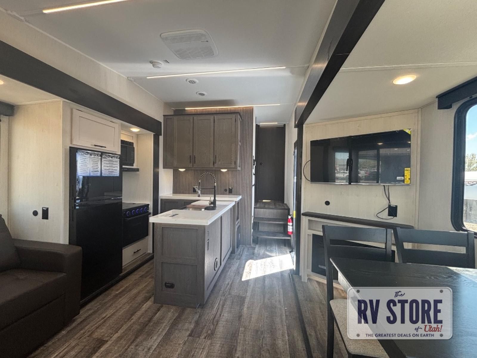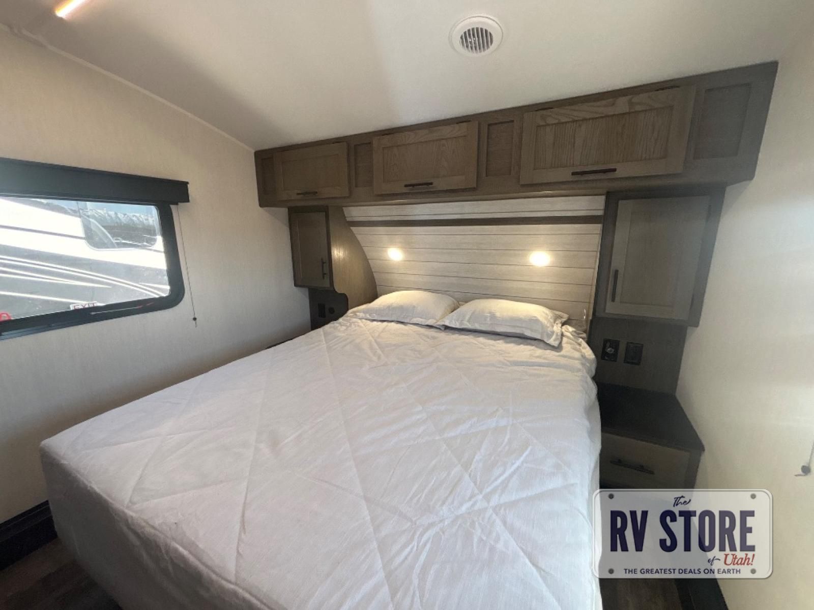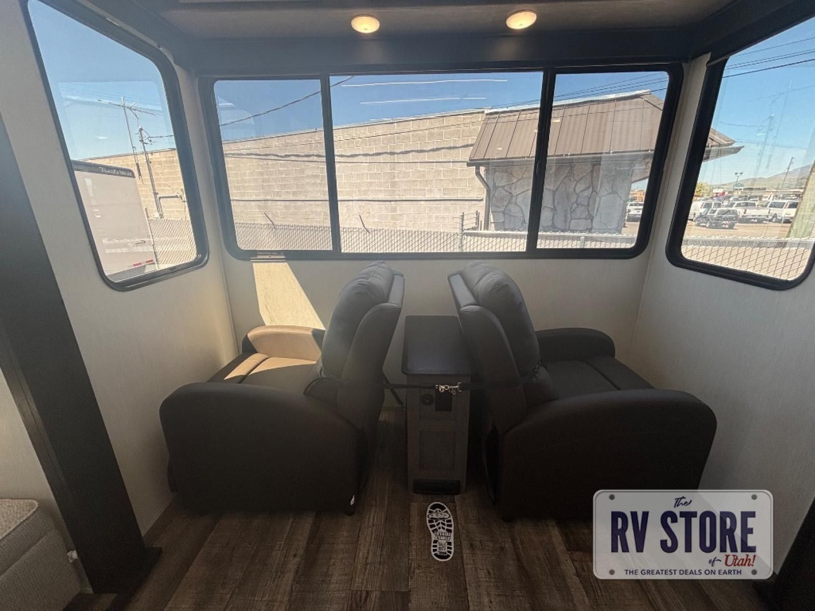 This fifth wheel is perfect for couple's but also has enough space for company too! The rear living area features two recliners with a middle table side to set your cup of coffee, a tri-fold sofa that can transform into an extra sleeping space, and free standing table with chairs and storage ottoman seat to enjoy your meals by the electric fireplace. The fully equipped kitchen has everything you need including a counter peninsula, 12V refrigerator, and plenty of storage. After a fun-filled day at the beach, rinse off in the full bathroom that includes a spacious shower, porcelain toilet, and convenient shower caddy. The front private bedroom has a queen bed to lay your head on at night and there is even USB ports on either side to charge your electronics!
