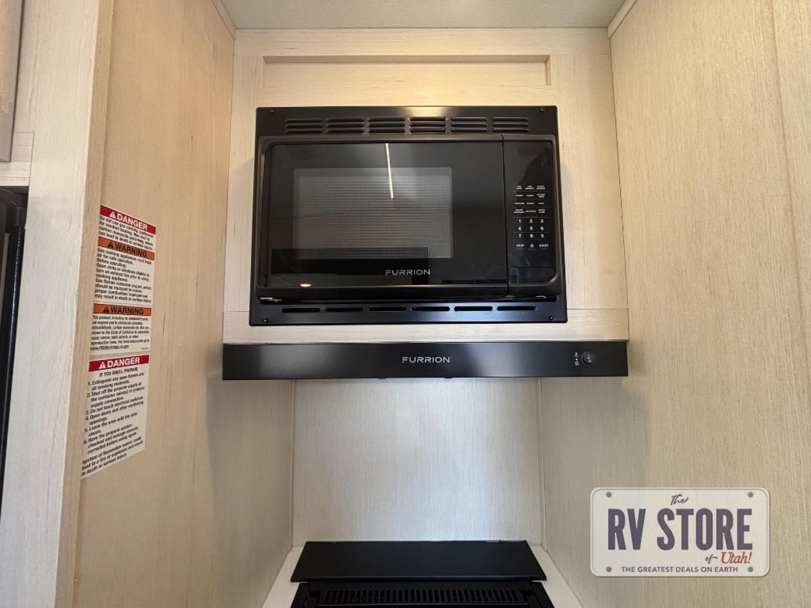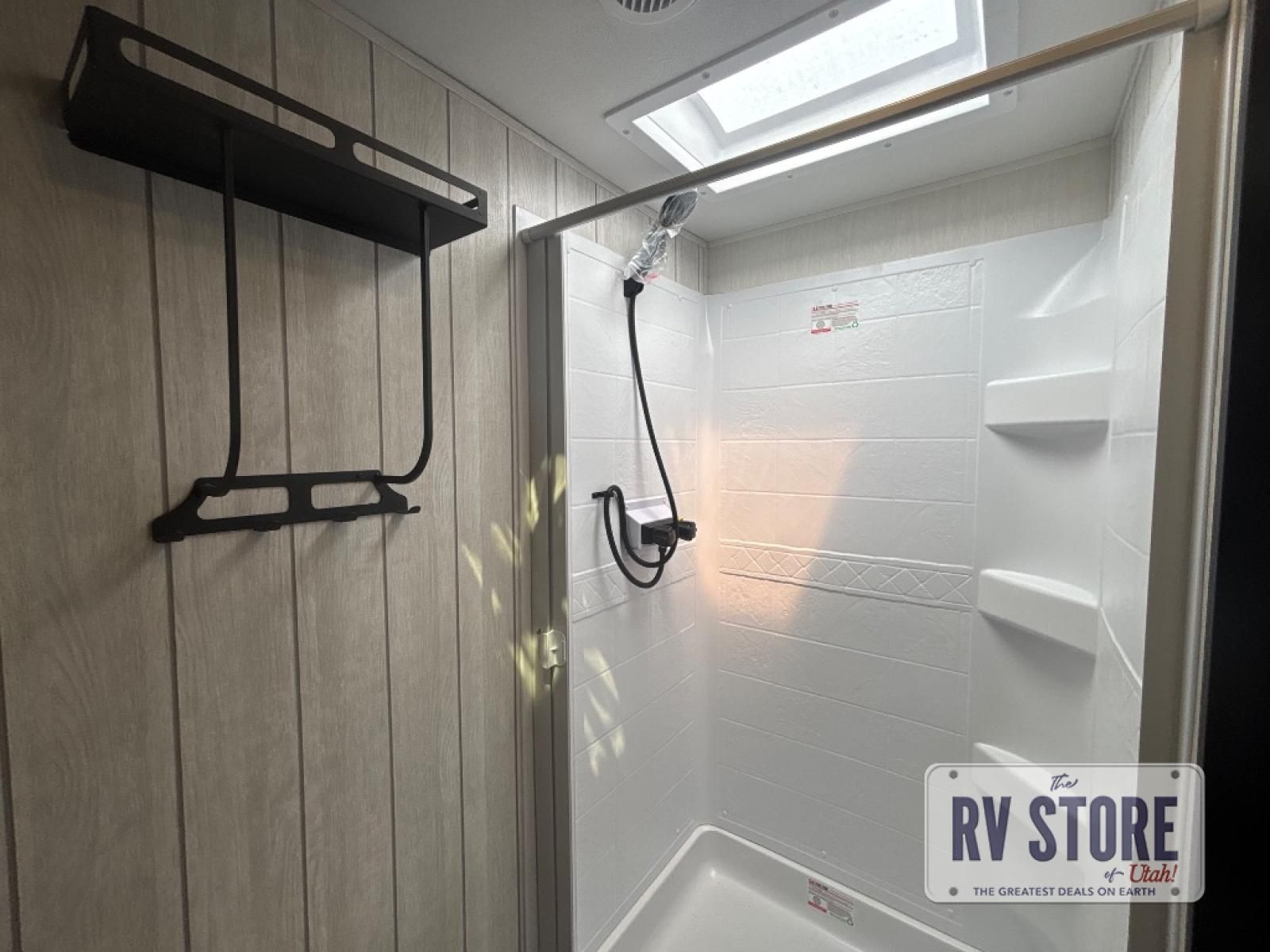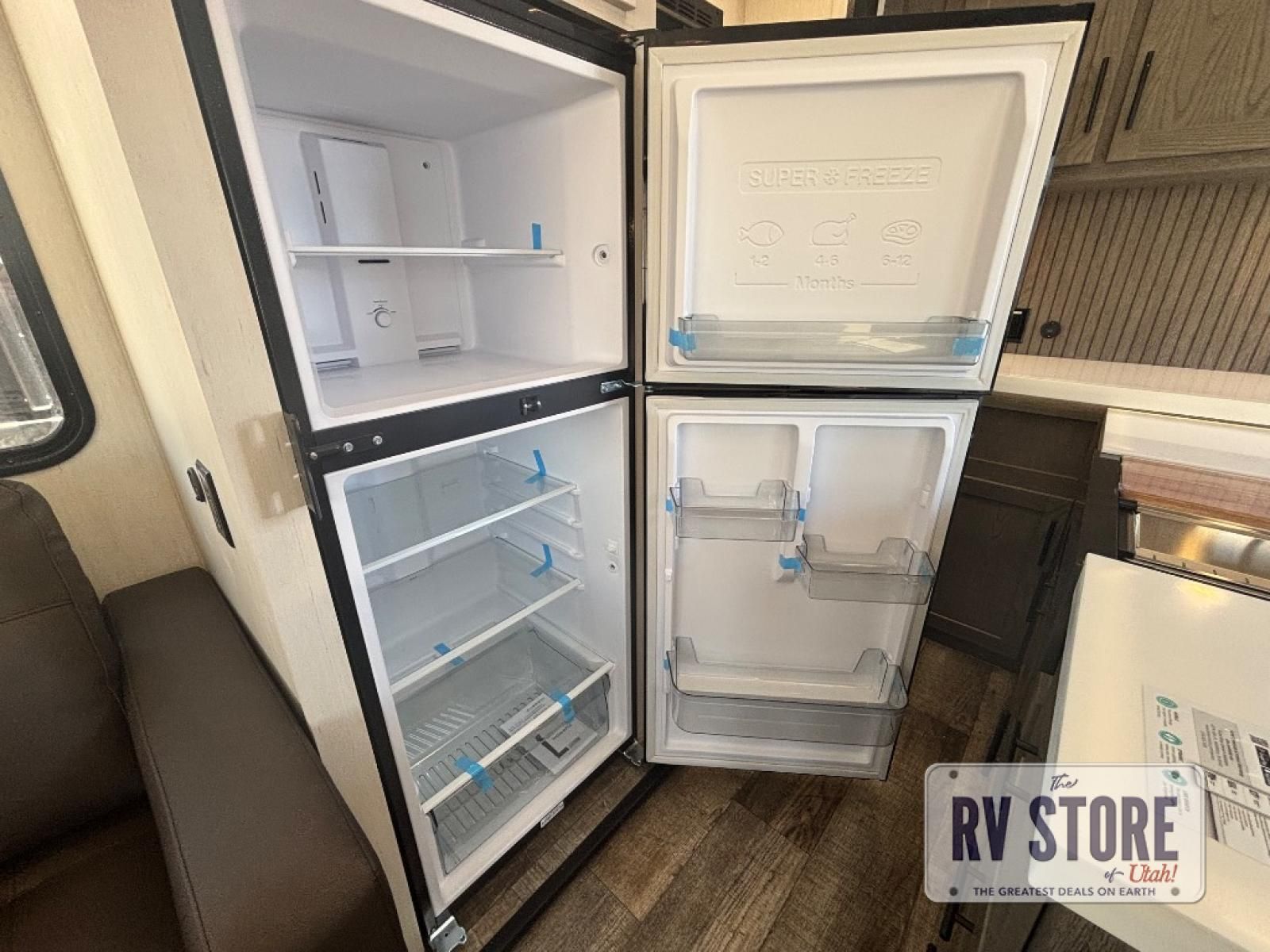 This fifth wheel is perfect for couple's but also has enough space for company too! The rear living area features two recliners with a middle table side to set your cup of coffee, a tri-fold sofa that can transform into an extra sleeping space, and free standing table with chairs and storage ottoman seat to enjoy your meals by the electric fireplace. The fully equipped kitchen has everything you need including a counter peninsula, 12V refrigerator, and plenty of storage. After a fun-filled day at the beach, rinse off in the full bathroom that includes a spacious shower, porcelain toilet, and convenient shower caddy. The front private bedroom has a queen bed to lay your head on at night and there is even USB ports on either side to charge your electronics!