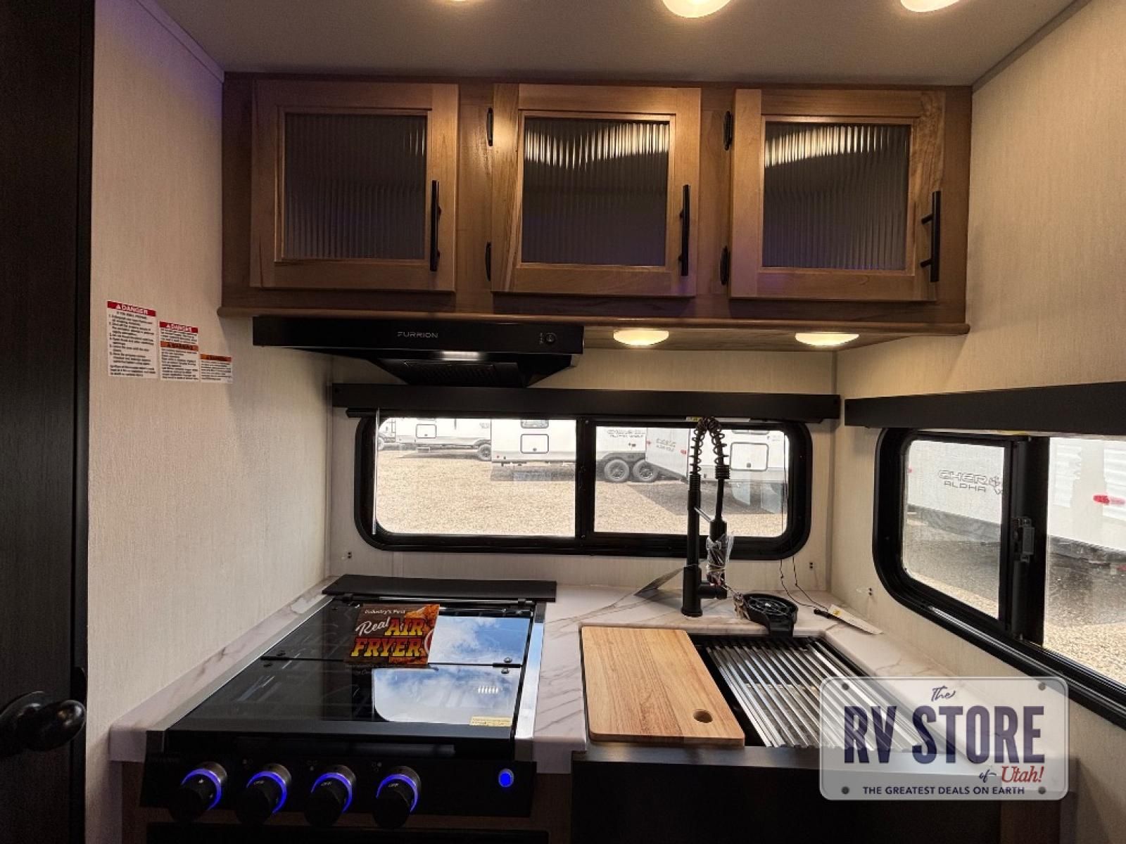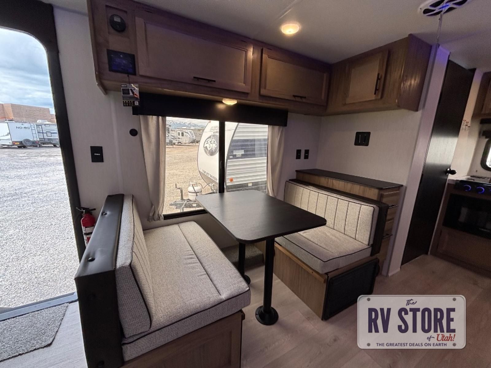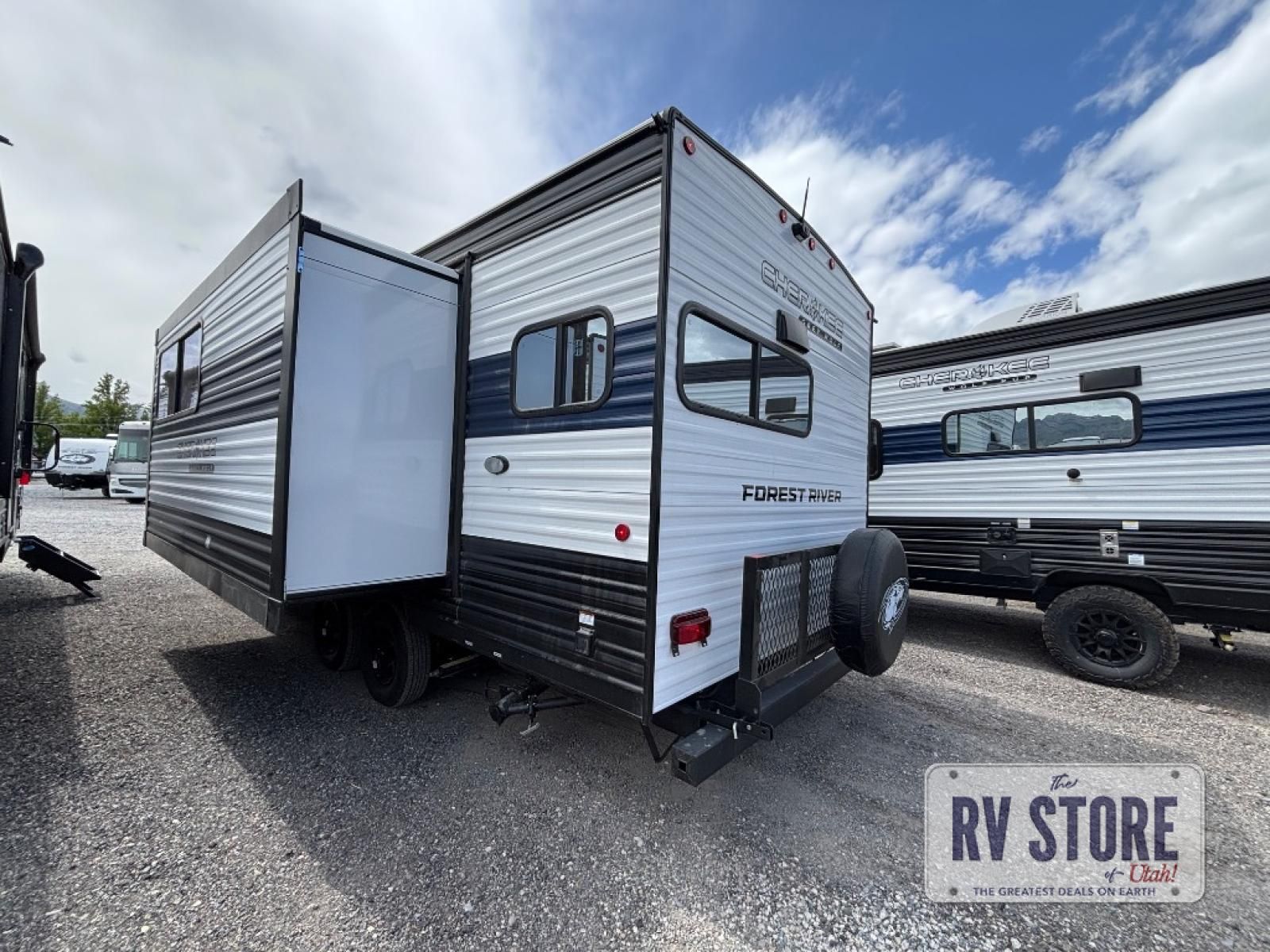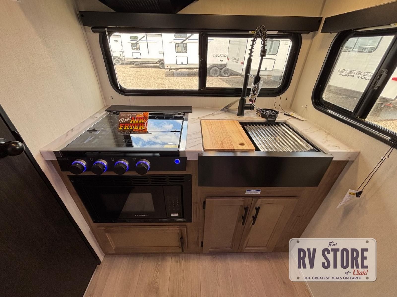 You will love traveling with this Cherokee Grey Wolf in tow. This is a great unit for a couple or family as the booth dinette and sofa can both be used for added sleeping for children or quests if needed. There is a comfortable RV king bed up front that you will love for a great night's rest with storage space in nightstands and wardrobes for your clothing and things on either side of the bed. A cooktop and air fryer is available for cooking inside, and the rear corner bath includes a tub/shower, toilet and sink. A nice 15' awning creates more outdoor living space to enjoy protected from the elements both day and night with an LED light strip for after dark. You can also add a TV on the exterior as it has an outside TV mount.