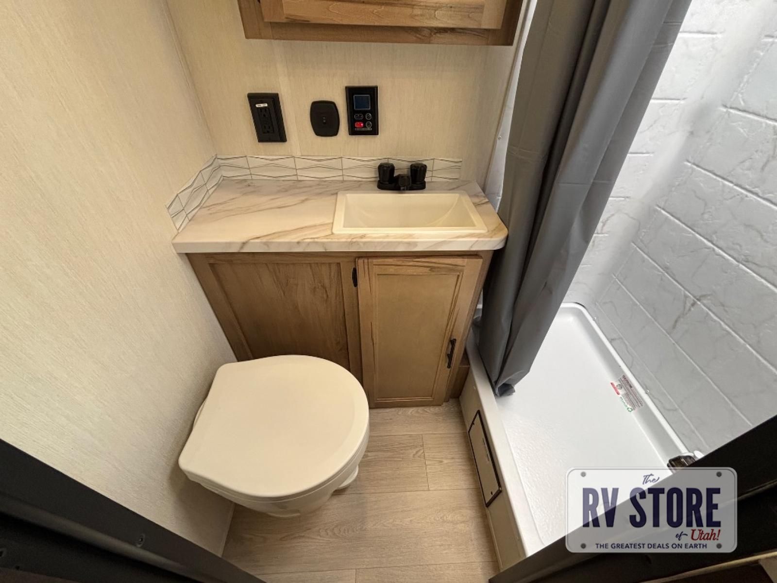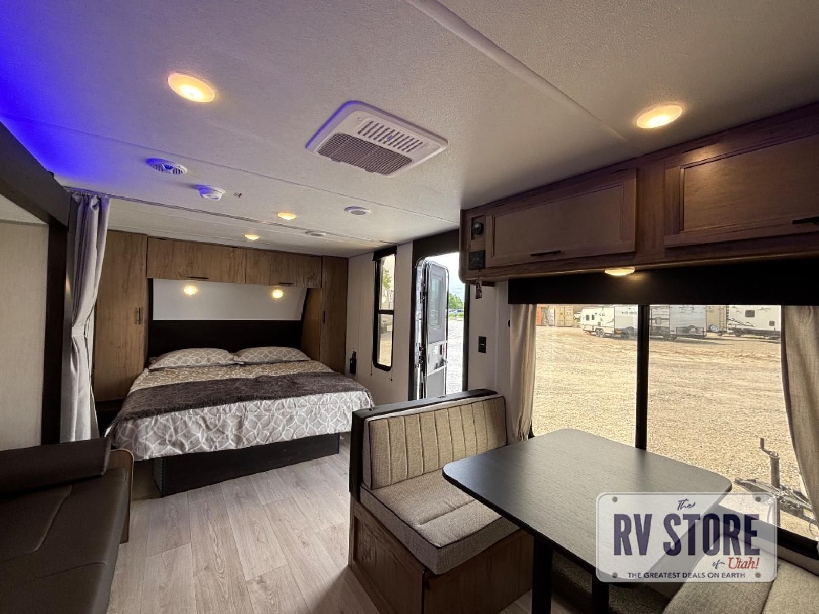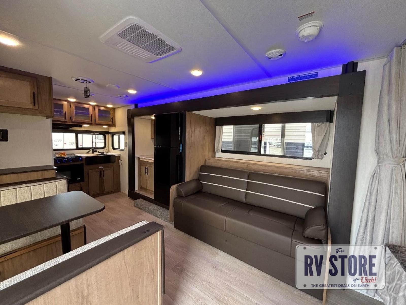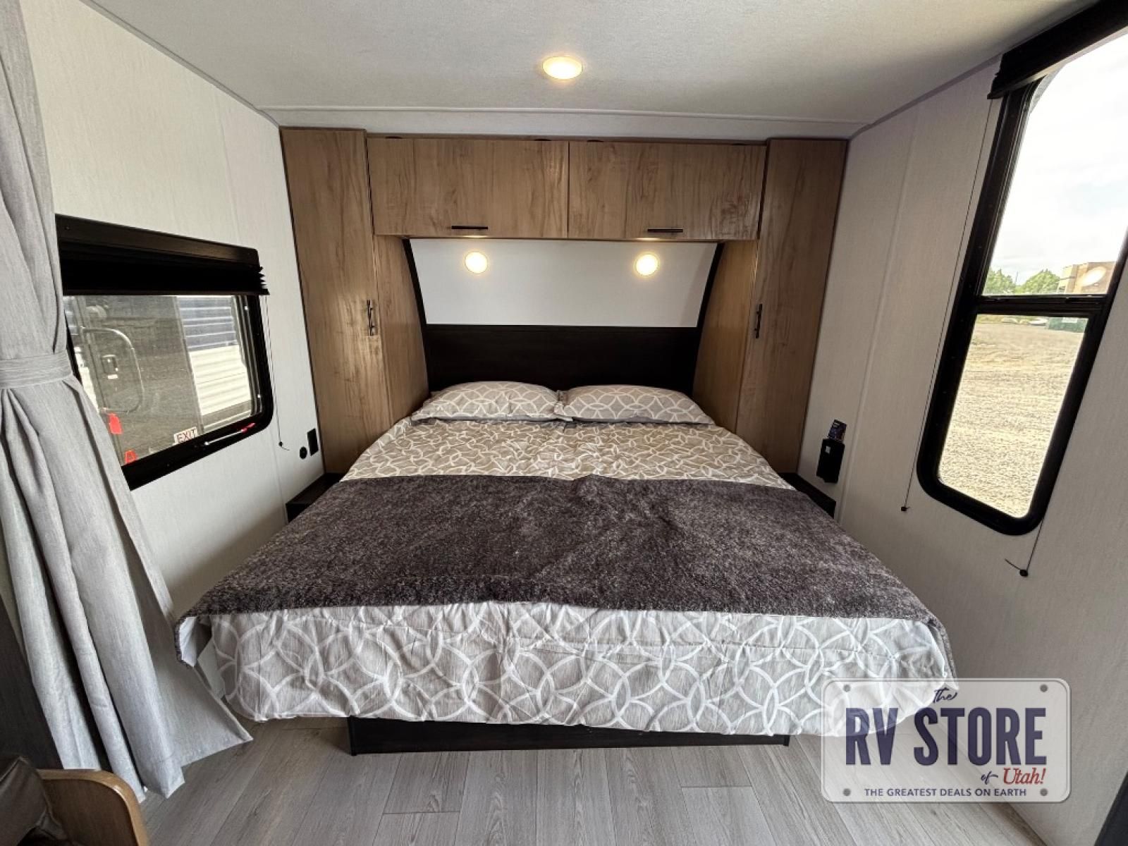 You will love traveling with this Cherokee Grey Wolf in tow. This is a great unit for a couple or family as the booth dinette and sofa can both be used for added sleeping for children or quests if needed. There is a comfortable RV king bed up front that you will love for a great night's rest with storage space in nightstands and wardrobes for your clothing and things on either side of the bed. A cooktop and air fryer is available for cooking inside, and the rear corner bath includes a tub/shower, toilet and sink. A nice 15' awning creates more outdoor living space to enjoy protected from the elements both day and night with an LED light strip for after dark. You can also add a TV on the exterior as it has an outside TV mount.