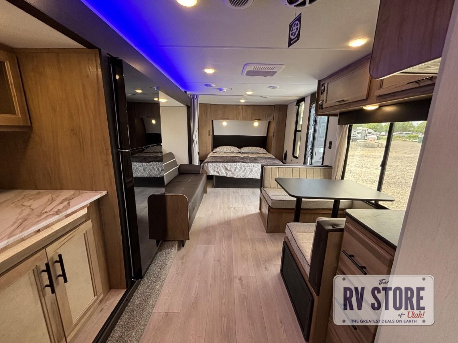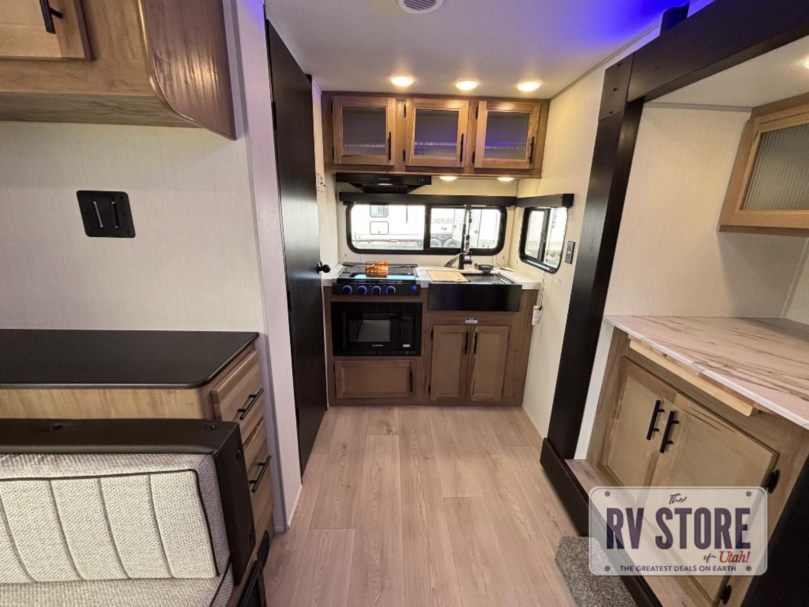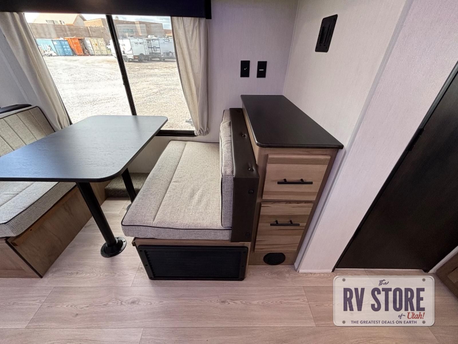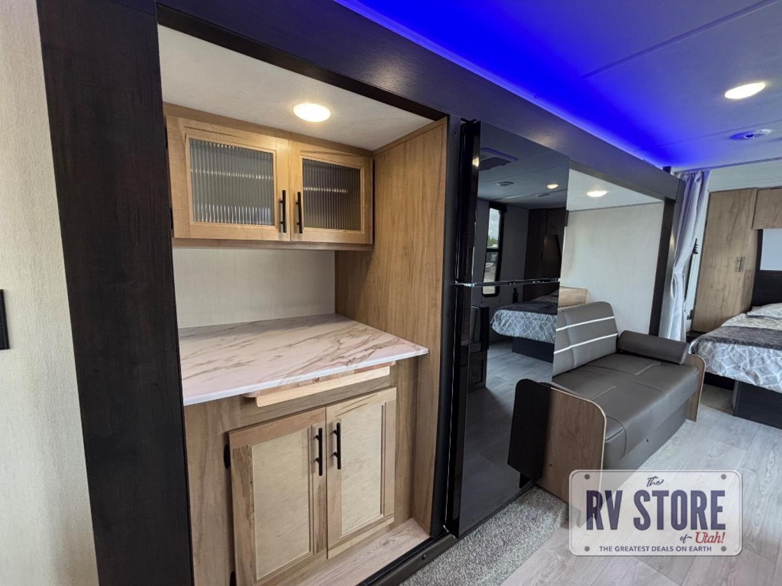 You will love traveling with this Cherokee Grey Wolf in tow. This is a great unit for a couple or family as the booth dinette and sofa can both be used for added sleeping for children or quests if needed. There is a comfortable RV king bed up front that you will love for a great night's rest with storage space in nightstands and wardrobes for your clothing and things on either side of the bed. A cooktop and air fryer is available for cooking inside, and the rear corner bath includes a tub/shower, toilet and sink. A nice 15' awning creates more outdoor living space to enjoy protected from the elements both day and night with an LED light strip for after dark. You can also add a TV on the exterior as it has an outside TV mount.