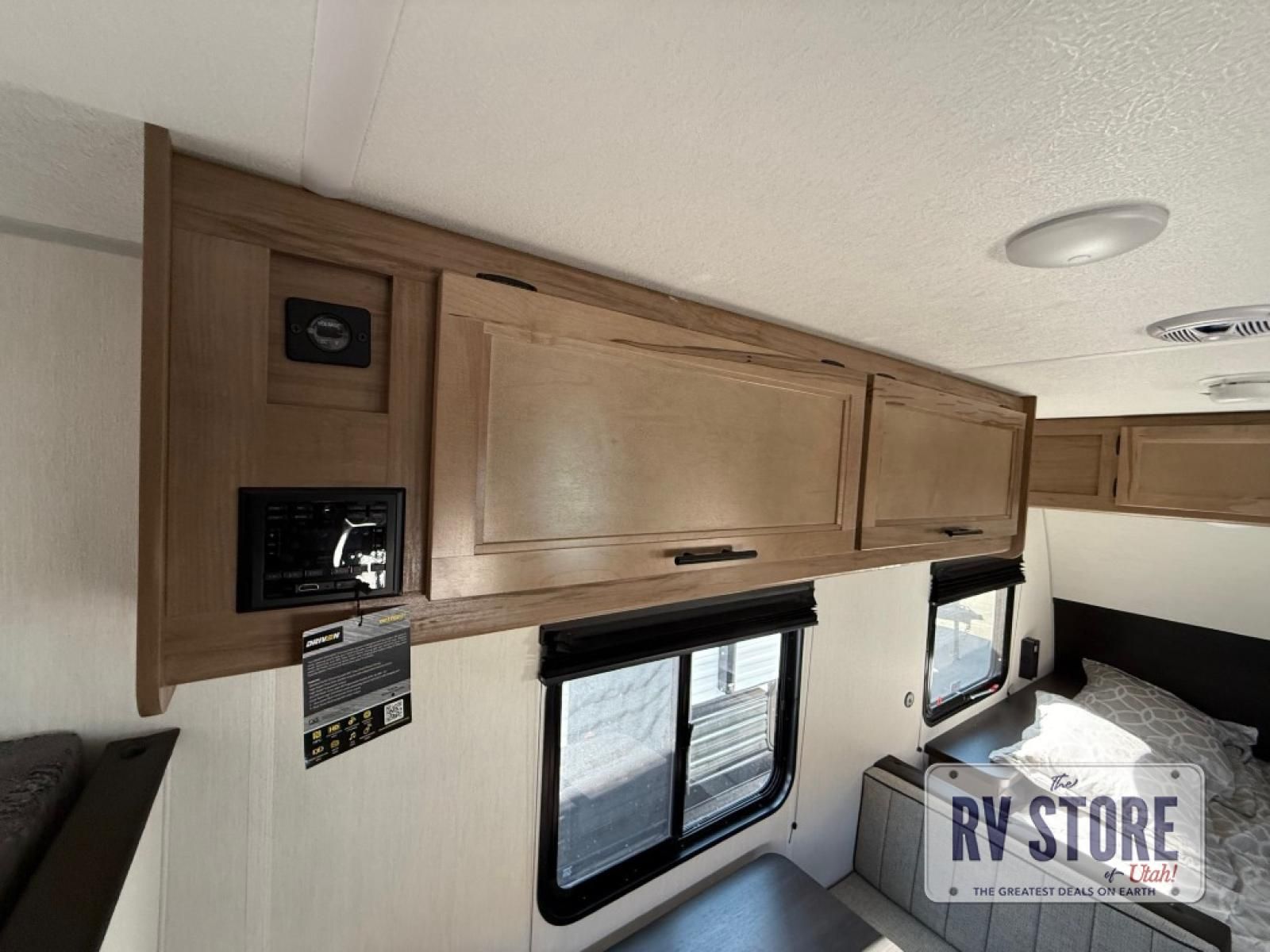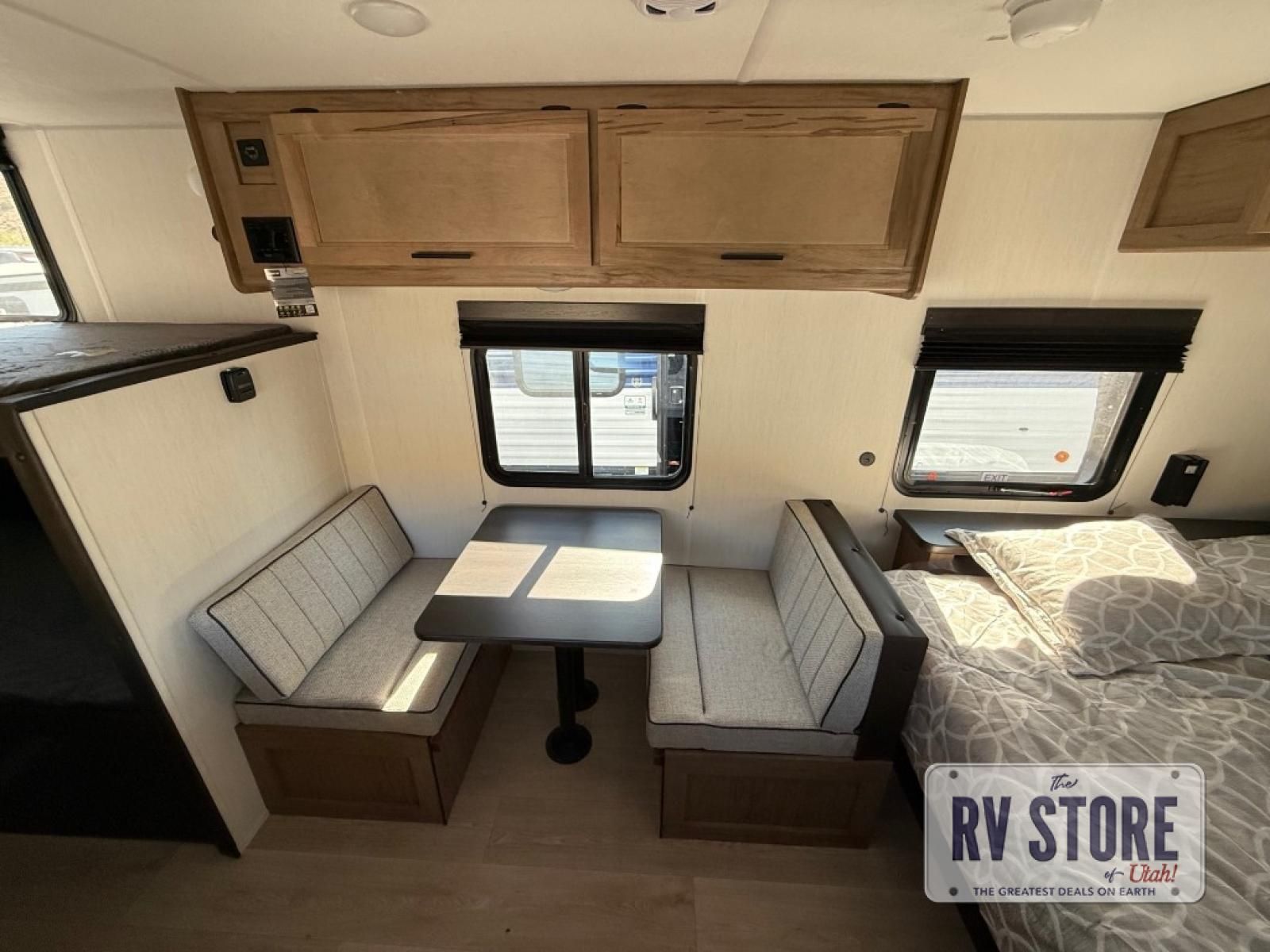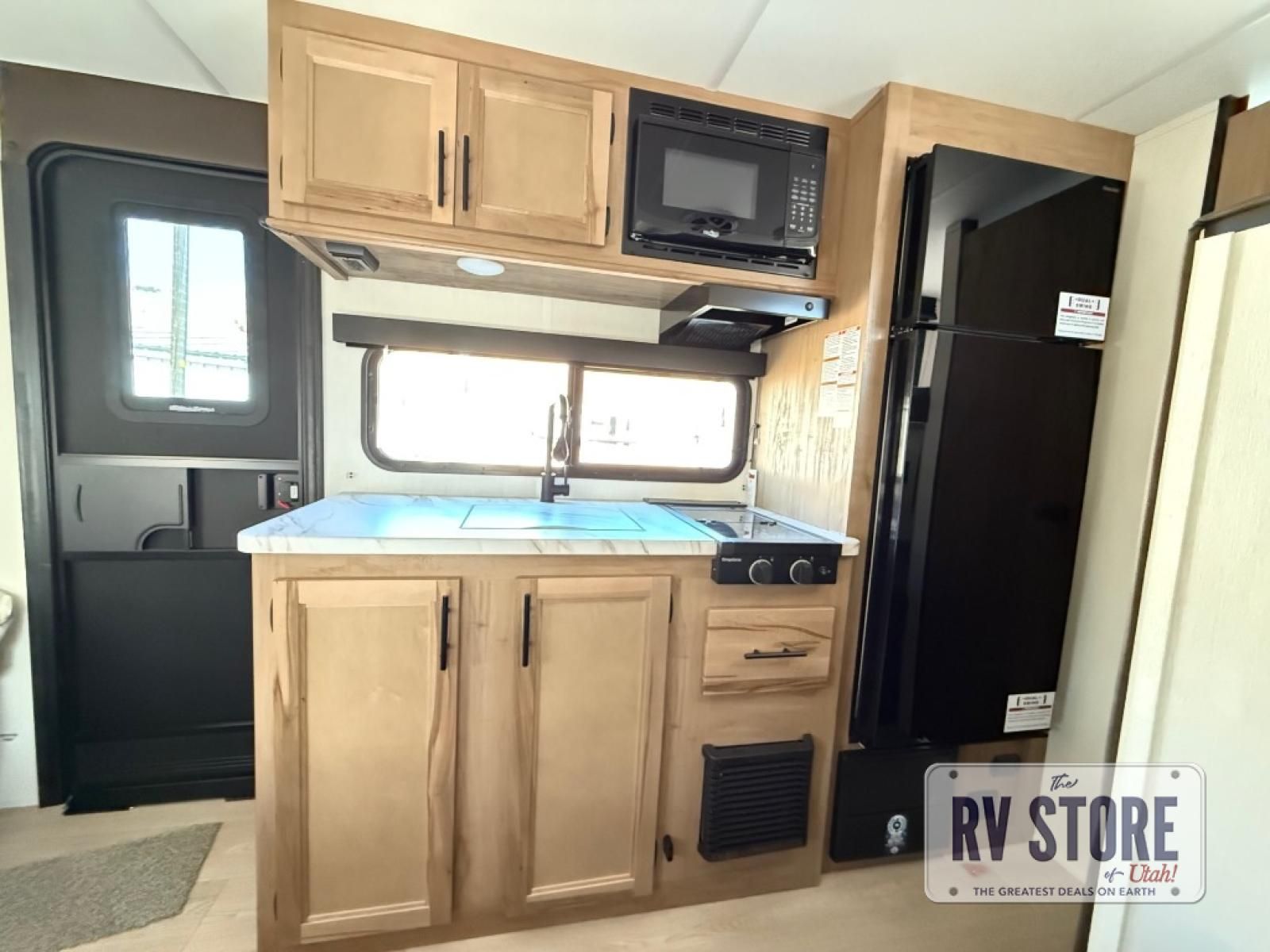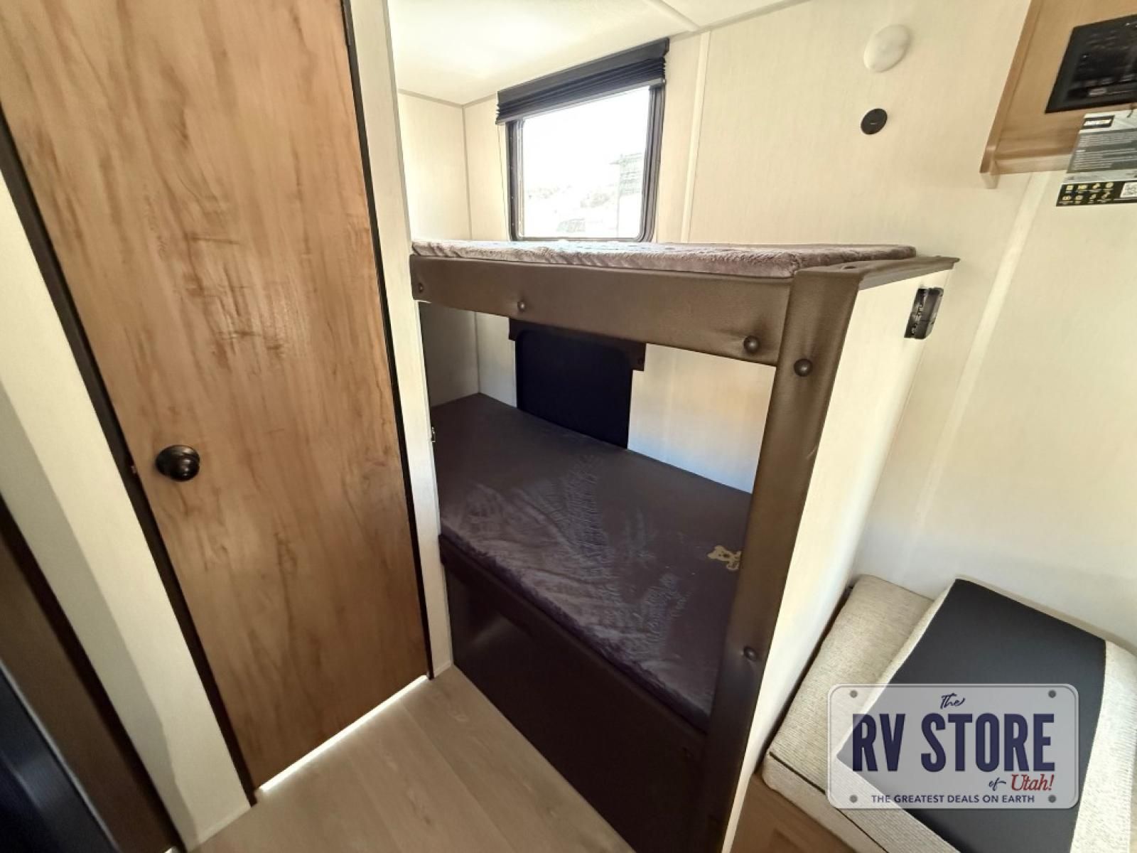 The whole family can sleep comfortably in this travel trailer! It has a set of bunk beds for the kids to sleep on, and you can sleep comfortably on the front queen bed with overhead cabinets and a shelf. There is even an exterior storage plus door that accesses the storage space under the bottom bunk. The chef will enjoy preparing their best home cooked meals either indoors with the high output cooktop or at the outside mini kitchen while staying protected by the 12' power awning!