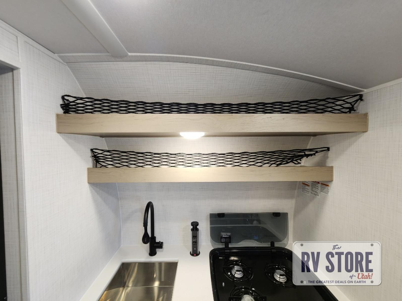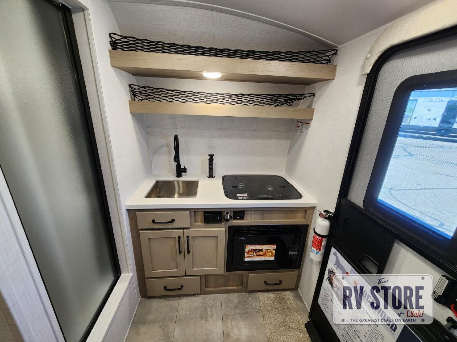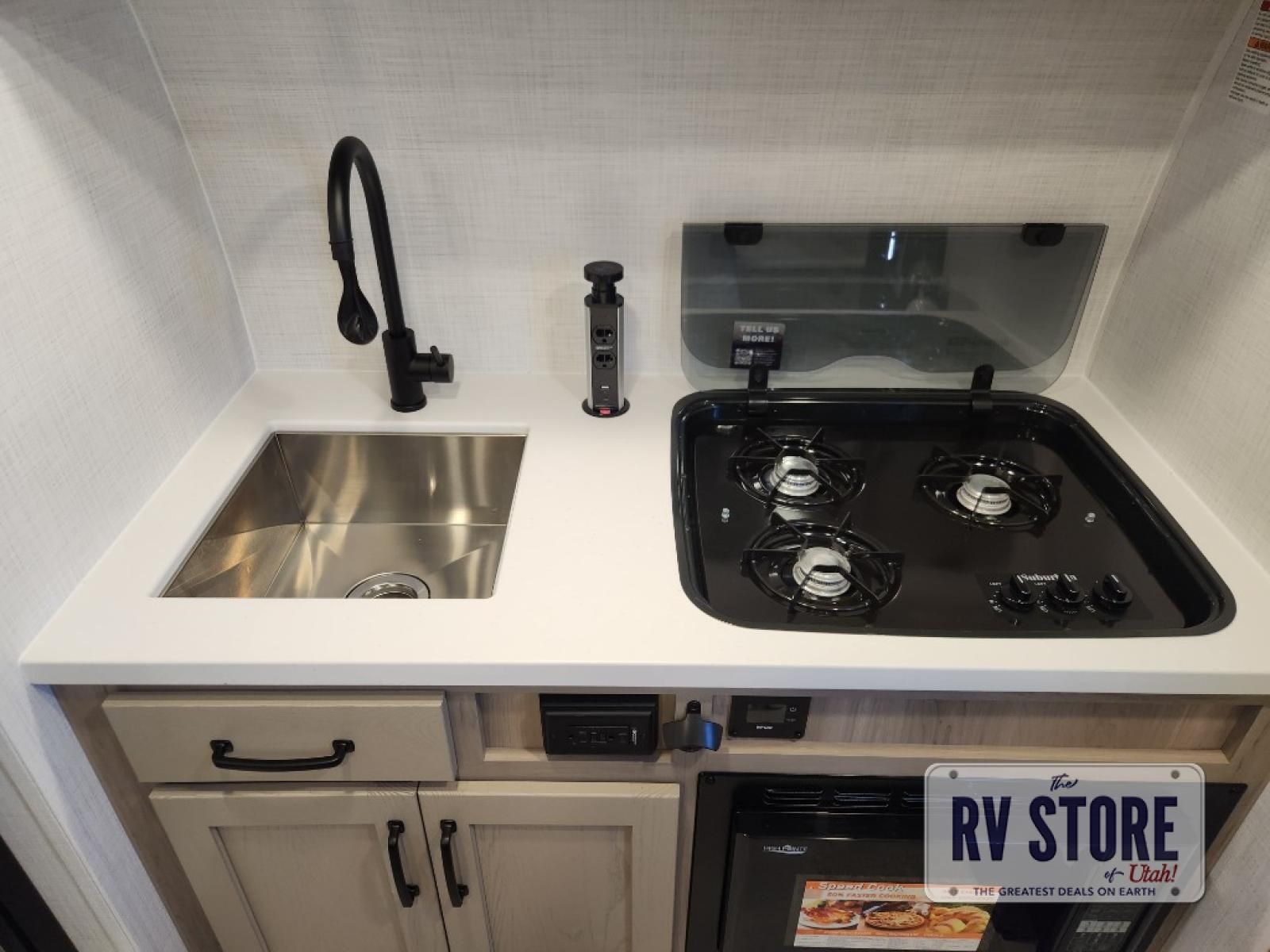 It won't be hard to find comfort in this travel trailer. It may be smaller on size, but it doesn't skim on features. The twin beds convert to a king-size bed for your comfort, and there is even a 32" 12V TV to enjoy in the evenings. The kitchen includes a three burner cooktop, a convection microwave, plus a 12V refrigerator for perishables. You'll find overhead compartments for your valuables and exterior storage for your hiking gear!