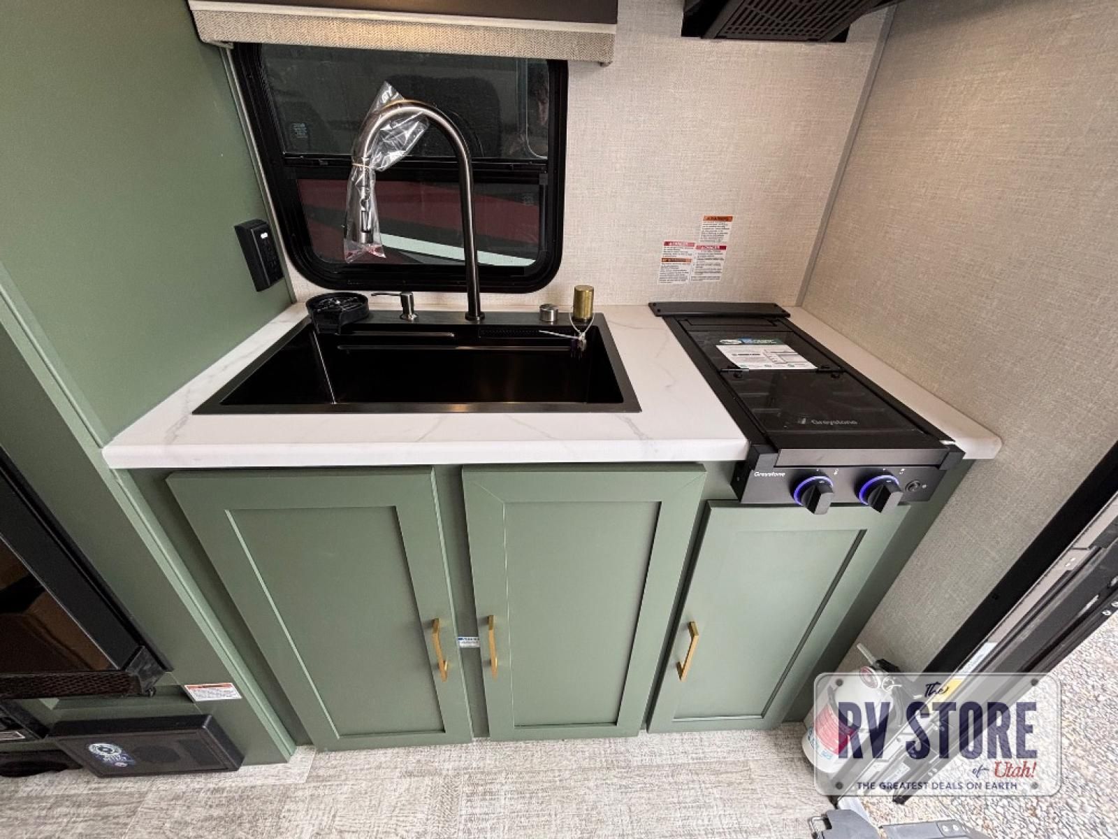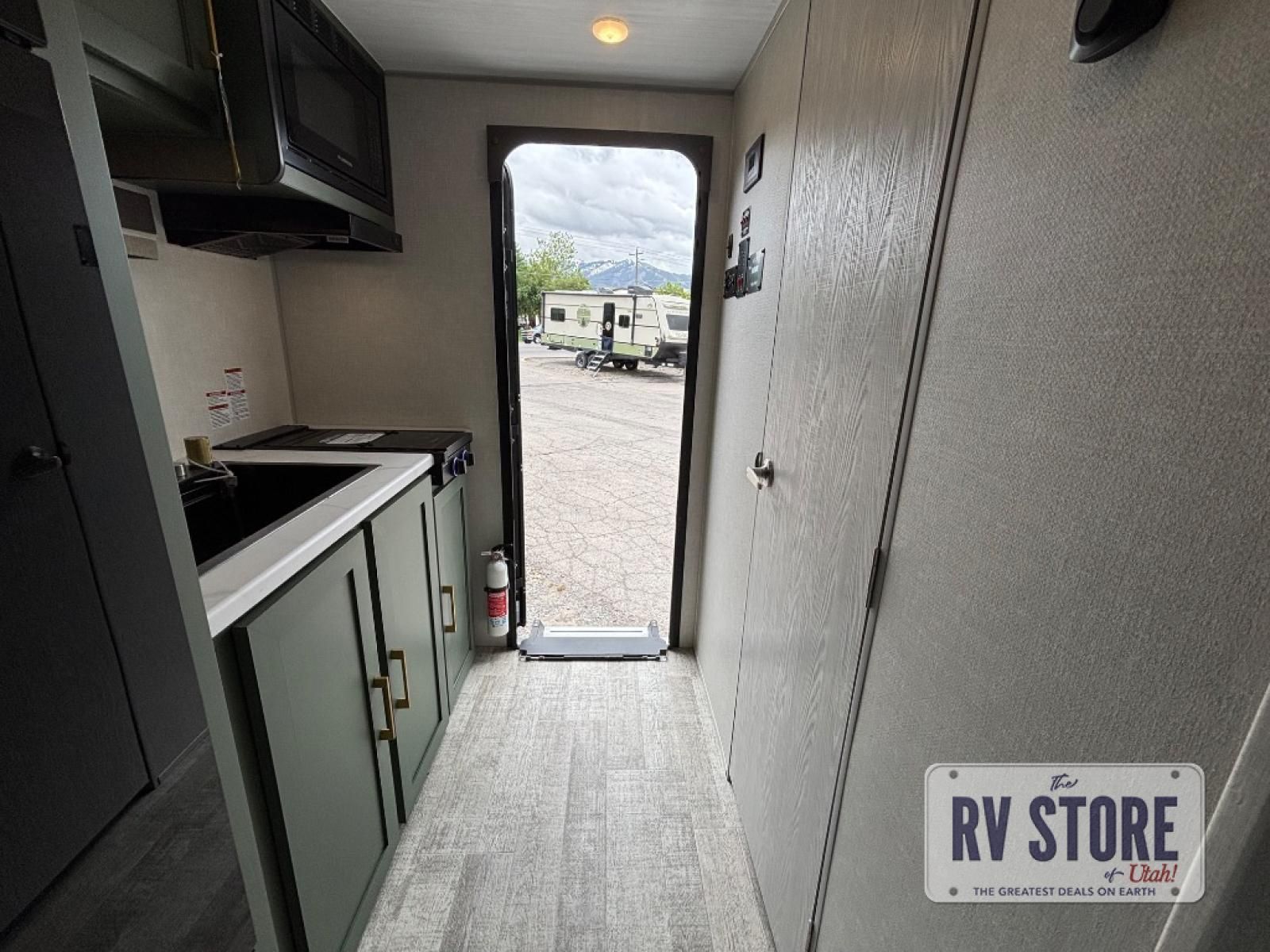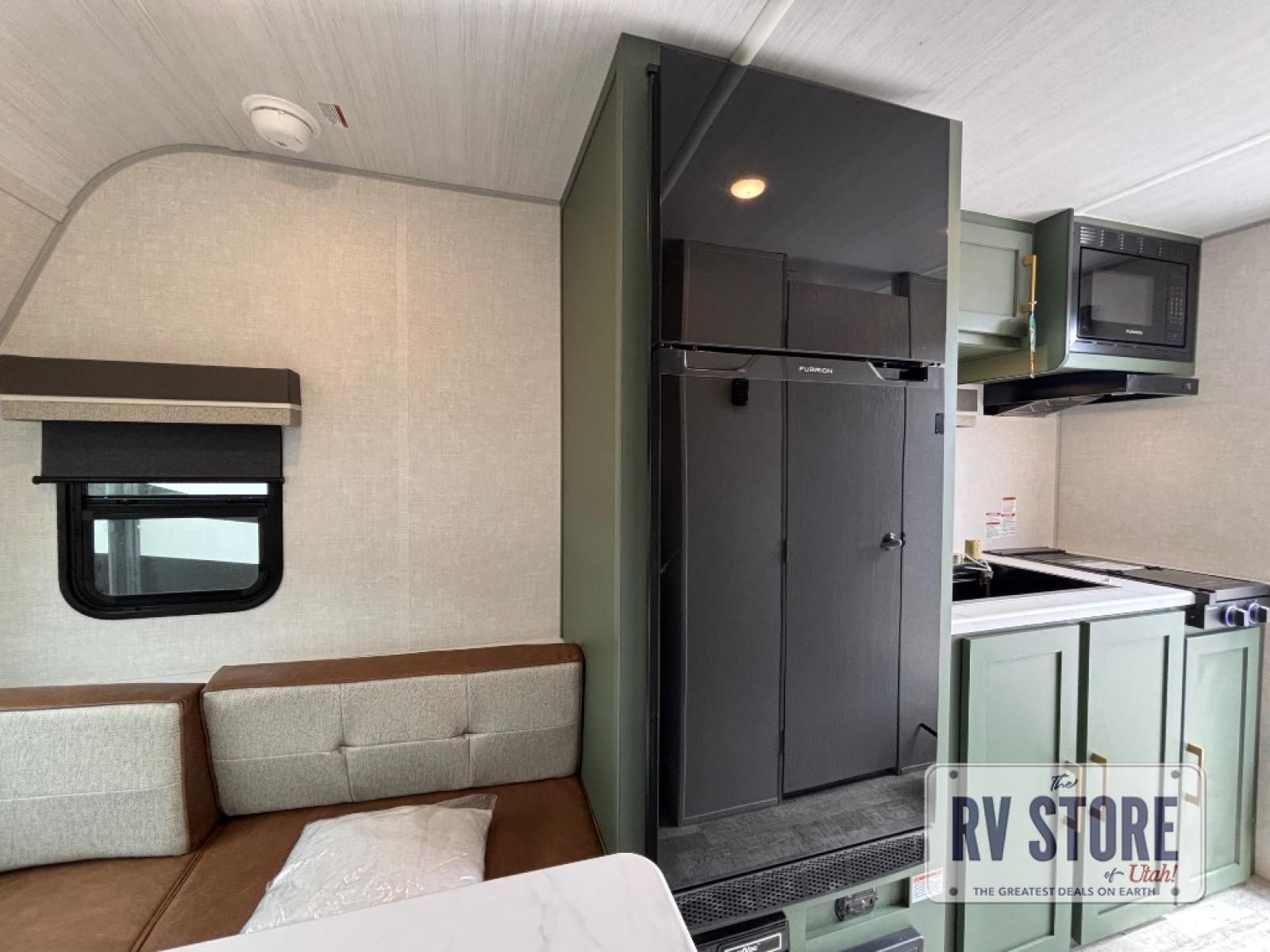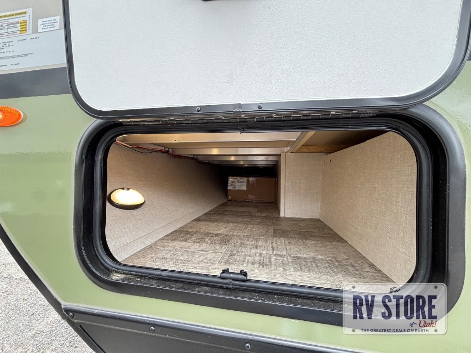 This easy to tow trailer is perfect for weekend trips to the lake! Once you're set up at camp, put out the patio awning, make lunch on the outside kitchen, and grab your camp chairs from the slam latch cargo doors with pass-thru lighting. The kitchen includes an all-in-one microwave and air fryer, plus a pantry and refrigerator for food storage. When it's time to call it a night, the front queen bed with a U-shaped dinette is sure to bring comfort!