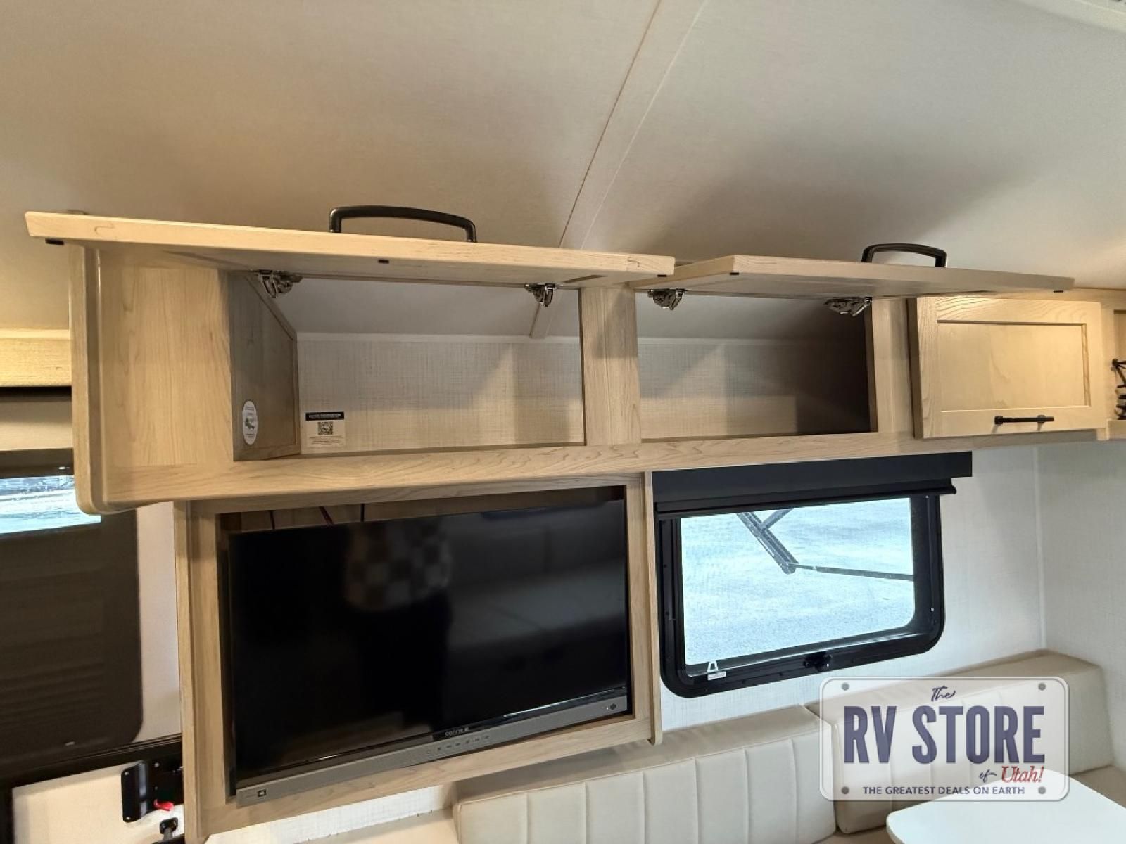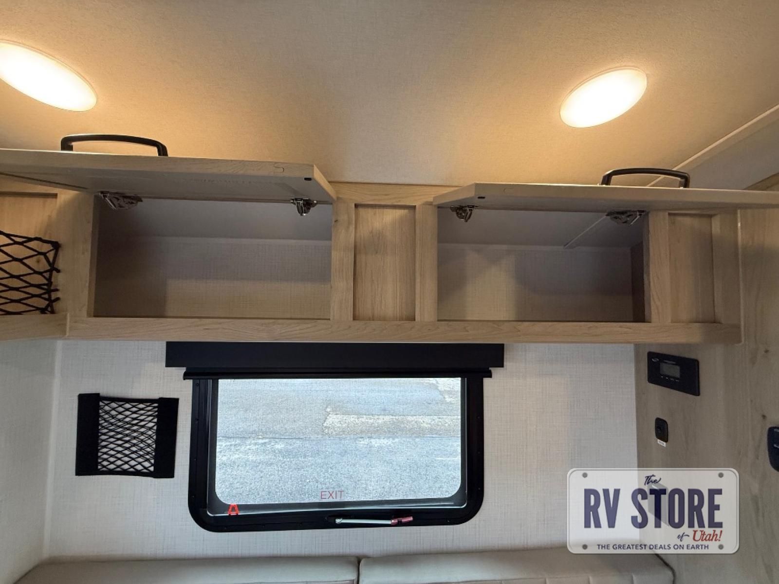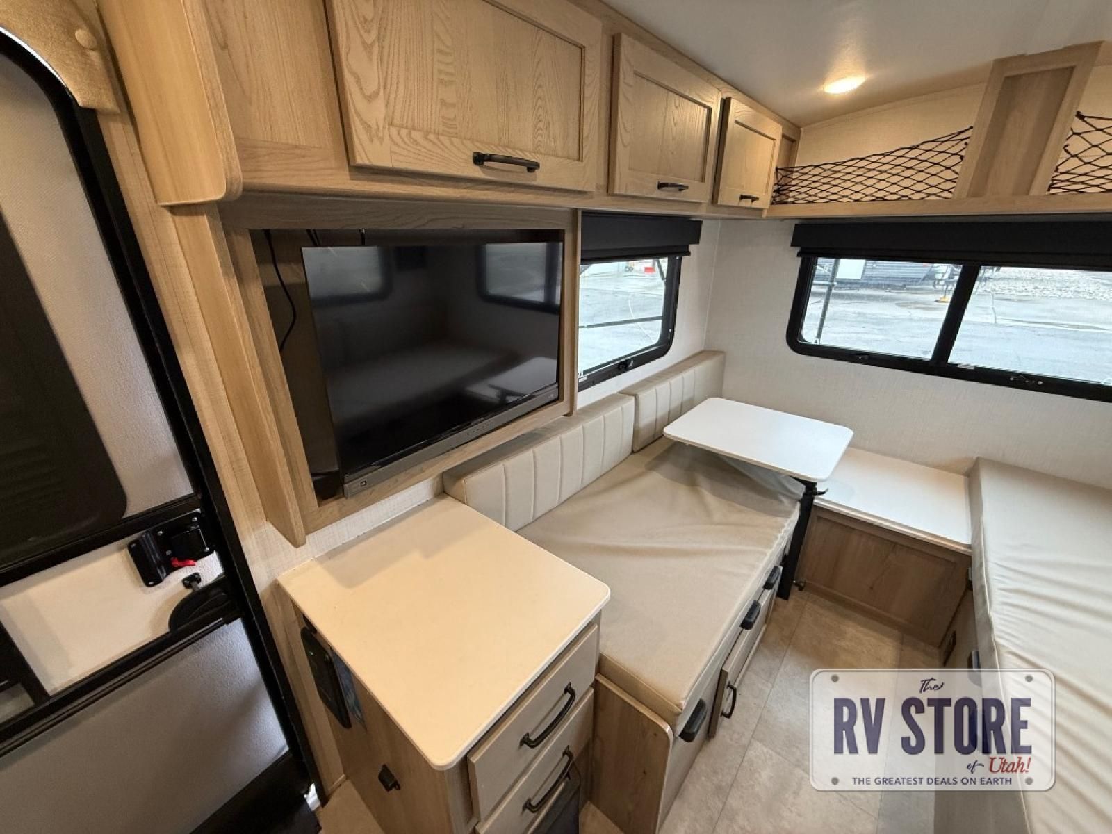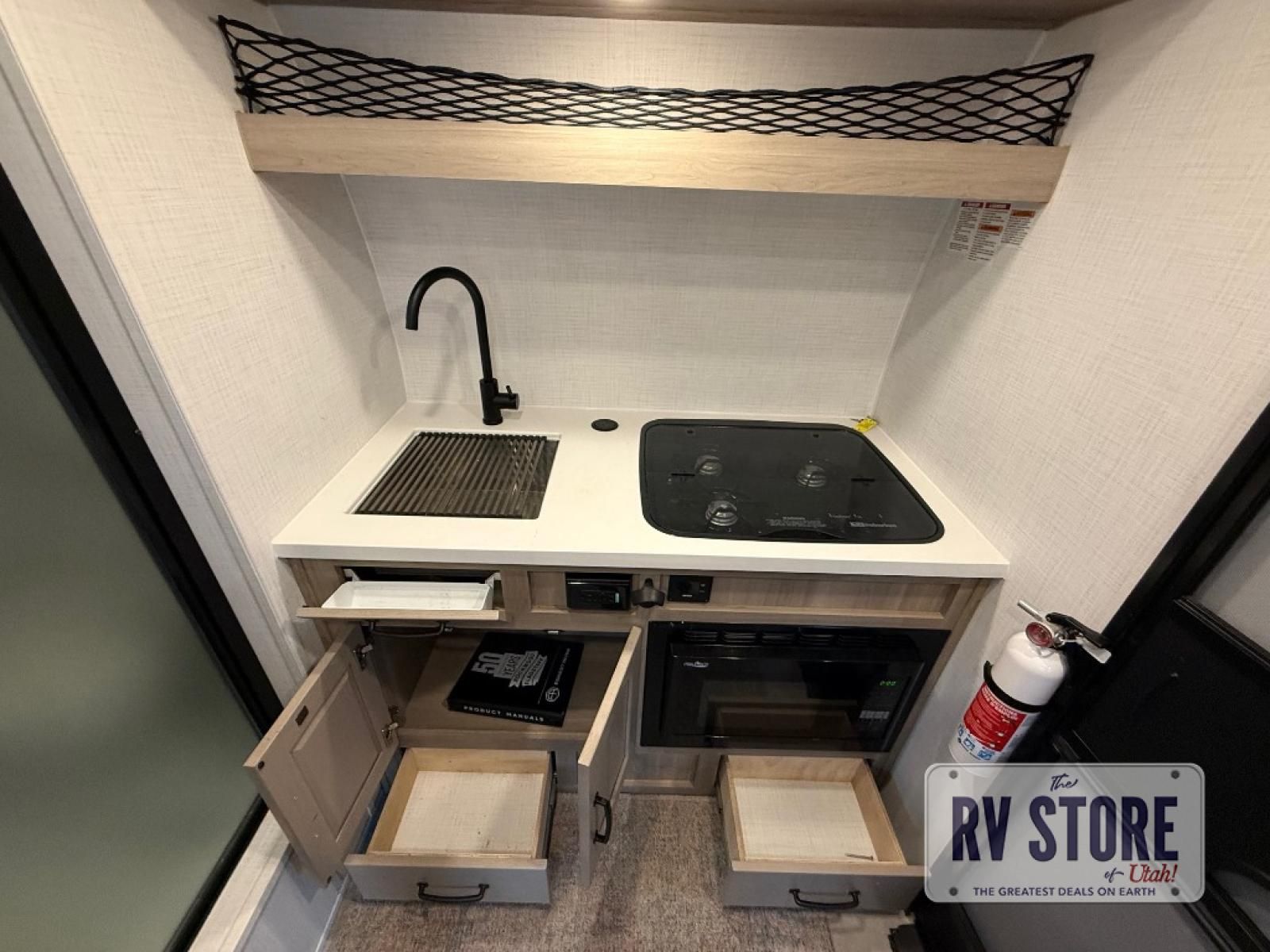 It won't be hard to find comfort in this travel trailer. It may be smaller on size, but it doesn't skim on features. The twin beds convert to a king-size bed for your comfort, and there is even a 32" 12V TV to enjoy in the evenings. The kitchen includes a three burner cooktop, a convection microwave, plus a 12V refrigerator for perishables. You'll find overhead compartments for your valuables and exterior storage for your hiking gear!