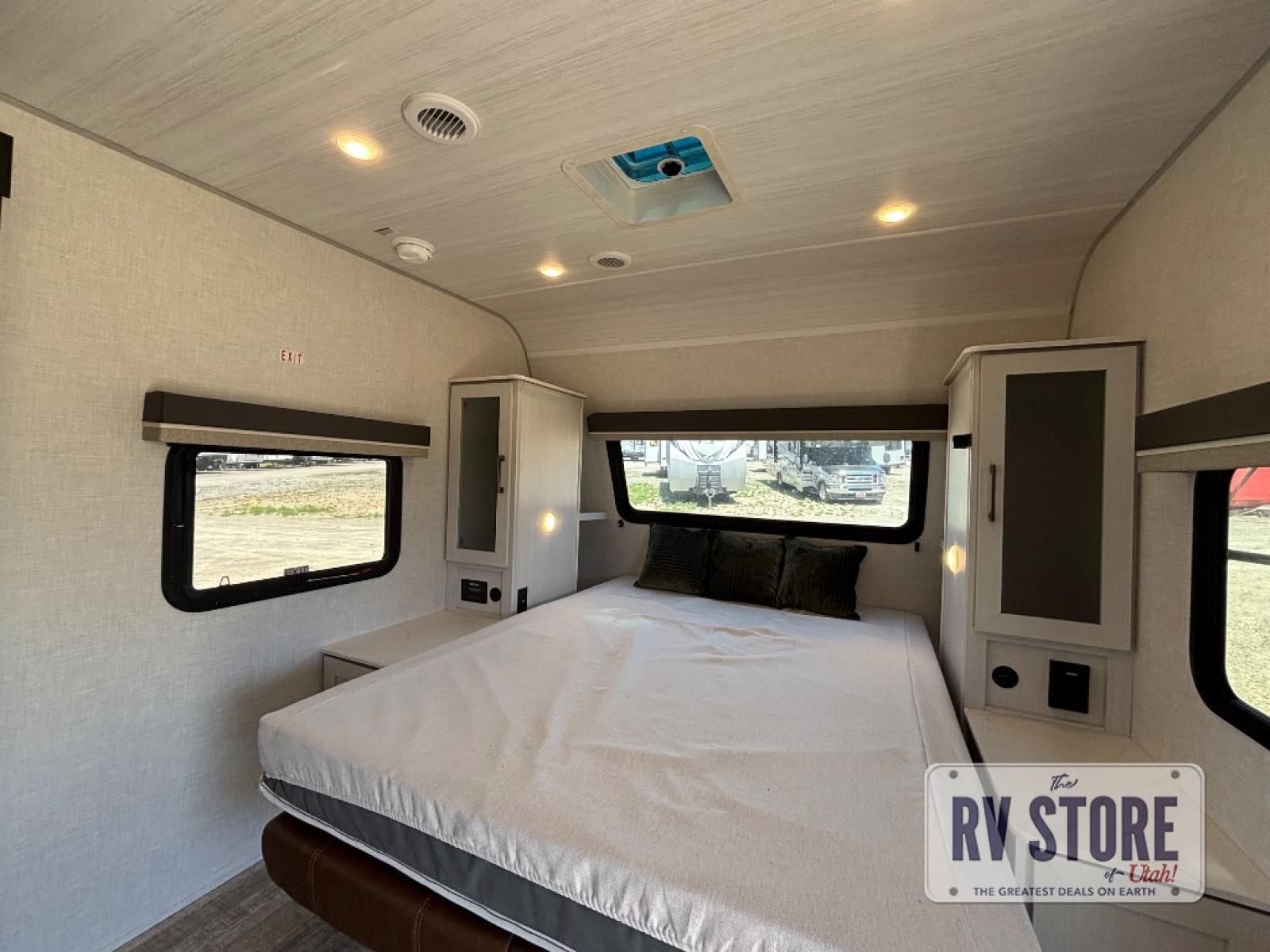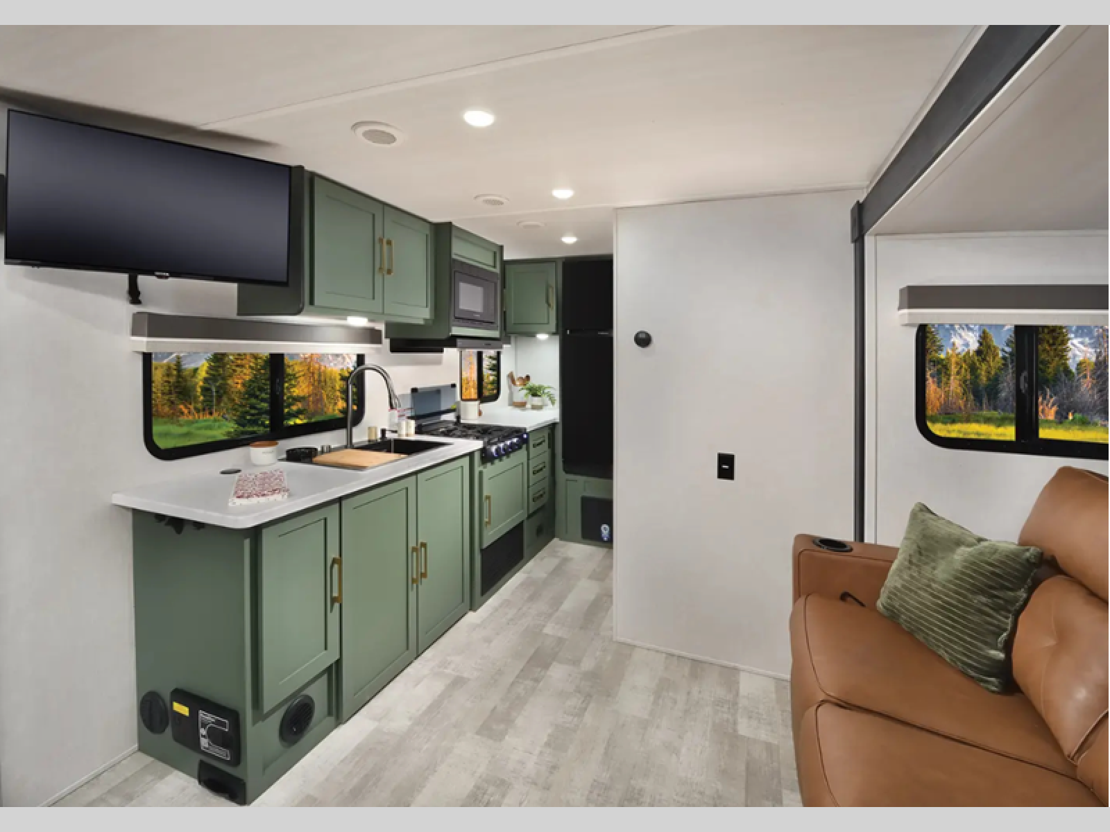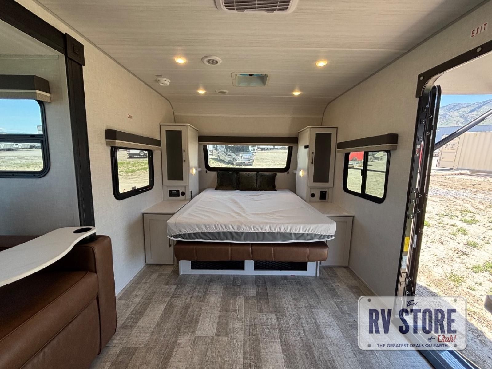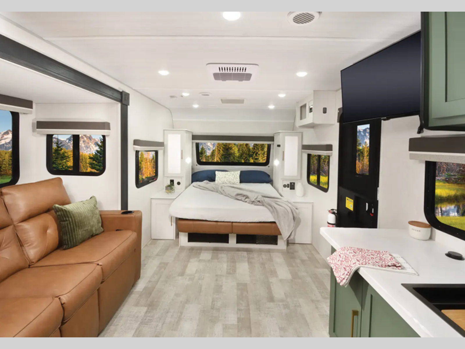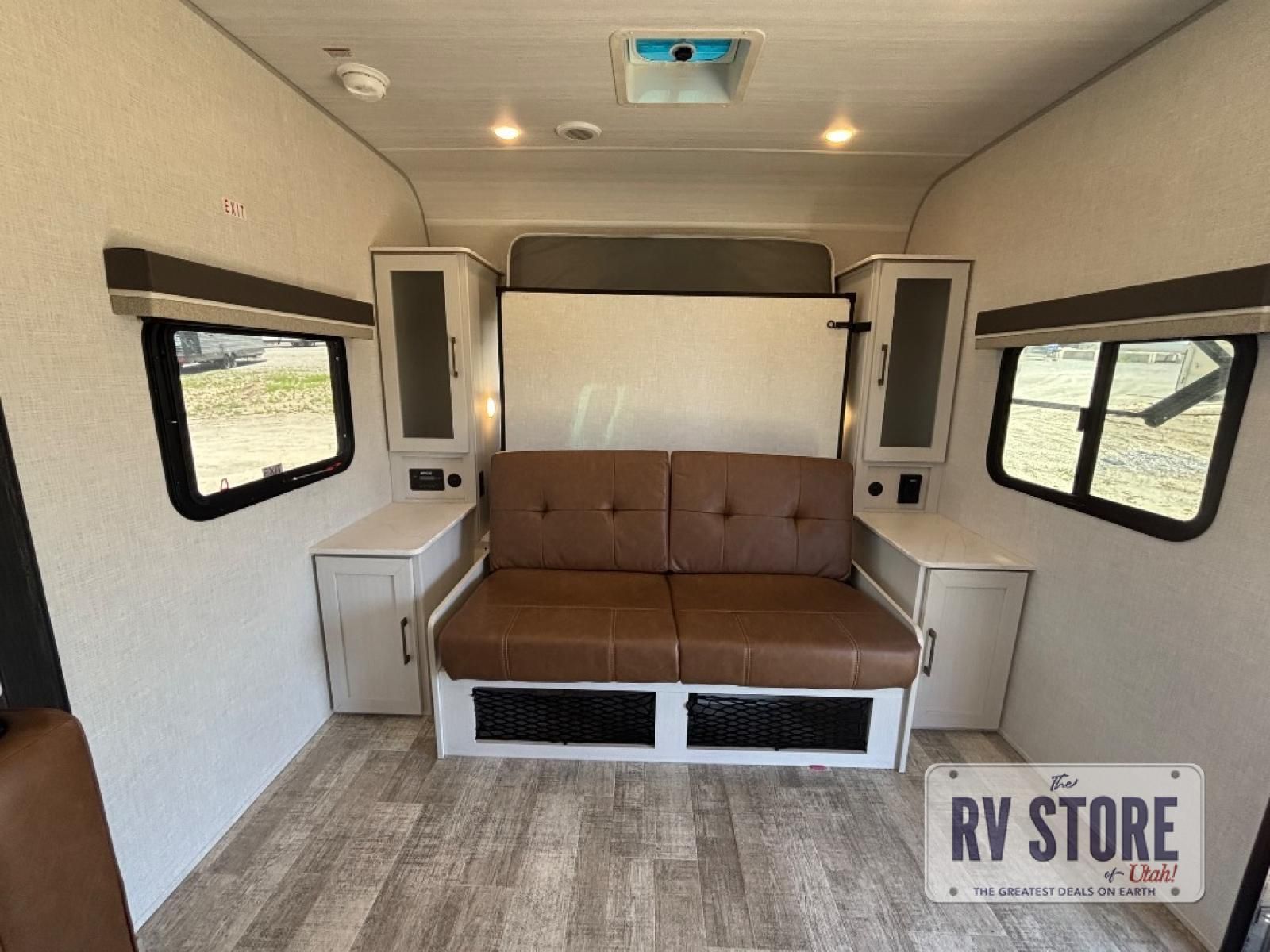 You'll love the versatility and space you'll have in this couple's trailer! The front Murphy bed provides seating and sleeping space, and the wardrobes will help keep your items organized. There is theater seating across from the TV so you can relax each evening, or you may just find yourselves outdoors under the patio awning. A full kitchen lets you cook and store meals while at the campground, and the full bath on board means you won't have to use the camp's facilities! The Beast Mode Package on this model comes with an additional 200W solar panel, a 2,000W inverter, and an independent suspension for better clearance and handling!